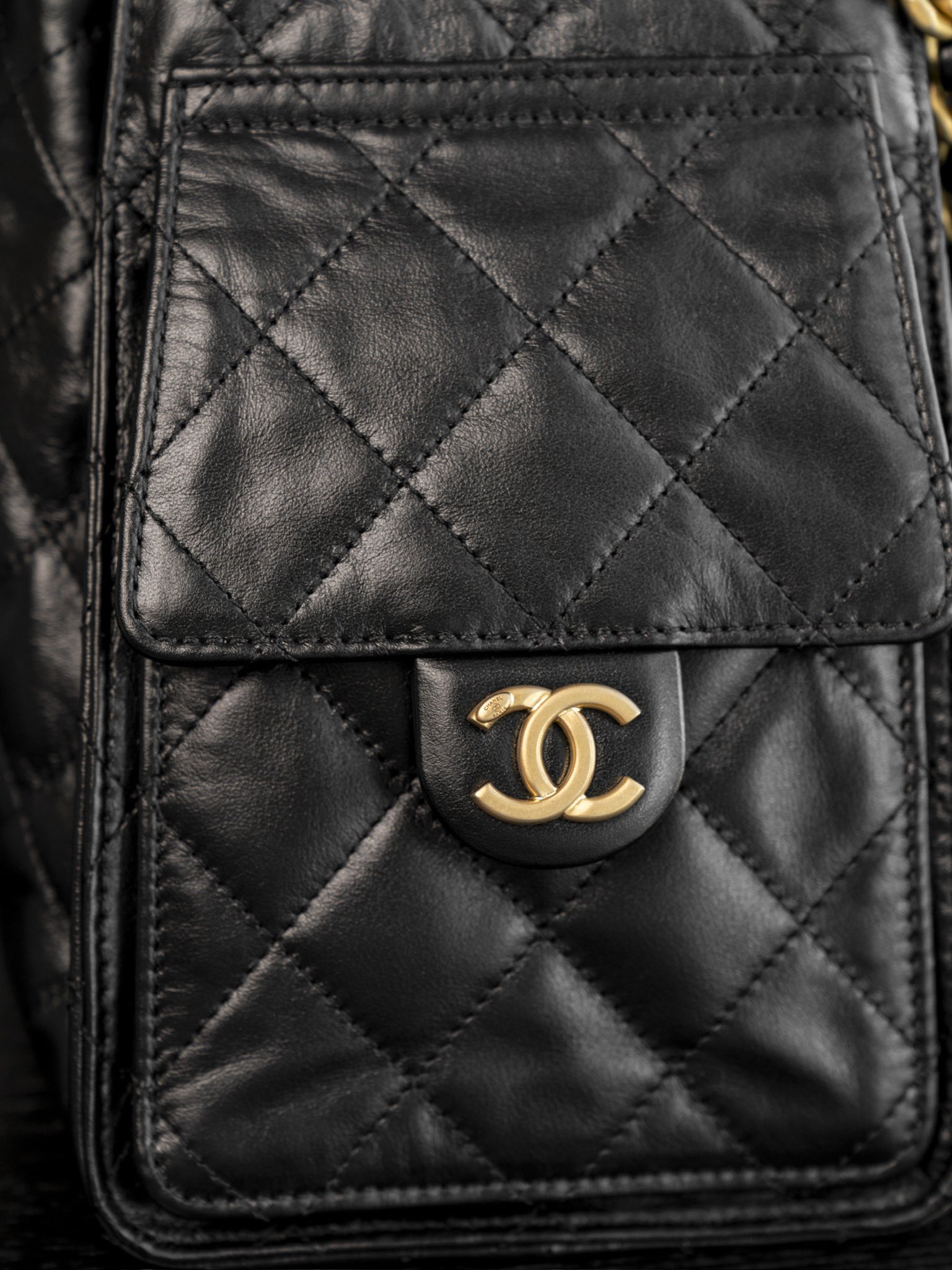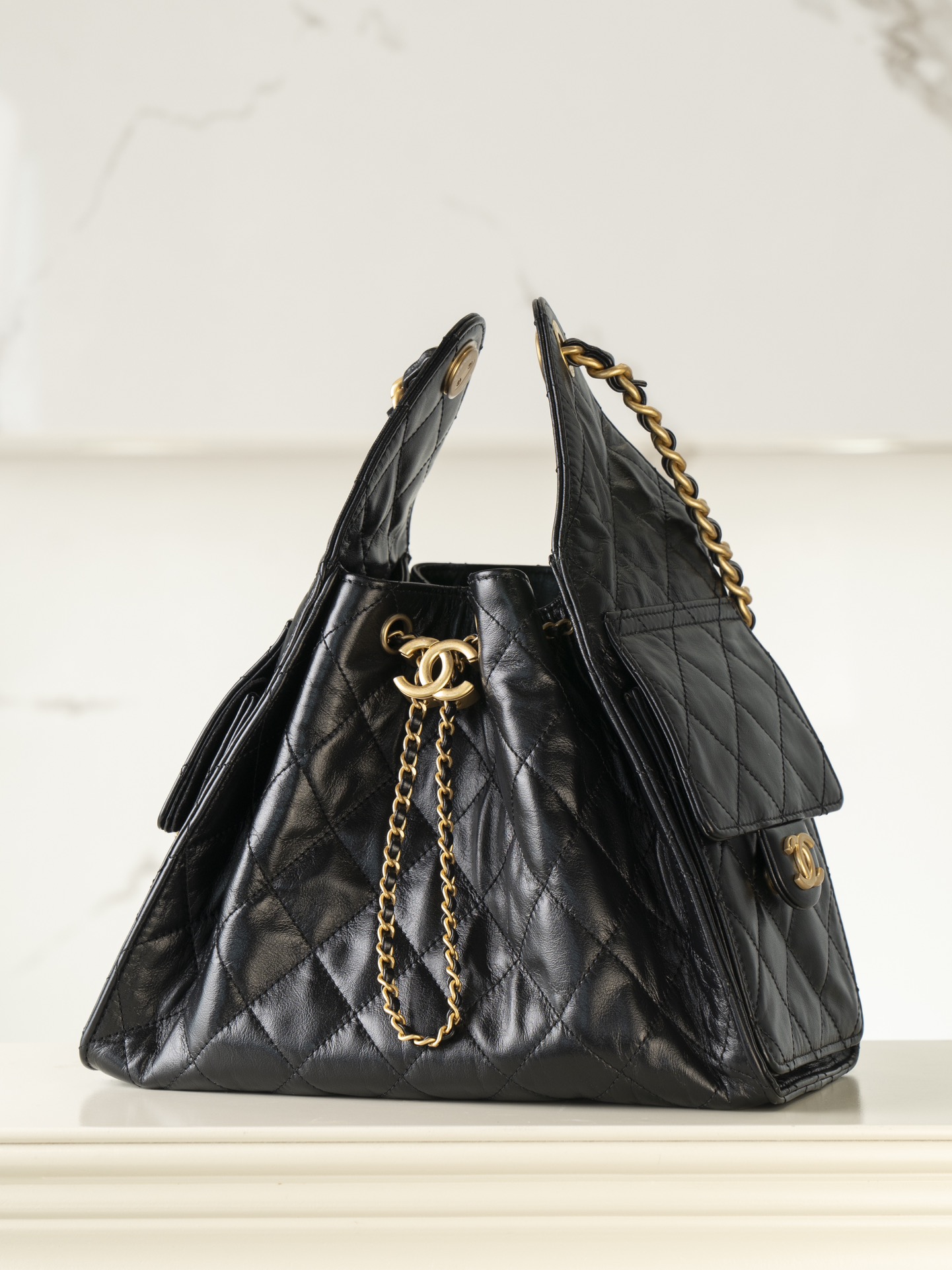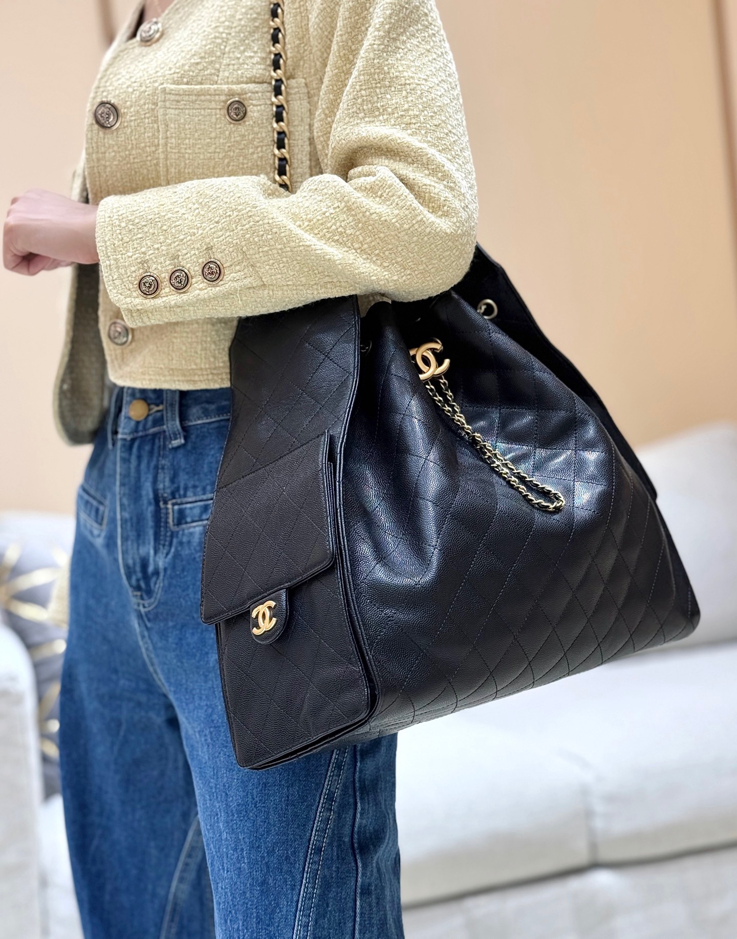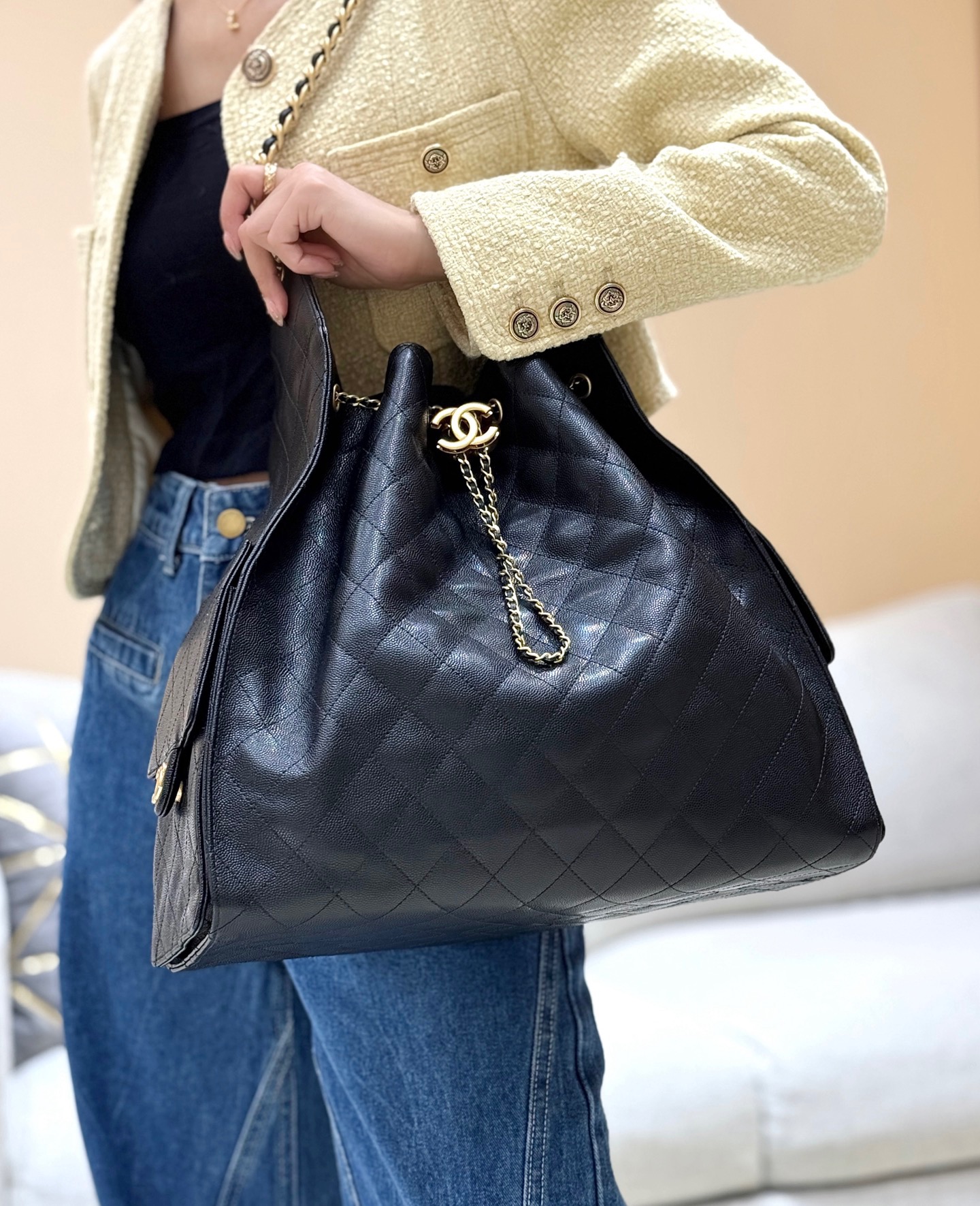 香奈儿 25Bag 25C 经典菱格皮穿链徽标Logo 牛皮材质金色五金 腋下包单肩包 抽绳水桶包 黑金🖤 小号(LZ*MM)