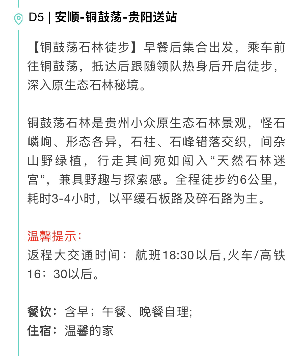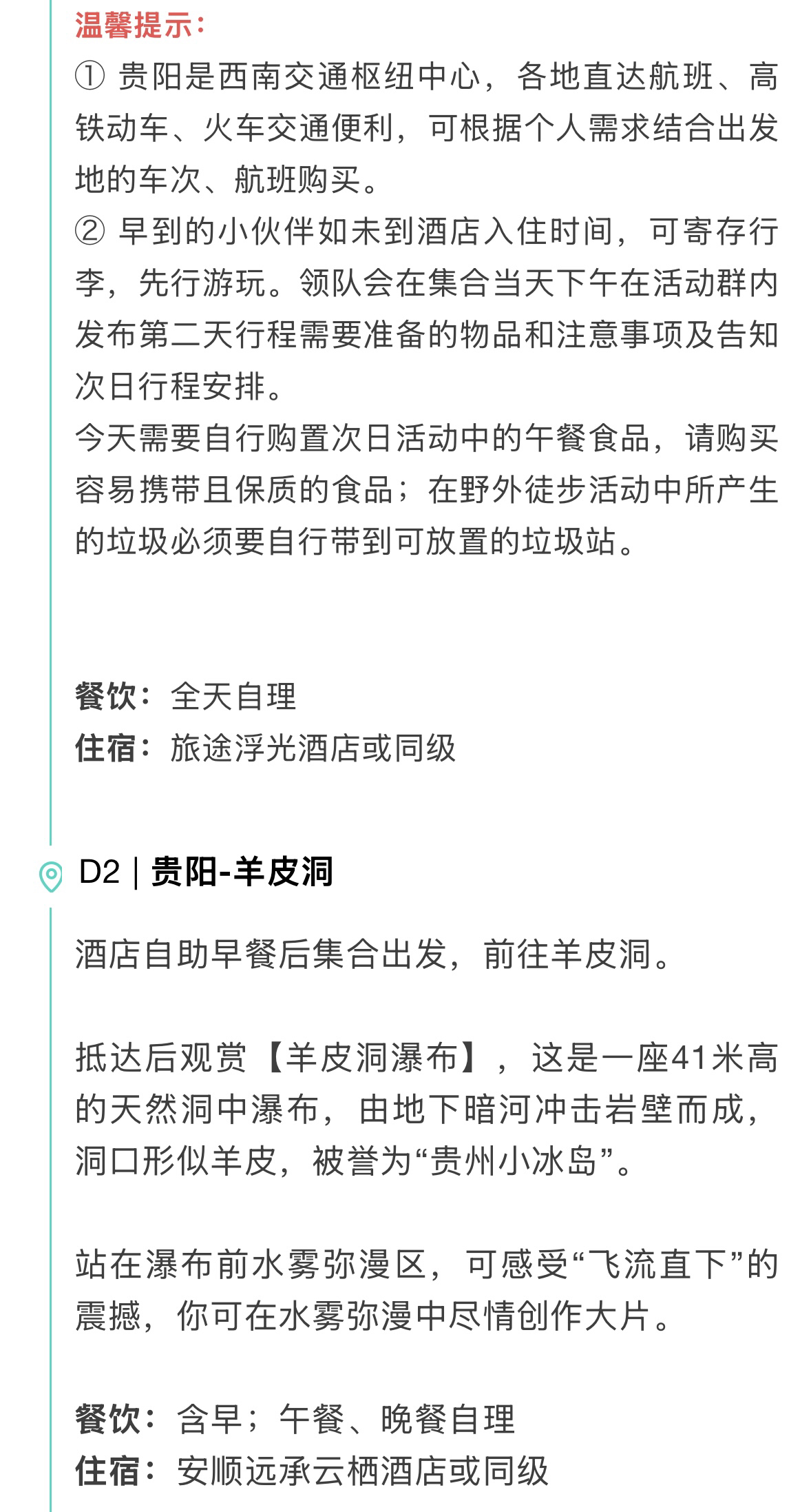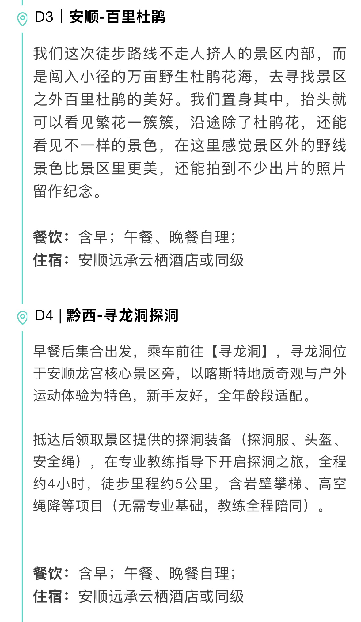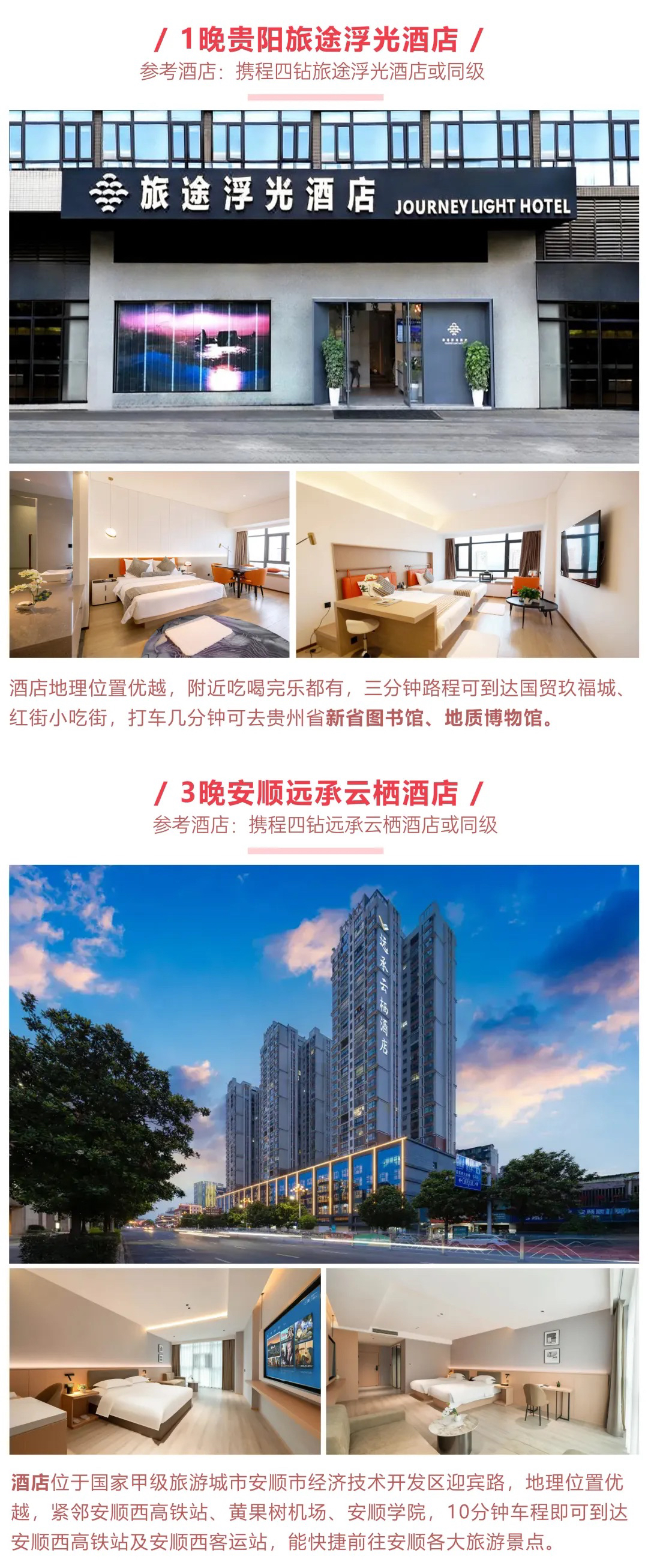 【住宿】全程4晚4钻酒店(酒店默认安排标间双床房,如需加床或升级房型,费用自理)D1贵阳旅途浮光酒店;D2、D3、D4安顺远承云栖酒店;