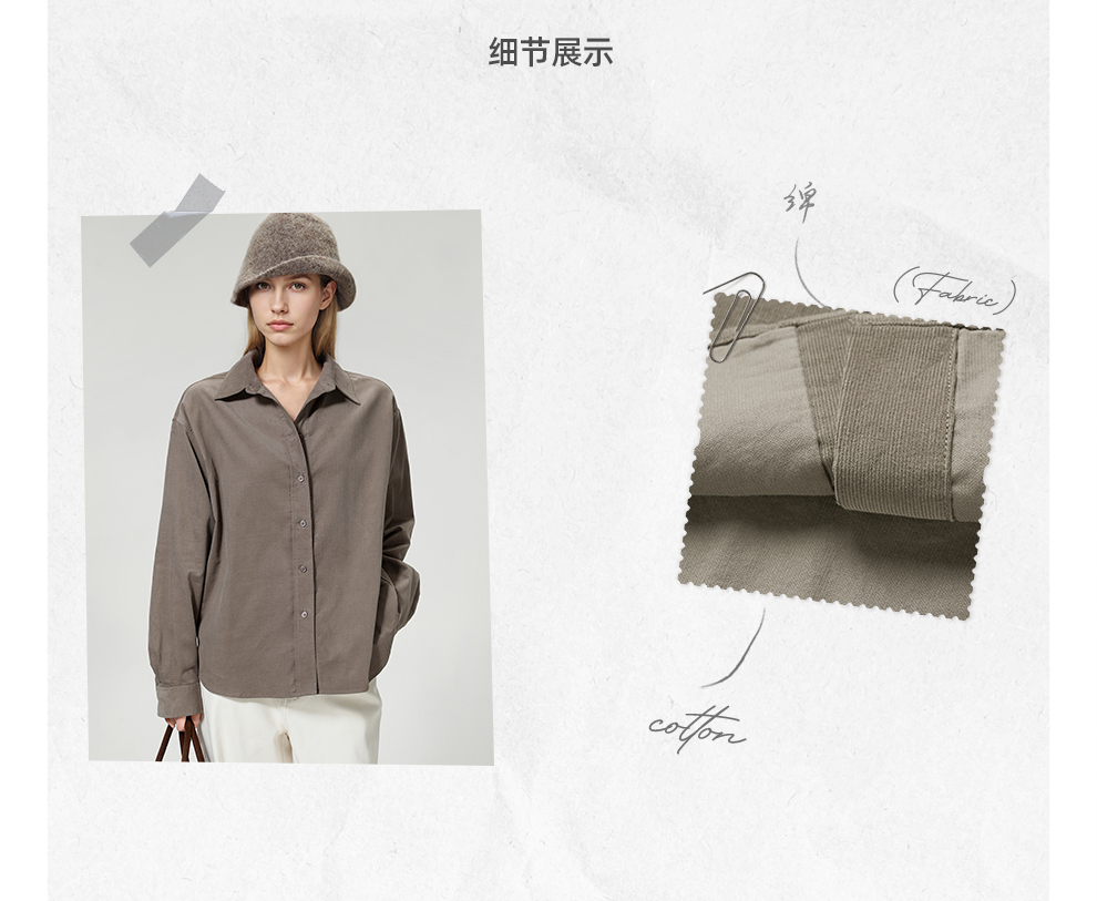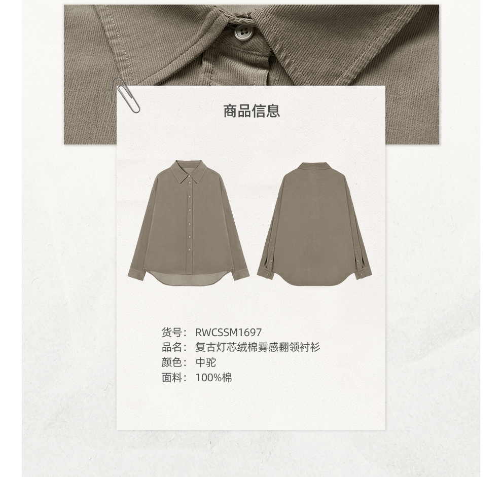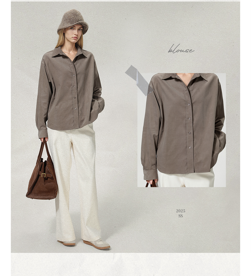 ROMI STUDIO“松弛复古”100%棉灯芯绒雾感廓形翻领衬衣 RWCSSM1697
