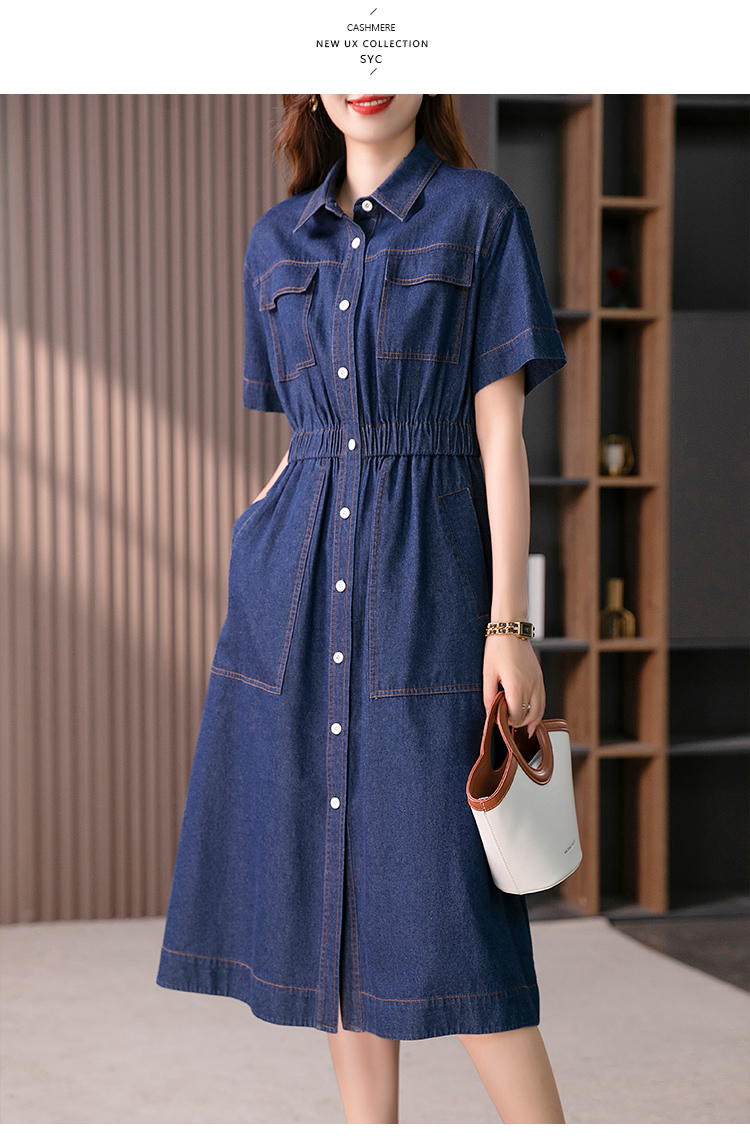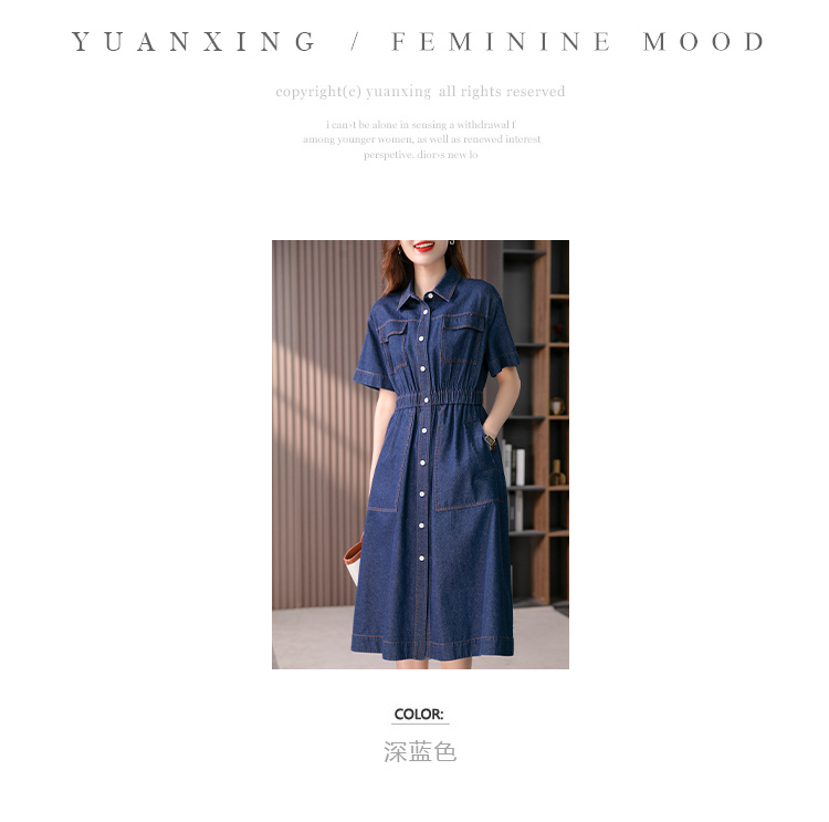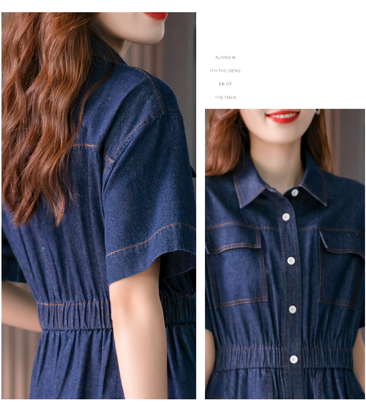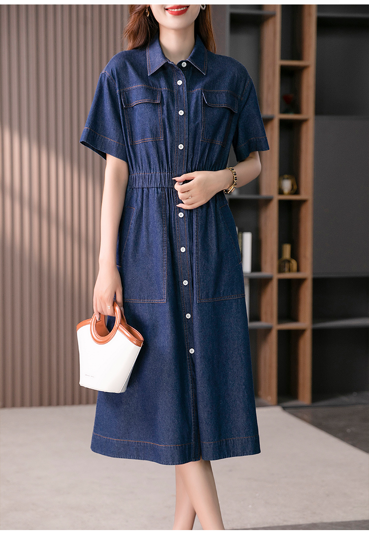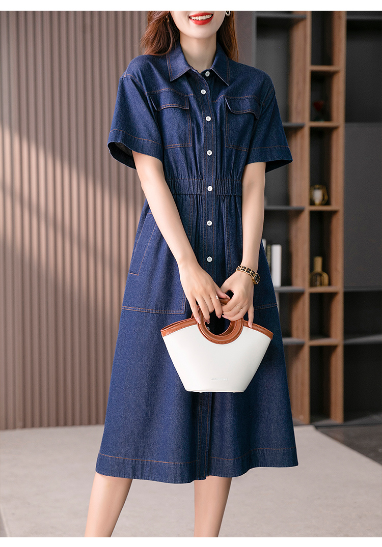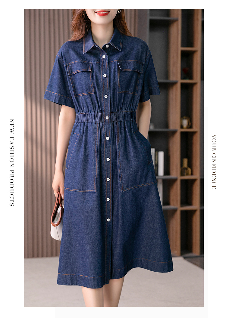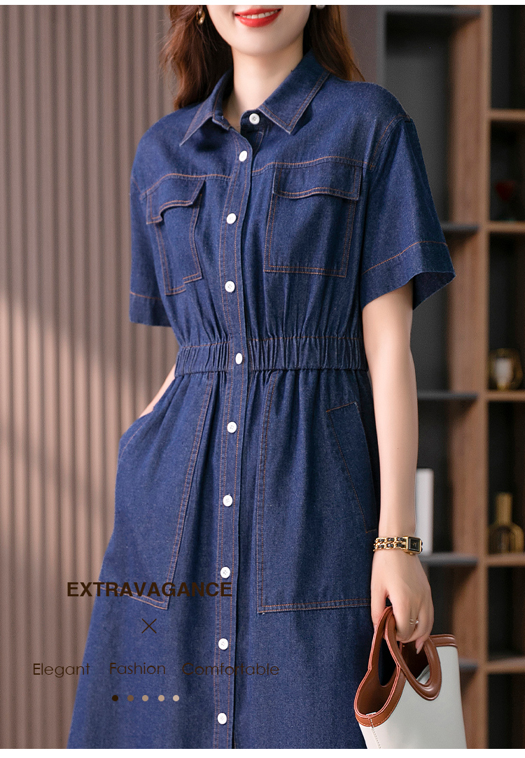 89307原形松紧收腰牛仔连衣裙女2024春夏季新款单排扣显瘦衬衫长裙子