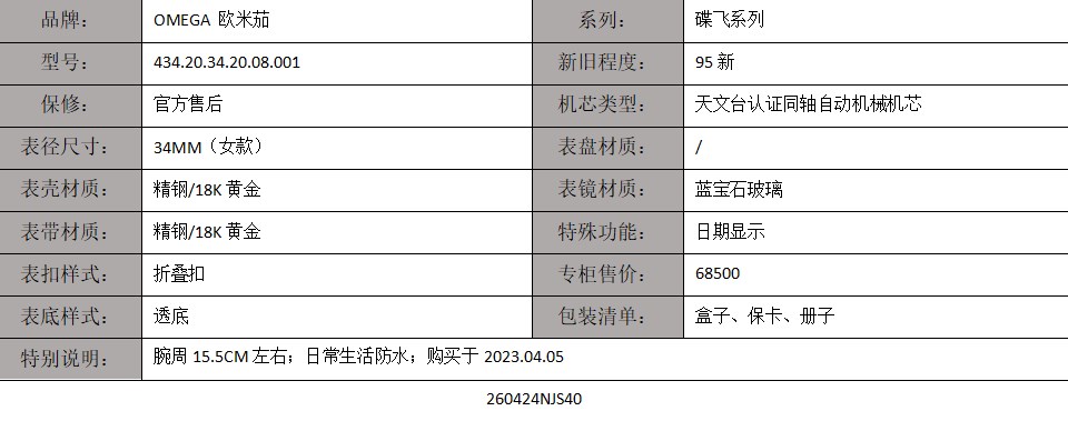 【95新正品】OMEGA 欧米茄碟飞系列434.20.34.20.08.001自动机械34MM女表260424NJS40