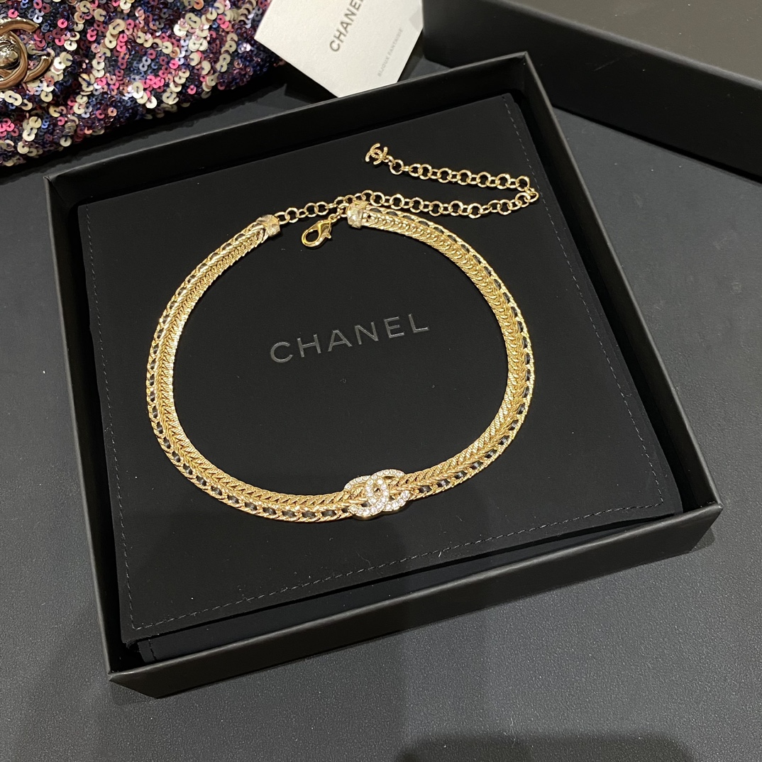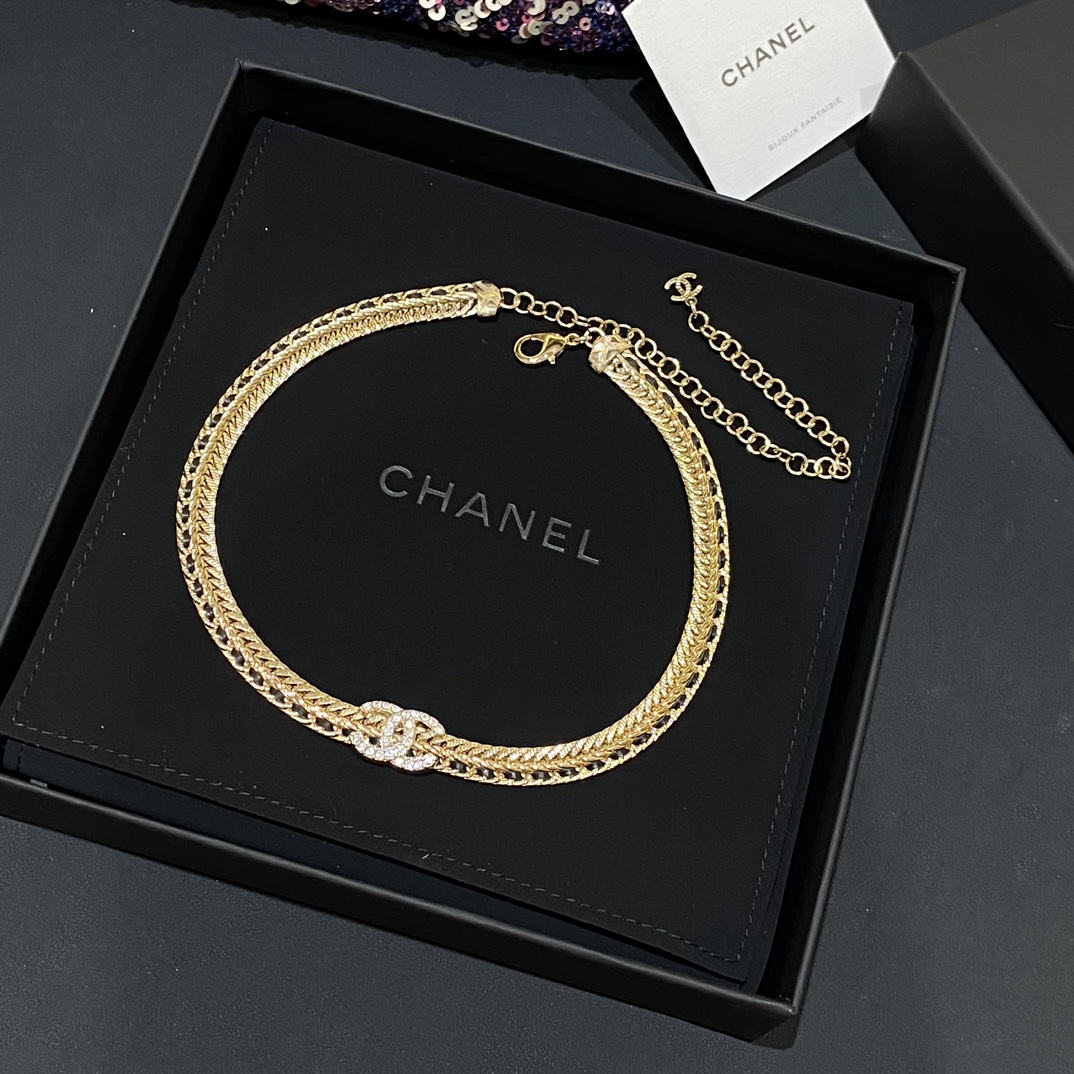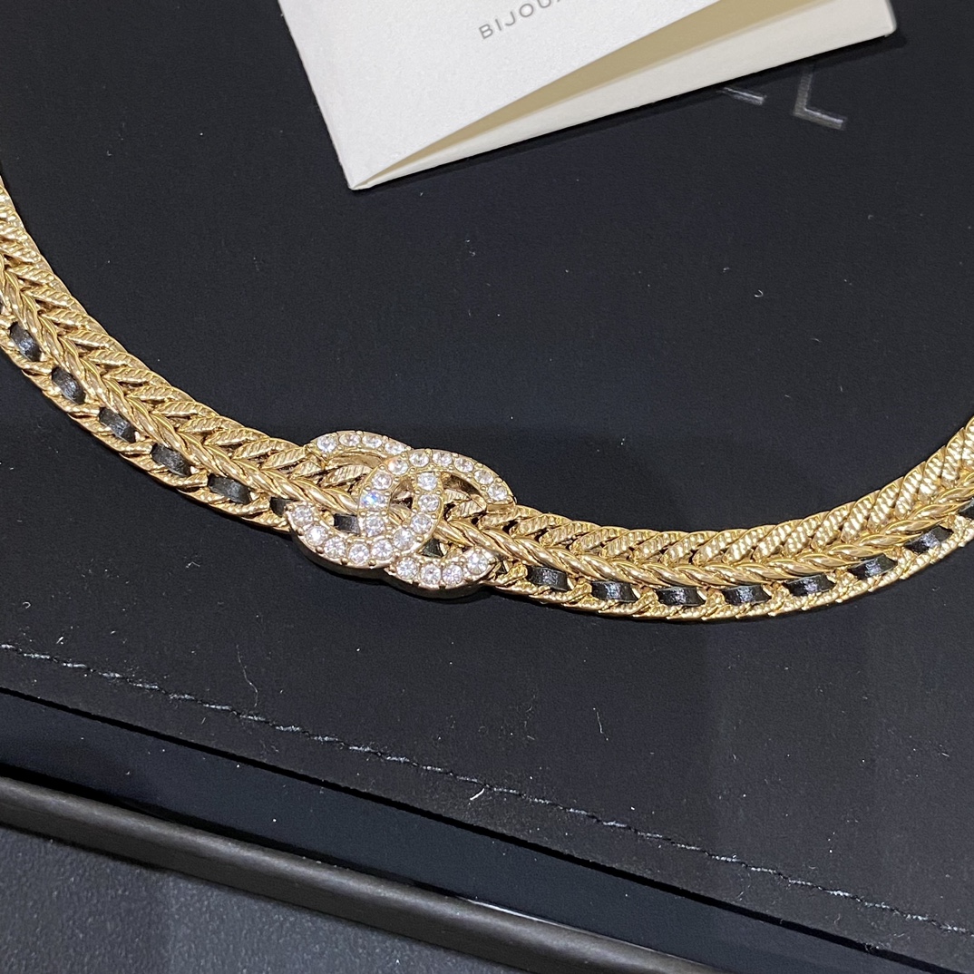 现货 水钻C黑色穿皮链条项链