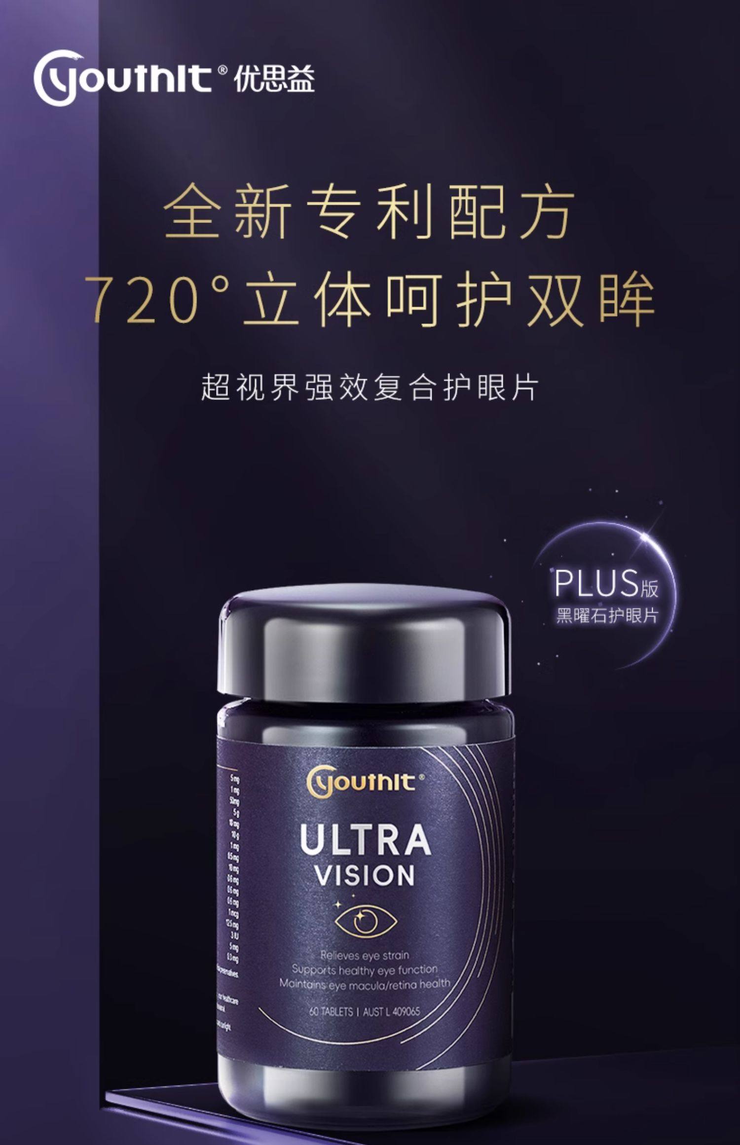 澳洲Youthit优思益超视界复合高端黑曜石护眼片叶黄素60粒 2瓶