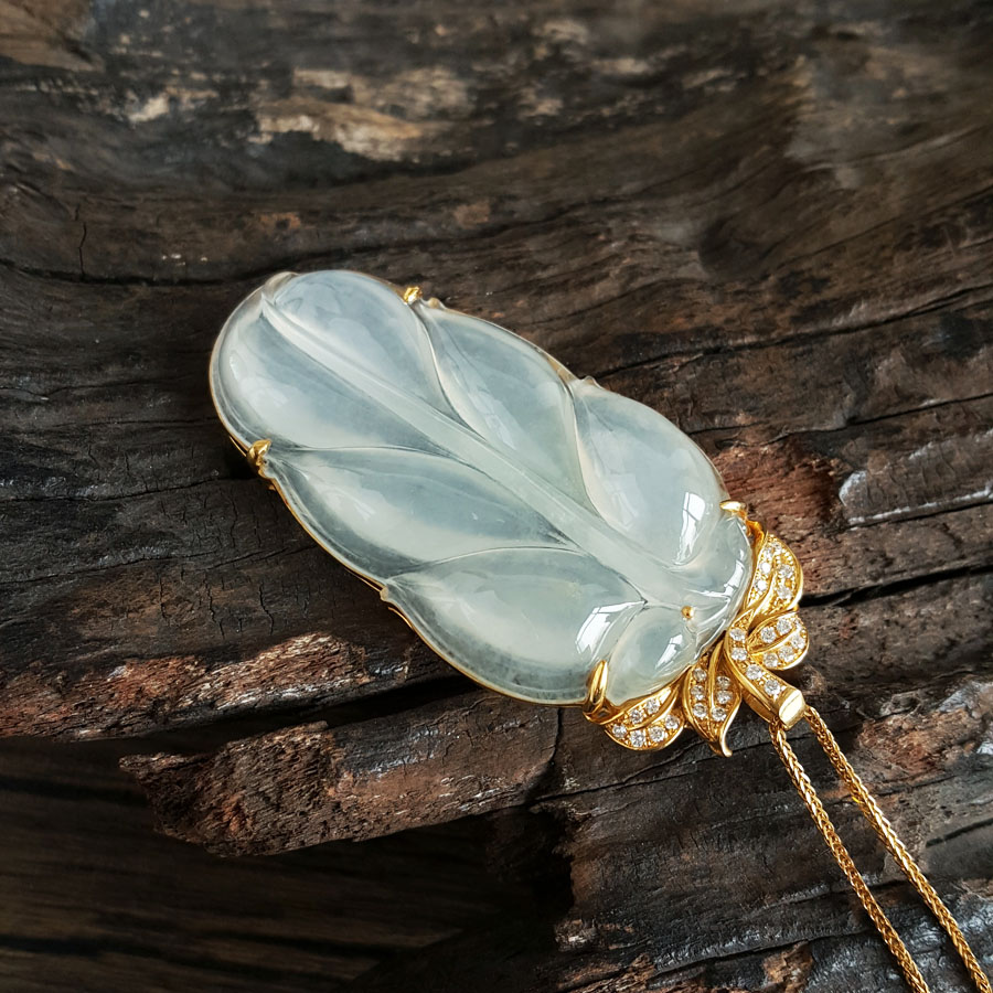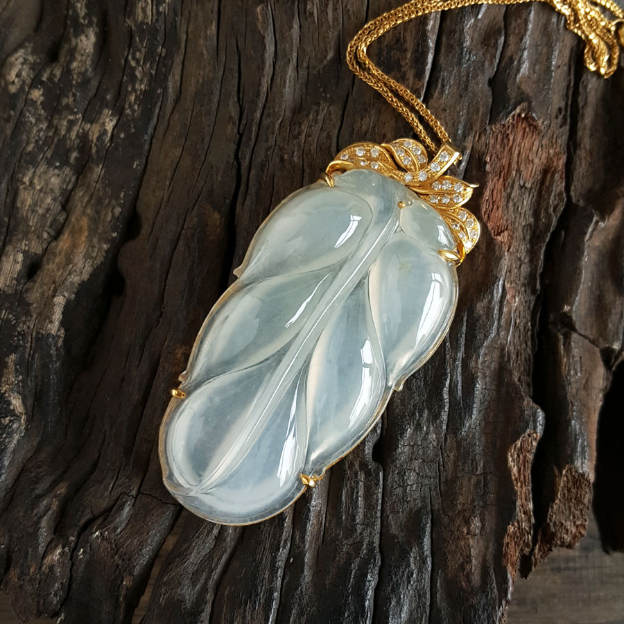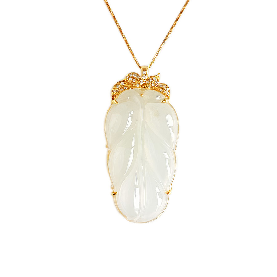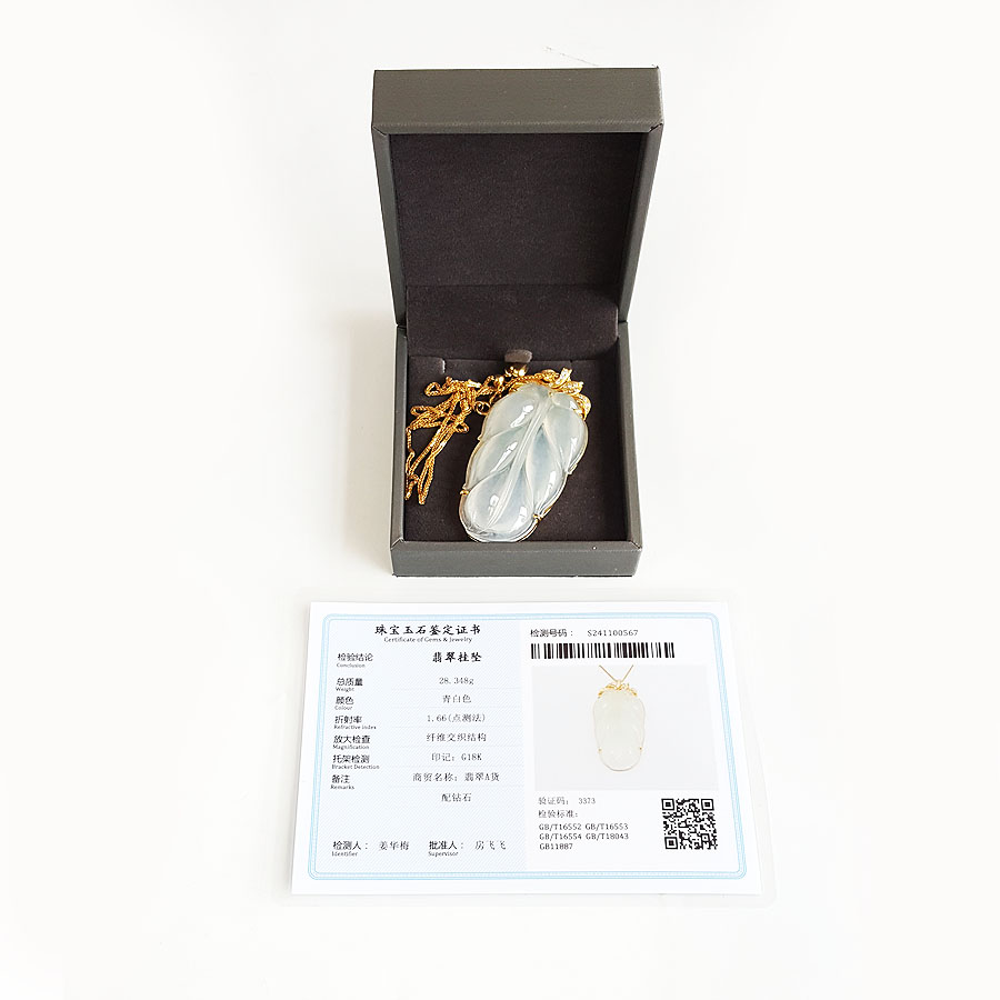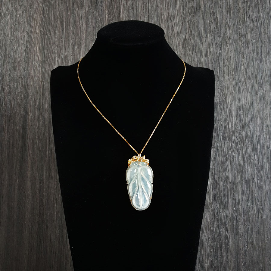 名称 | AU750收藏级黄金镶钻镶天然冰种叶子翡翠(金枝玉叶)吊坠项链 |