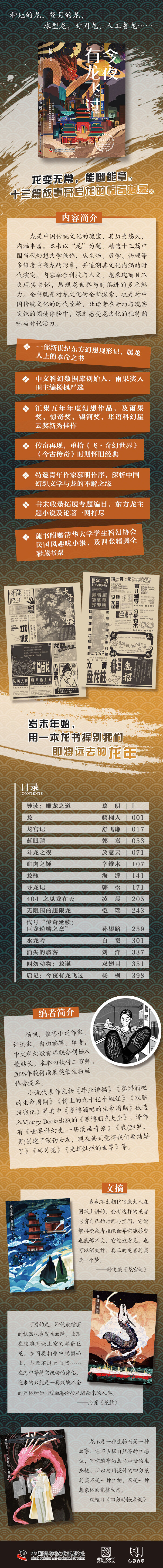 当下,地龙文化是中国传统文化的瑰宝,其历史悠久,内涵丰富。本书以“龙”为题,精选十三篇中国当代幻想文学佳作,从生物、数学、物理等多维度重塑龙的形象,并追溯其文化内涵的时代演变。内容融合科技与人文,想象瑰丽且不失现实关怀,展现龙世界与时俱进的多元魅力。特邀青年科幻作家慕明作序,深析中国幻想文学与龙的不解之缘。全书既是对龙文化的全新探索,也是对中国传统文化的时代诠释,让读者在奇幻与现实交织的阅读体验中,深刻感受龙文化的独特韵味与时代活力。
