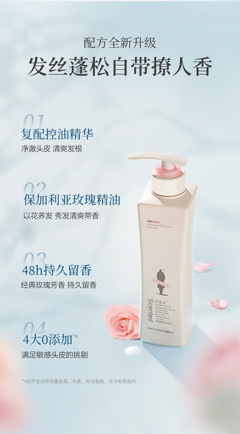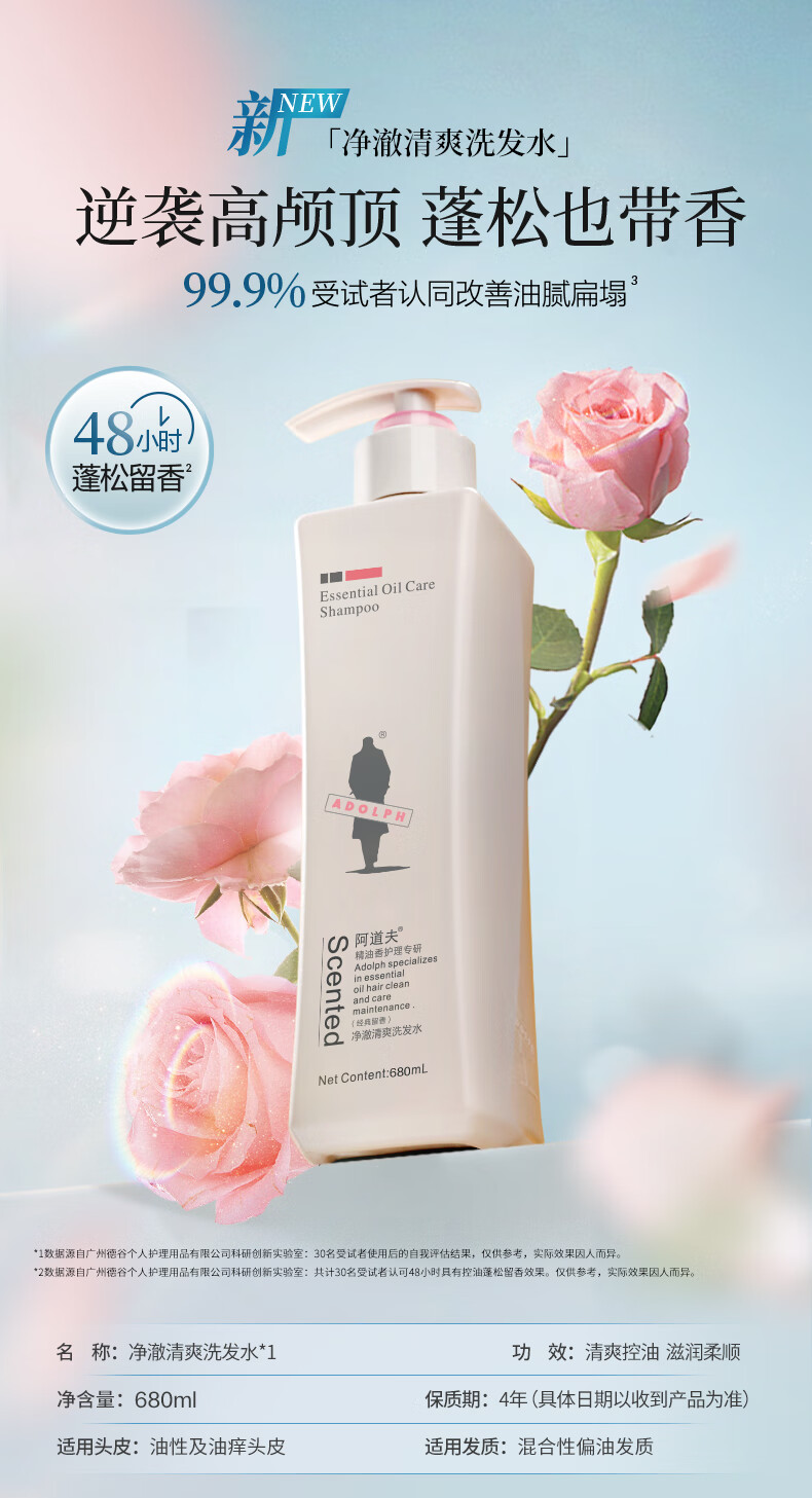 阿道夫精油洗发水680ml(净澈清爽/轻柔丝滑/滋润修护)