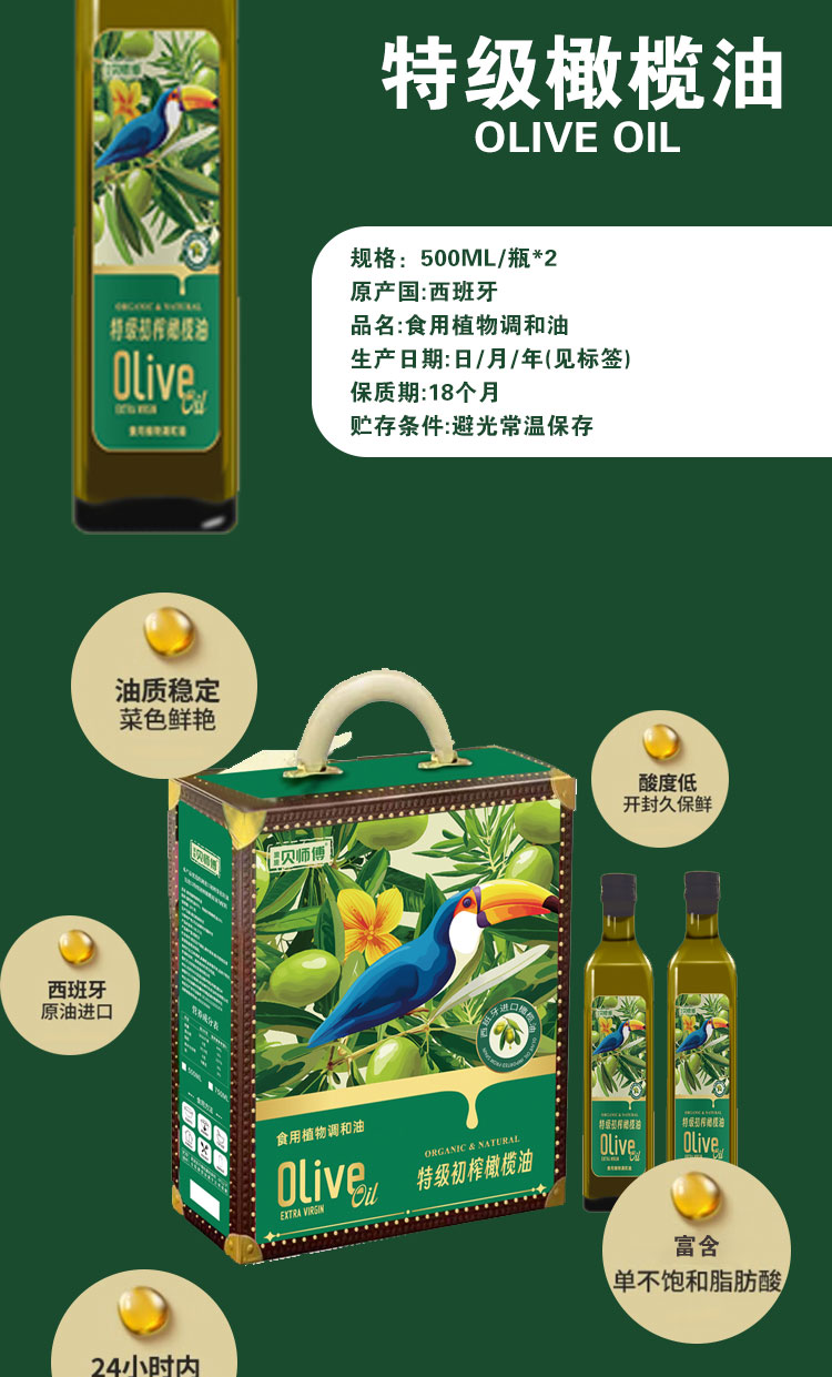 贝师傅特级初榨橄榄油礼盒500ml/瓶*2瓶