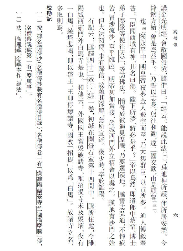 摄摩腾〔一〕,本中天竺人。善风仪,解大小乘经,常游化为任。昔经往天竺附庸小国,讲《金光明经》,会敌国侵境,腾惟曰:;经云:能说此法〔二〕,为地神所护,使所居安乐。今锋镝方始,曾是为益乎?乃誓以忘身,躬往和劝,遂二国交欢,由是显誉〔三〕。