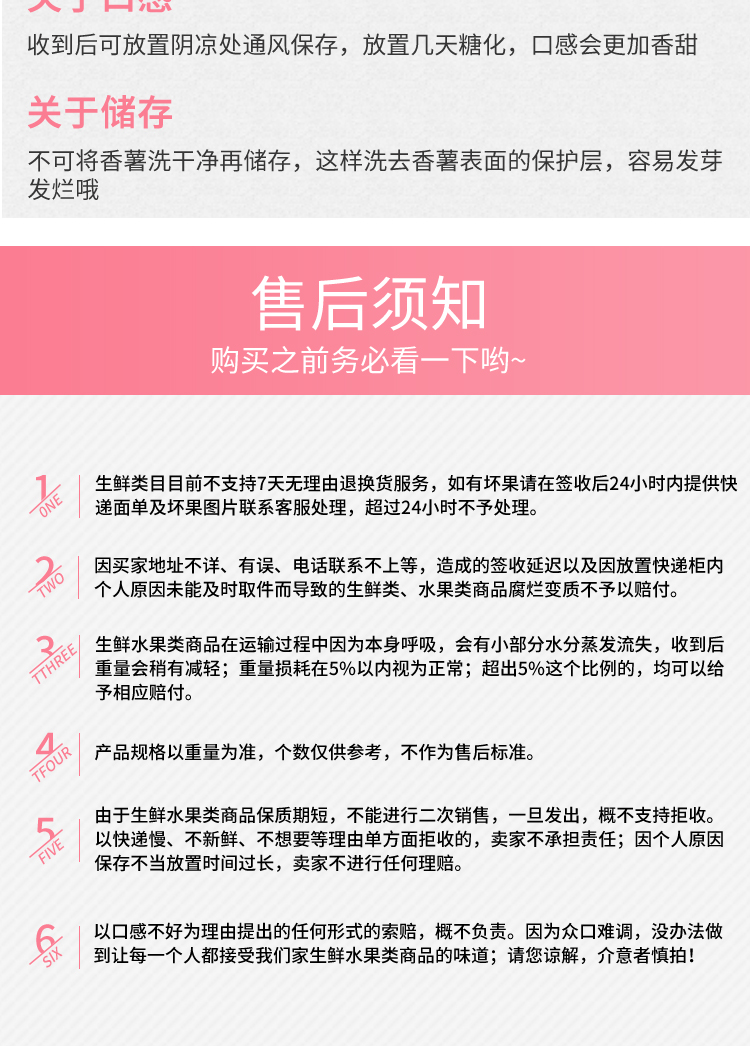 2、收到快递有质量问题请24小时内联系在线客服,坏果包赔,生鲜水果因电话地址错误,拒收等导致的损失无法售后,请理解。
