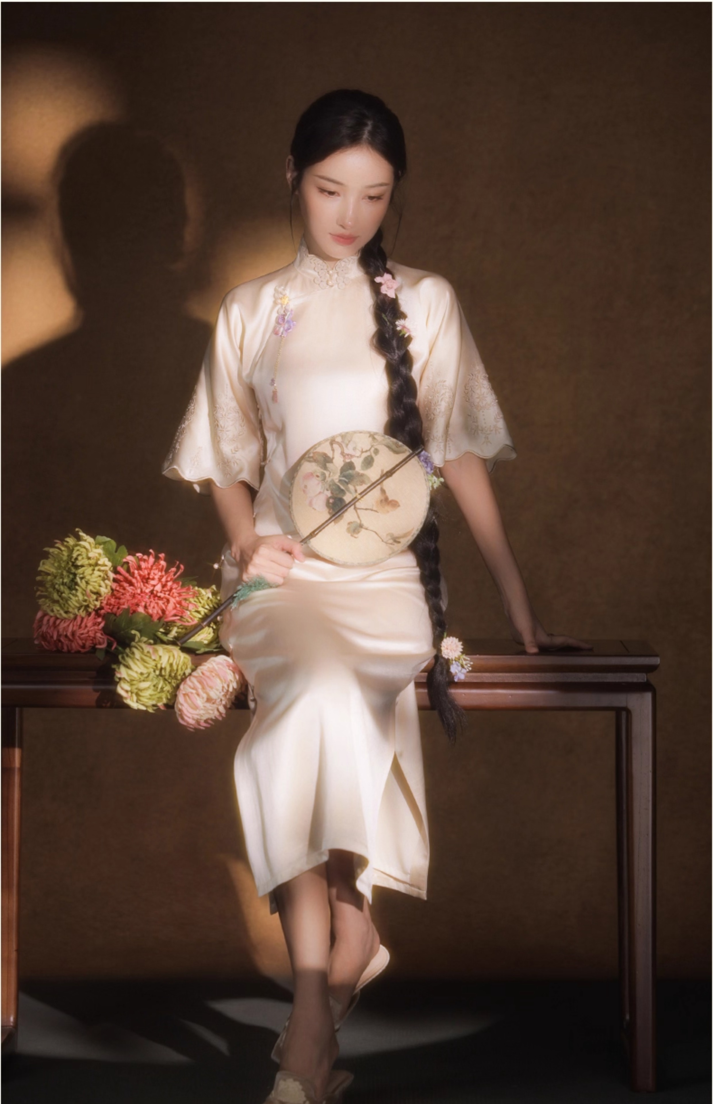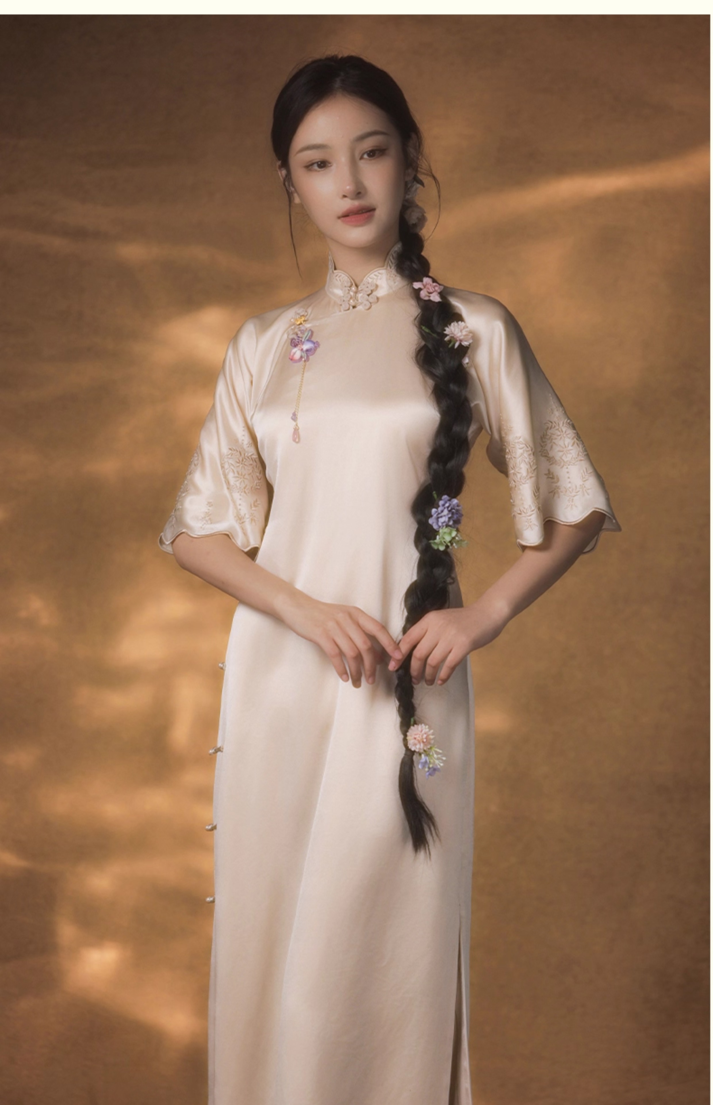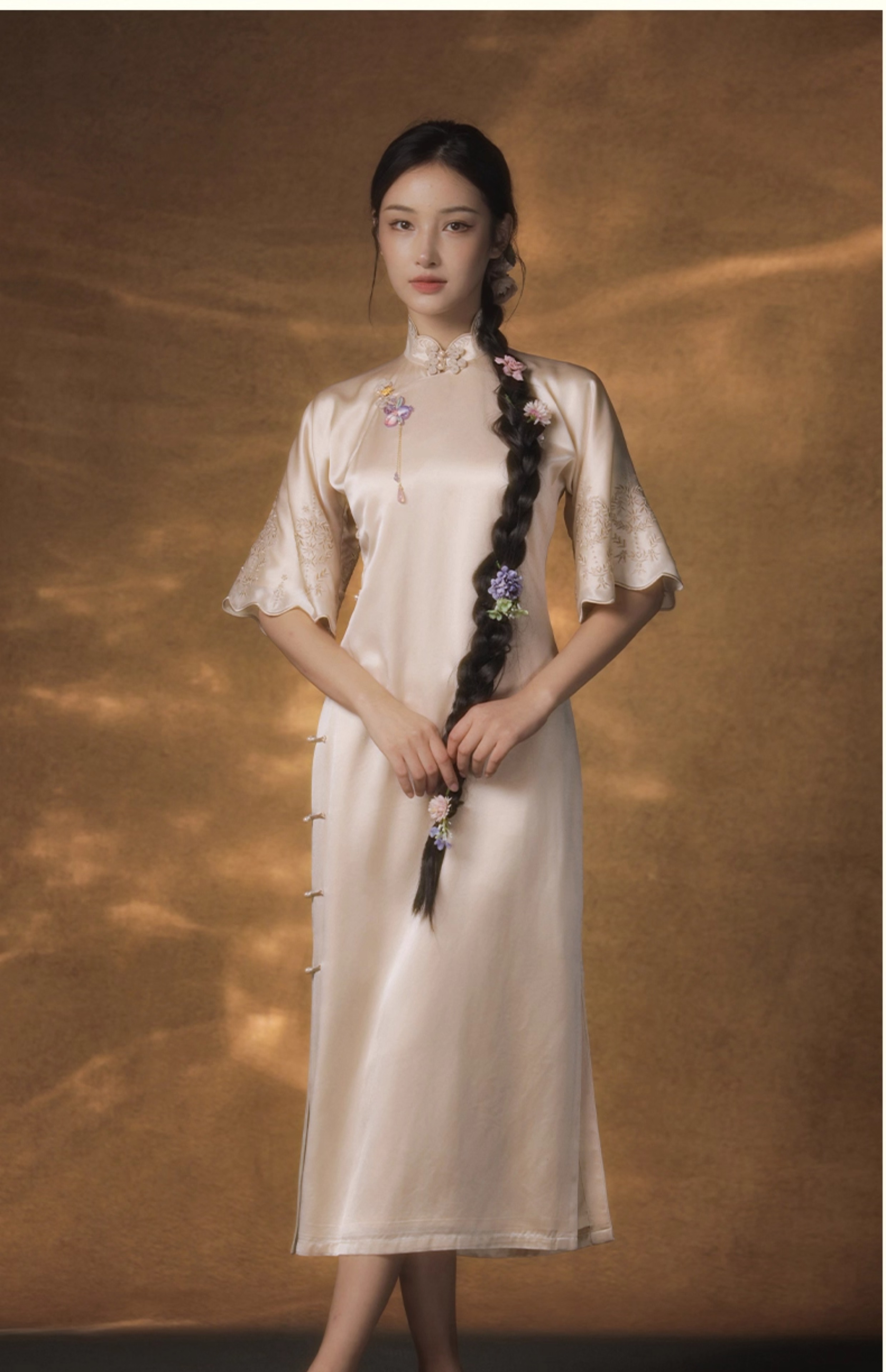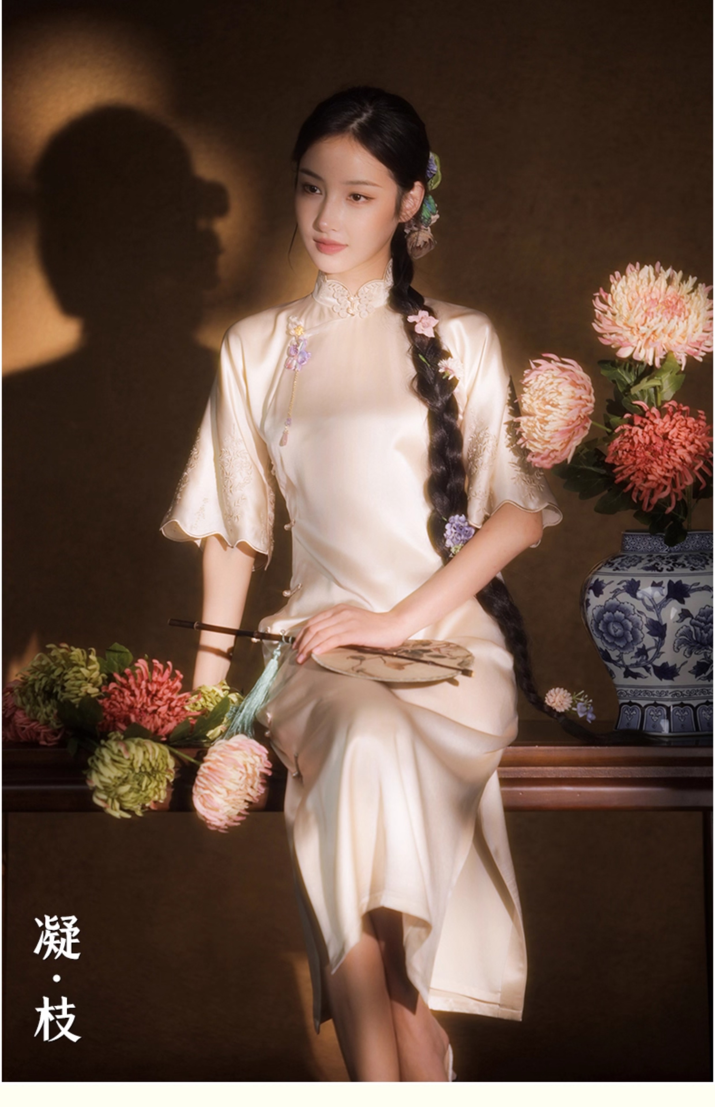 逸红颜凝枝2025秋新款略宽松版重工醋酸团花刺绣倒大袖中袖旗袍女