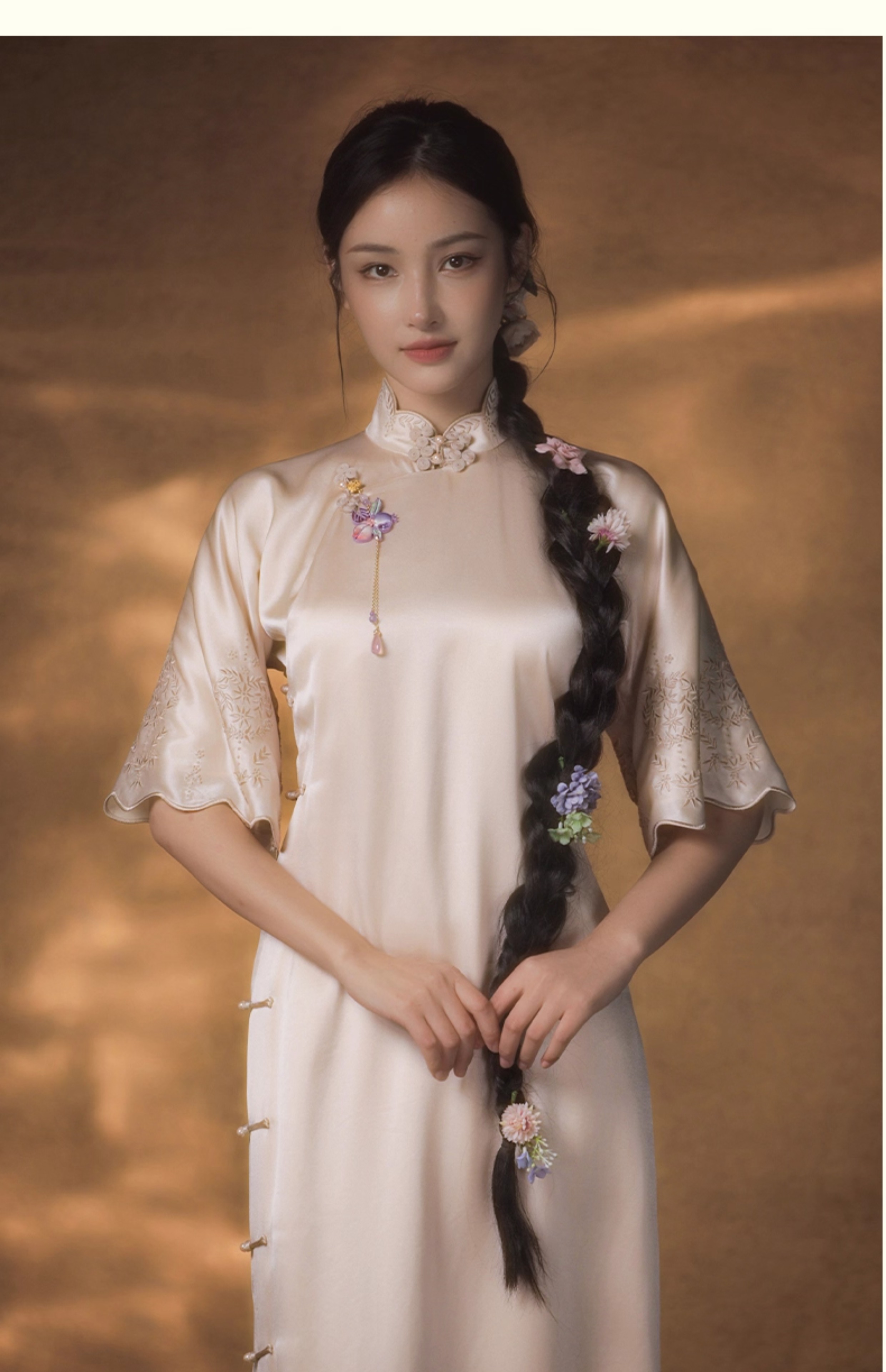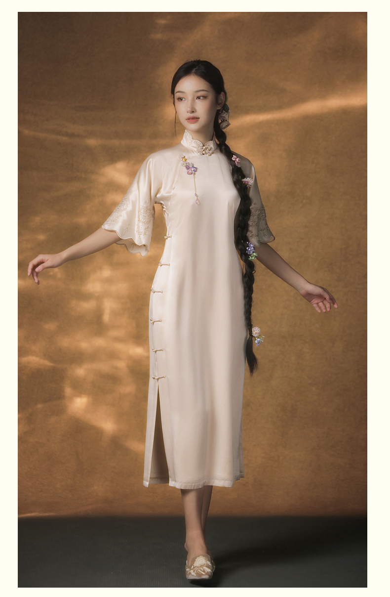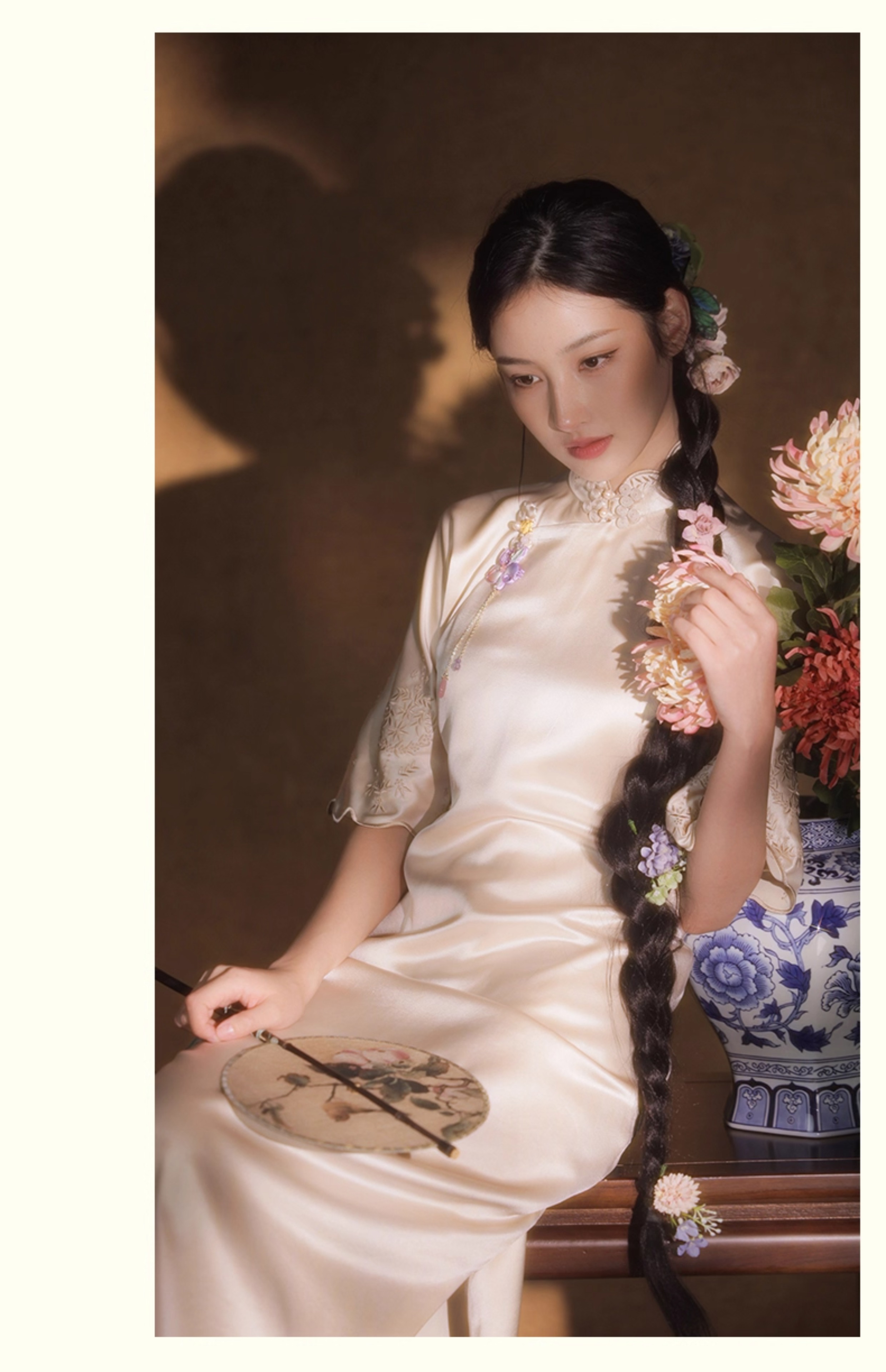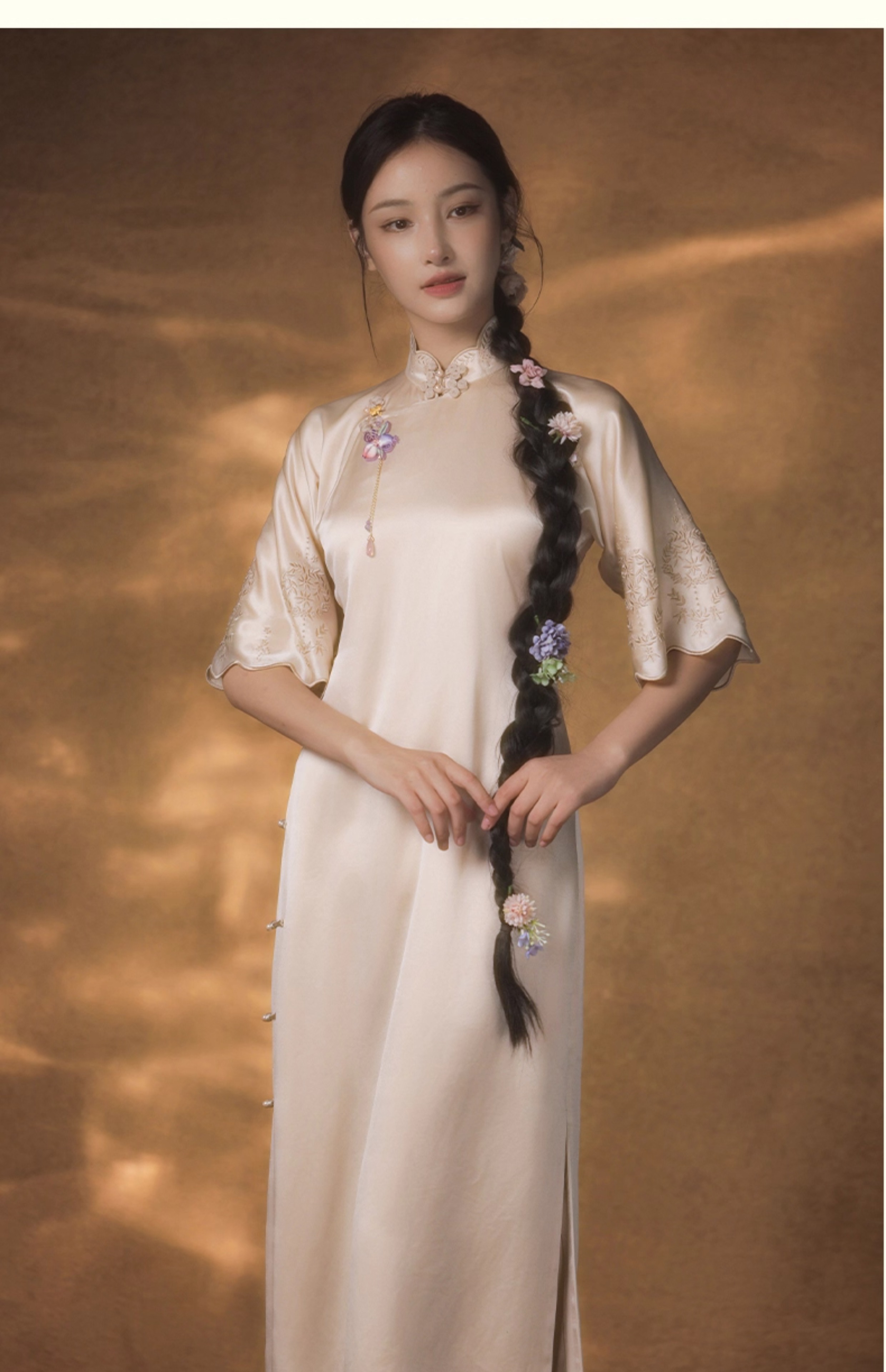 逸红颜凝枝2025秋新款略宽松版重工醋酸团花刺绣倒大袖中袖旗袍女