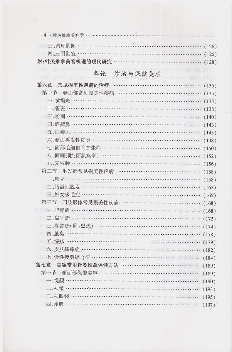 本书分为总论和各论两部分,总论为“基础知识”,概述针灸推拿美容的含义、特点及其发展,论述中医经络系统的组成、基本规律、腧穴定位主治及其与针灸推拿美容的关系,同时介绍针灸推拿美容的原则、基本知识和操作技能;各论为“诊治与保健美容”,主要阐述颜面部、毛发部与四肢形体等常见损美性疾病的针推辨证治疗原则和治法,以及养颜祛皱、丰胸美发等常用的针推保健美容方法。
