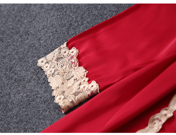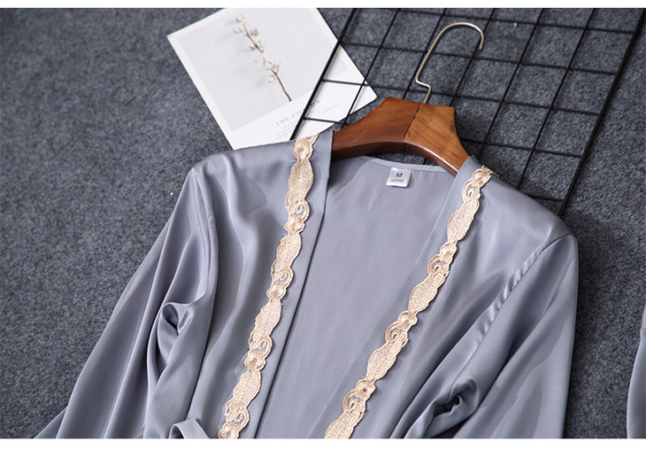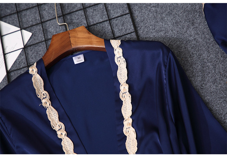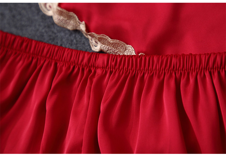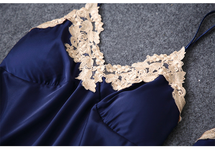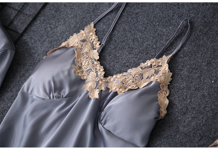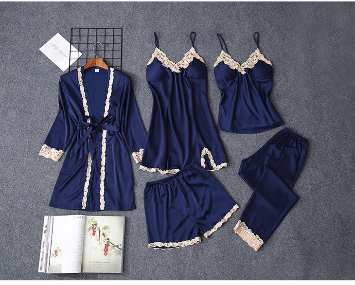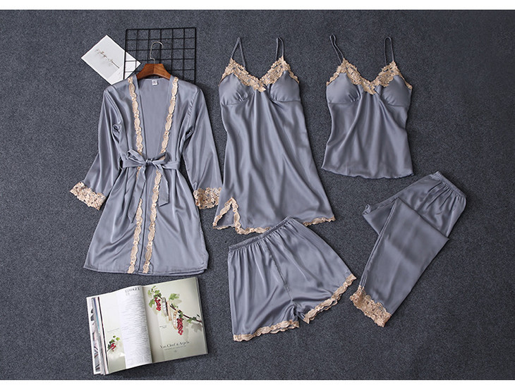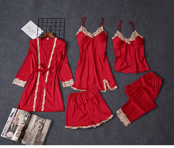 缎面雪纺睡衣女秋夏季性感仿真丝五件套丝绸带胸垫吊带睡袍家居服