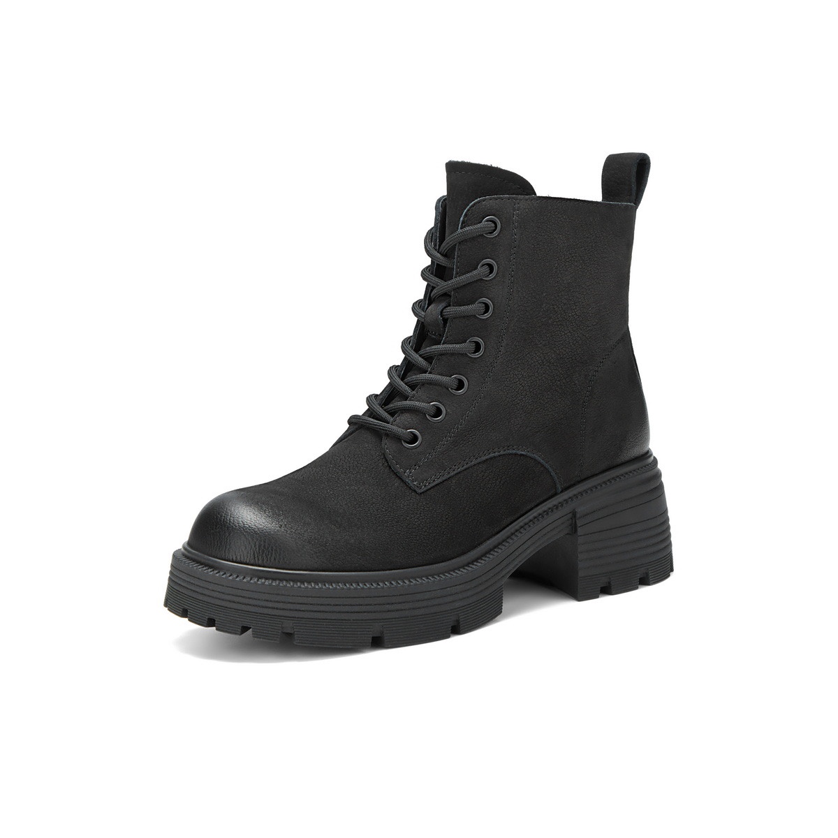 BF楼百丽复古真皮加绒保暖马丁靴女鞋款冬季粗跟休闲短靴子E8V1DDD5