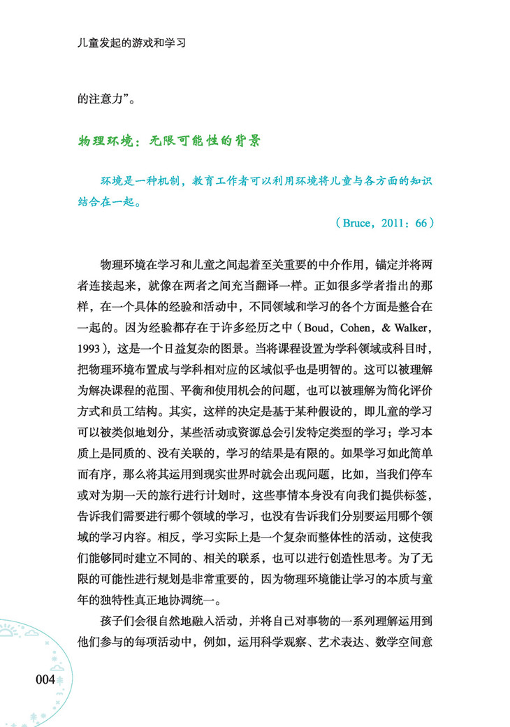 教师对儿童游戏的贡献,往往是从规划游戏活动的物理环境开始的,而教师如何规划环境取决于其所持的学习观。教师如何看待学习,就会以什么样的方式创设环境。如果把学习视为不同科目的学习,教师就会按照不同的学习领域来规划环境,把班级环境布置成数学区、科学区、语言区等与特定学习相关的区域。相反,如果把学习视为儿童通过主动与周围的环境和人互动而进行的复杂的整体性活动,教师就不会固化区域的活动内容,以提供资源的方式安排物理空间。在这样的物理环境中,每个空间都支持儿童进行所有类型的学习,而不再局限于某个明确的学习领域。