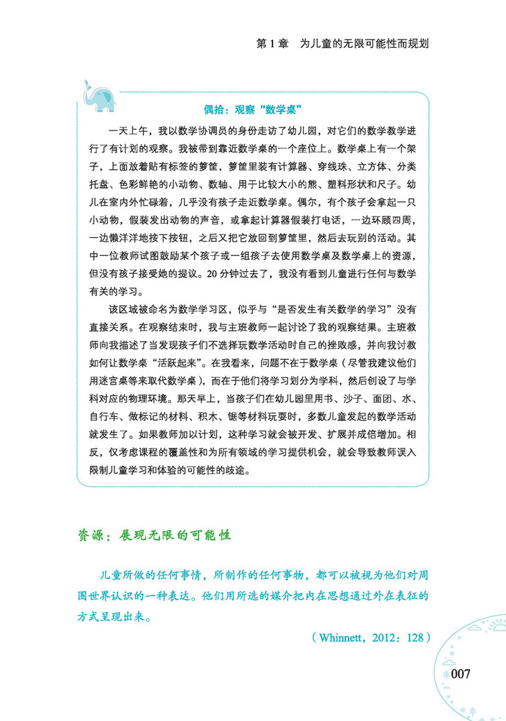 在我看来,本书最大的特色在于它不只是在理念层面探讨儿童学习与发展的“可能性”,更是在于通过鲜活的实践案例来告诉和启发广大从事幼儿教育工作的管理者、教师和家长尝试通过灵活而有创意的方式进行教育规划,捕捉日常生活中各种出乎意料的情形,将儿童身上萌发的“可能性”转变为现实。