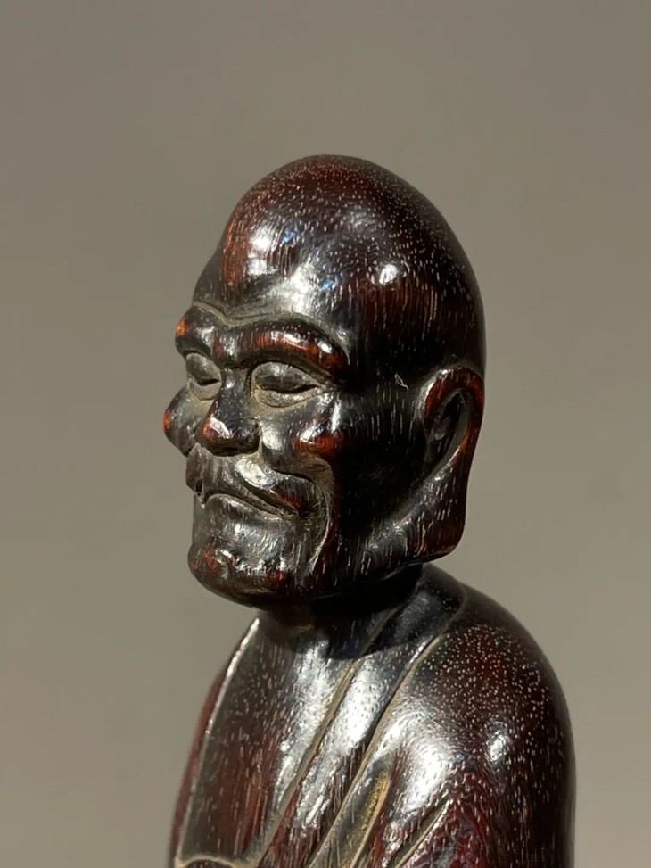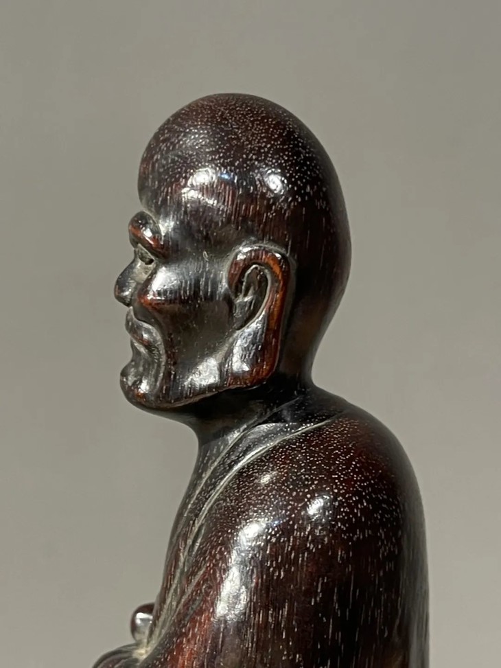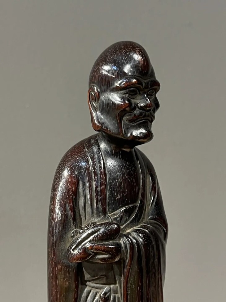 此尊小叶紫檀雕罗汉立像,除边沿线几处老细微磕伤与磨损痕外,整体保存完好无损,表面皮壳包浆浑厚温润。