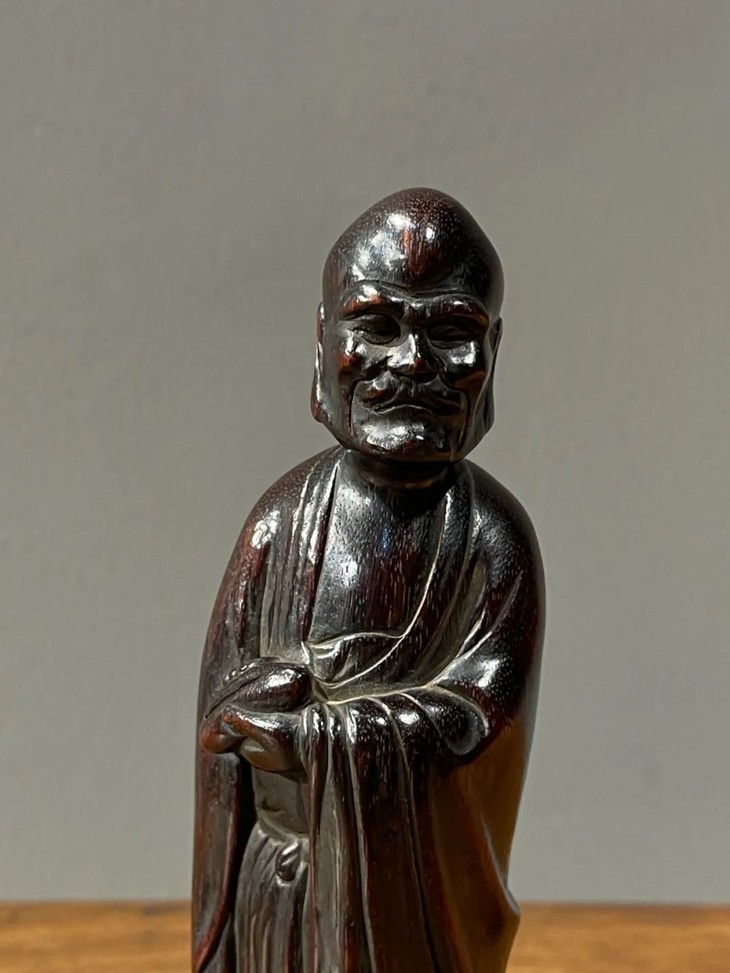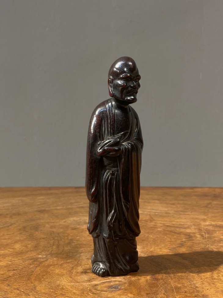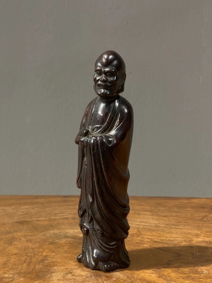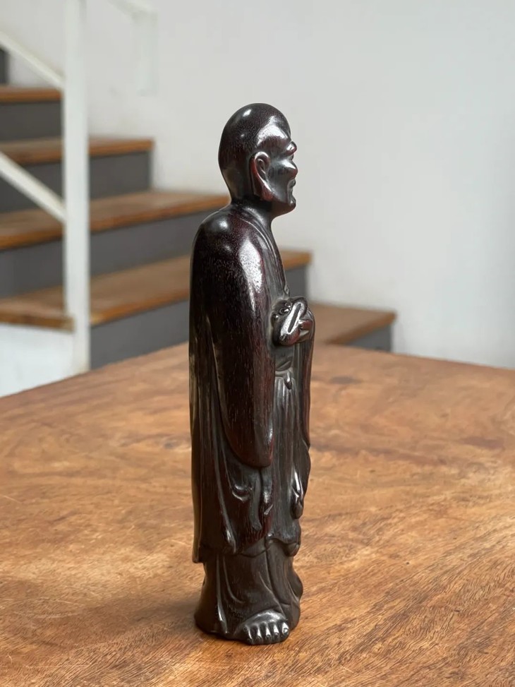 这是一件以质地坚硬比重高的小叶紫檀雕琢而成的罗汉立像,此罗汉立像是案头摆设尺寸,以整块比重高、质地坚硬的小叶紫檀雕刻而成,立体圆雕手持布履侧立的罗汉,体态造型端庄典雅,衣纹袈裟与面容线条丰富生动,雕琢细腻,线条流畅自然,堅硬之小叶紫檀木表面细牛毛状纹理清晰可见,整体气质优雅柔美。