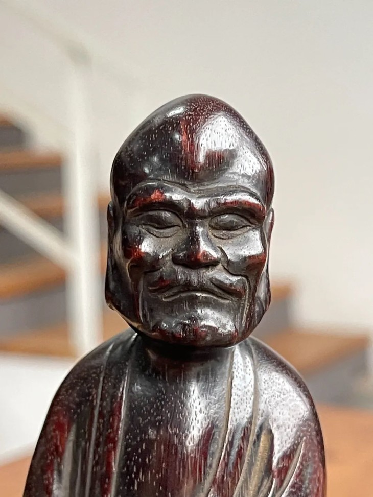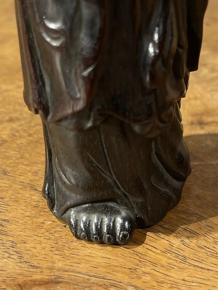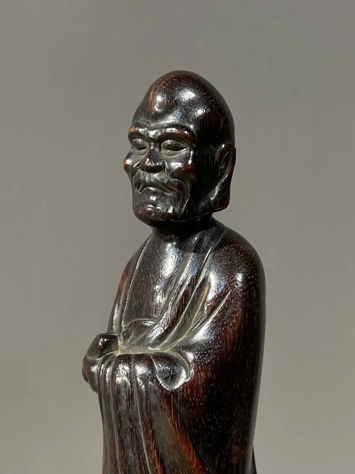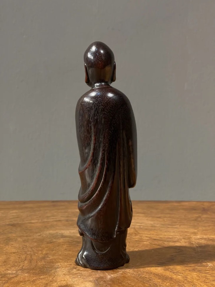 此尊小叶紫檀雕罗汉立像,姿态慈祥柔美,面容姣好庄严,呈现超凡的气度,是民国时期的高端佛像。此尊小叶紫檀雕罗汉立像,木质色泽深黑沉穆,天然木纹清晰可见,比重高、握于手上感觉沉甸甸的特别压手,质感细腻、温润油亮,整体曲线优美,衣纹华丽,体形优雅,面容肃穆,如此质地优良、雕工精美、尺寸适中的老紫檀木珍贵难觅。依此尊小叶紫檀雕罗汉立像之造型、工艺水平,表面的温润皮壳表面判断,肯定是年代老物。近距离接触可观赏到古代塑型艺术以及木雕工艺的精緻华丽,是典型佛教庙宇或大户人家供奉之高端佛像。