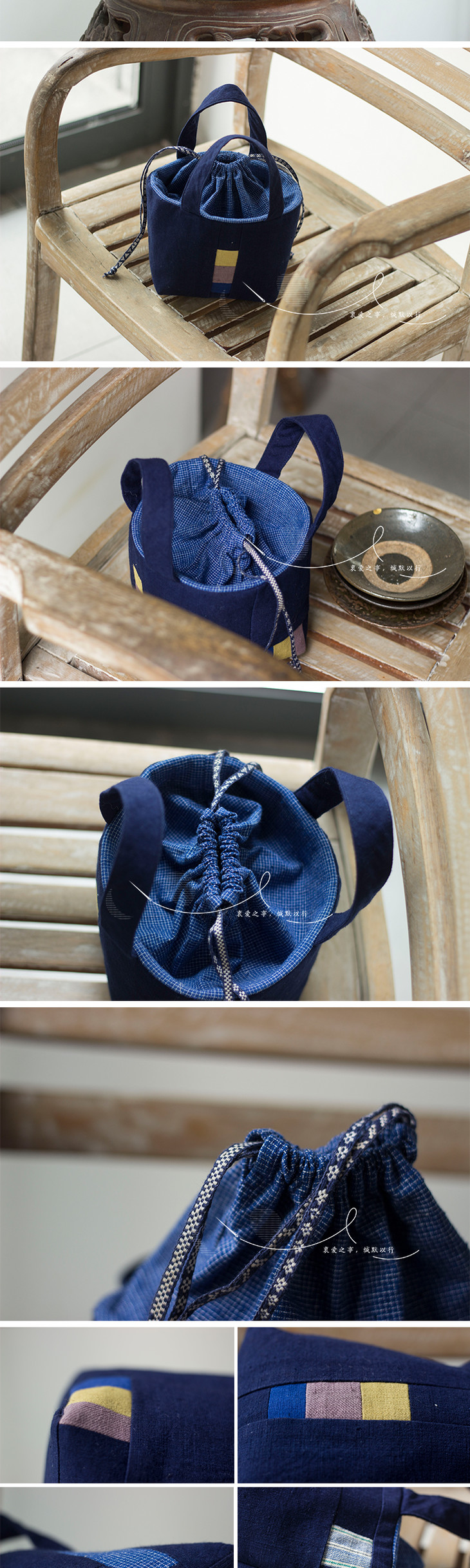 关于作品:毛蓝布为主做的拼色小包,对几何的执着,利用零碎布头拼接成表布,蓝白细格手织布做里布,抽绳更奢侈的用了手编织带。