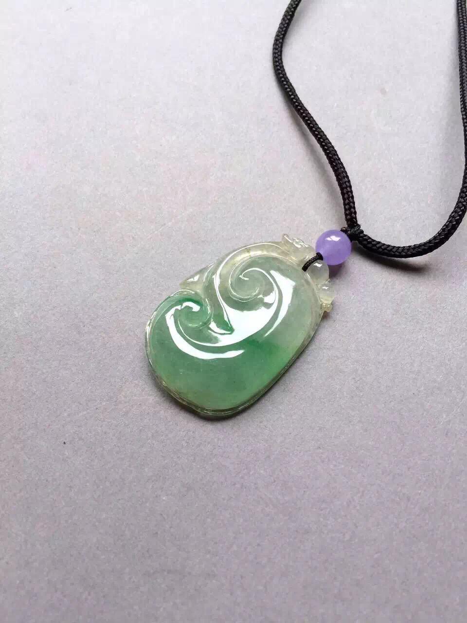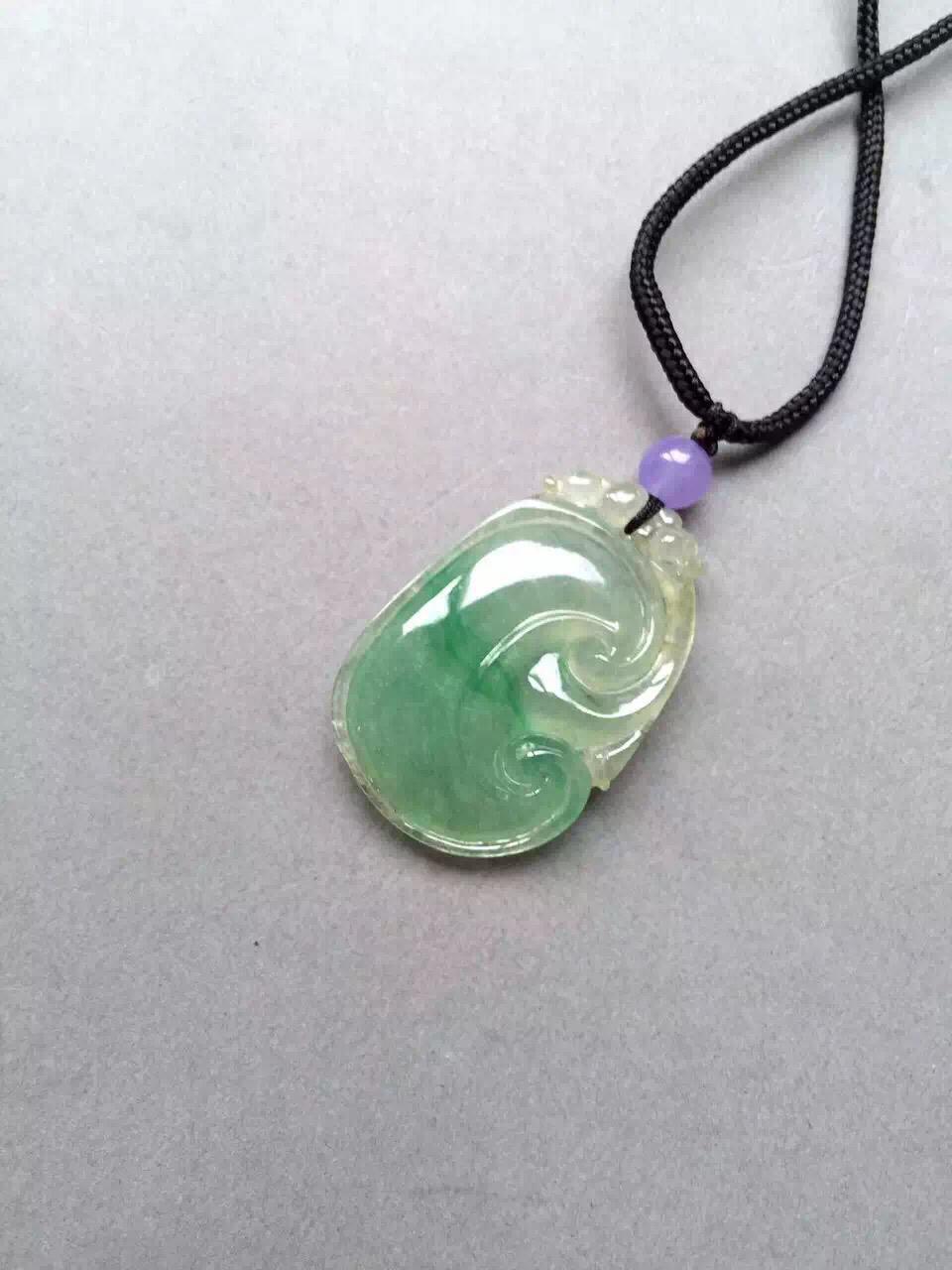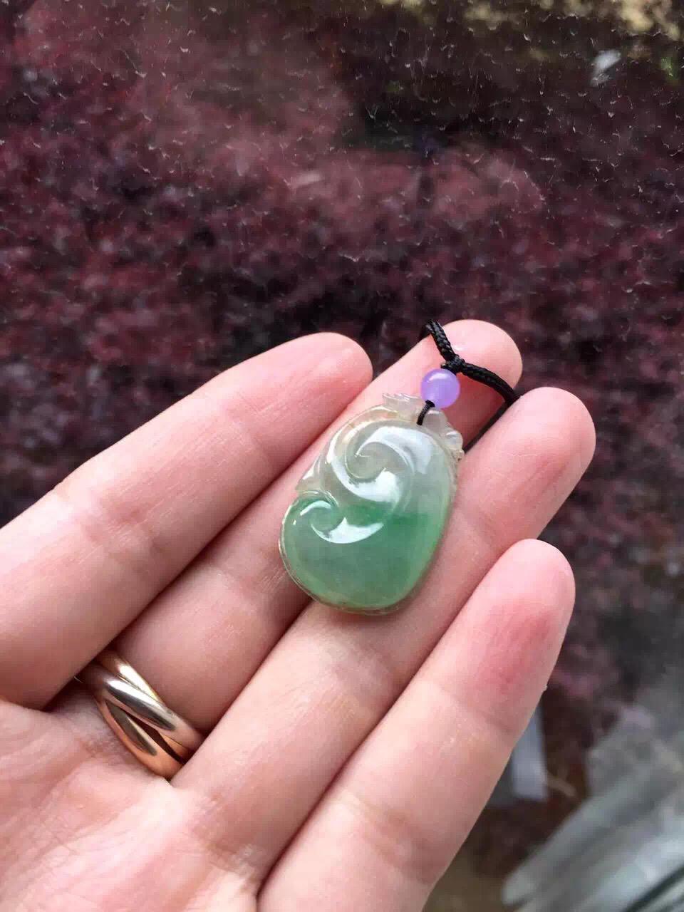 冰种飘阳绿如意,34*20.6*4.7mm,尺寸圆润饱满,手工雕刻线条流畅。种水好,清透自然,阳绿俏色仙气十足,整个如意下半部分泛着淡淡苹果绿,非常漂亮。背面有一个短石纹,无影响。上身效果好,特别推荐