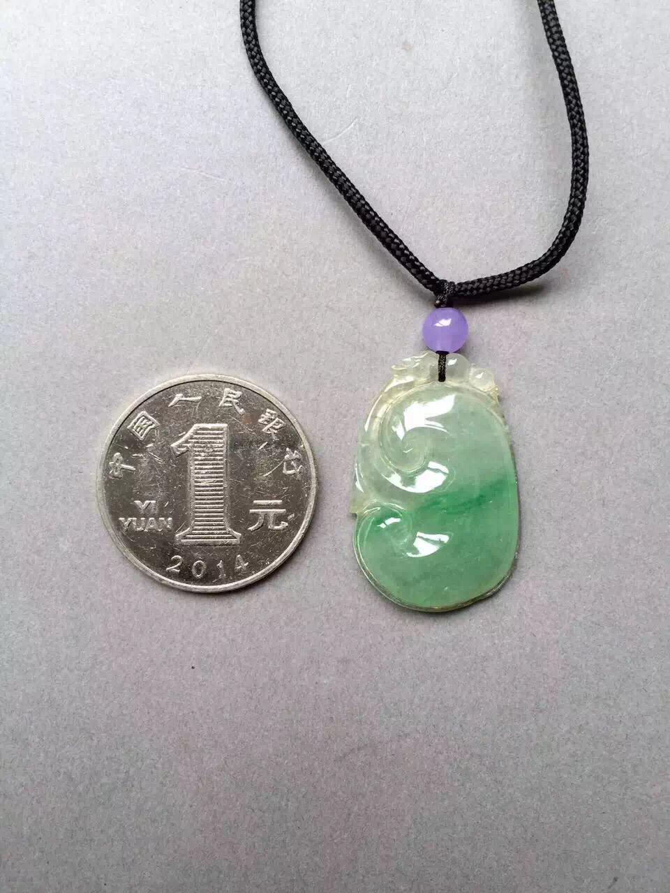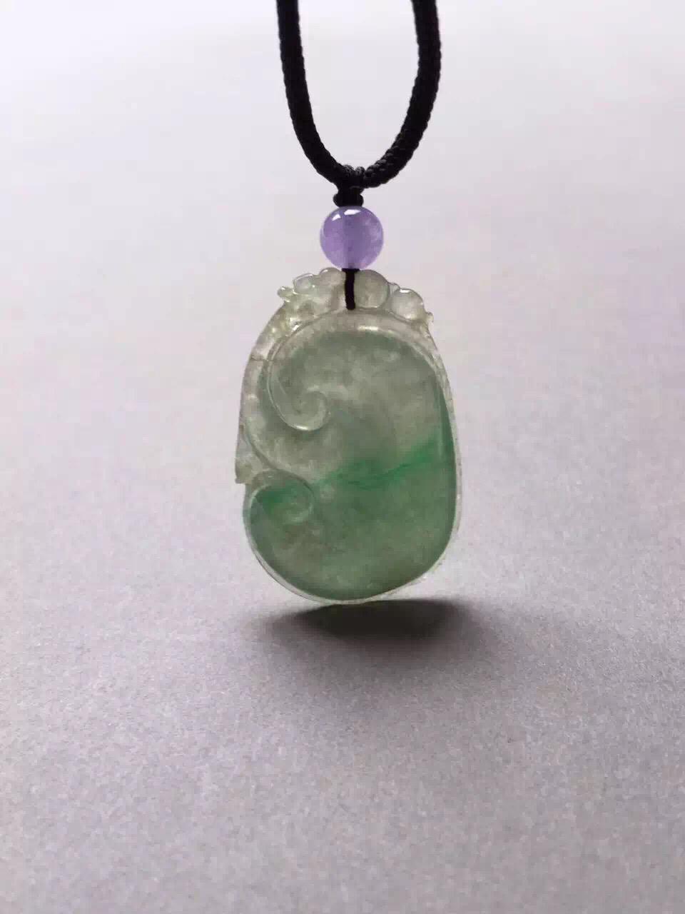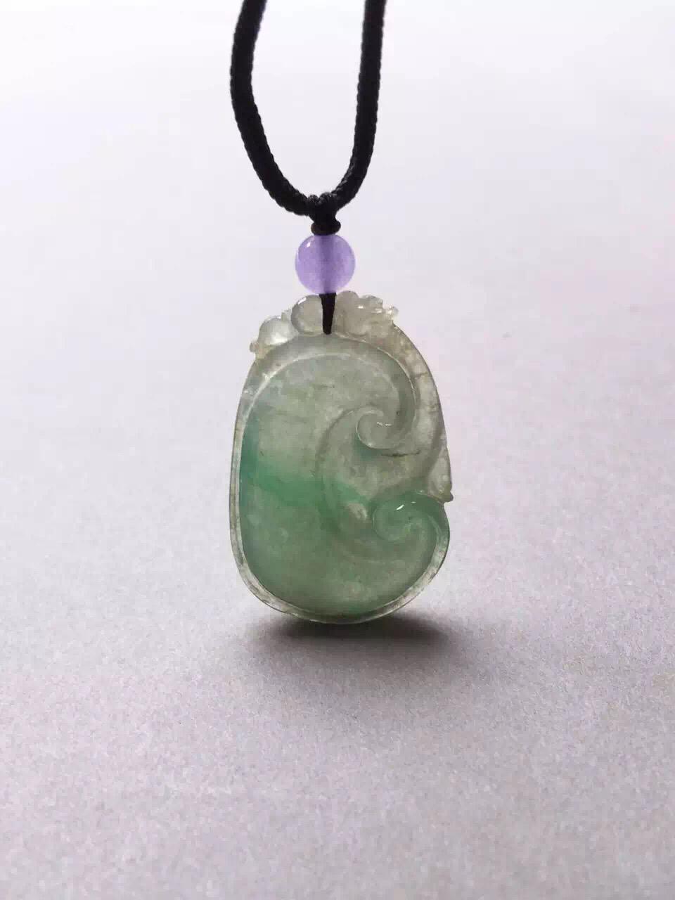 冰种飘阳绿如意,34*20.6*4.7mm,尺寸圆润饱满,手工雕刻线条流畅。种水好,清透自然,阳绿俏色仙气十足,整个如意下半部分泛着淡淡苹果绿,非常漂亮。背面有一个短石纹,无影响。上身效果好,特别推荐
