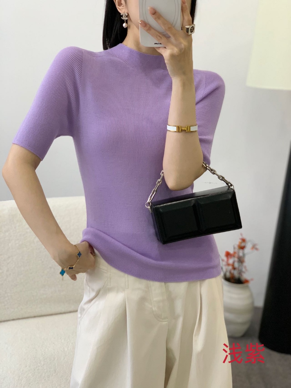 伯妮斯茵 | 高级感利落 纯色坑条羊毛打底衫 五分袖设计 百搭叠穿 日常内搭款 SZ3E17 - 浅紫色针织衫 -【诗说先秦~与时尚对话,与年龄和解,与诗意重逢!】