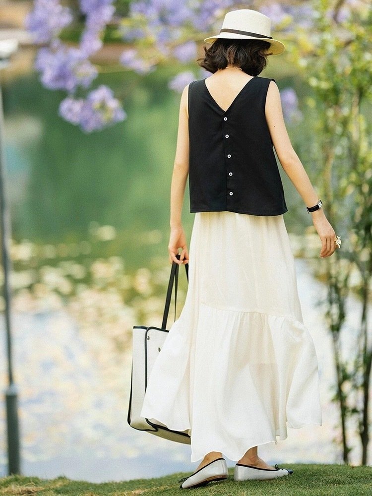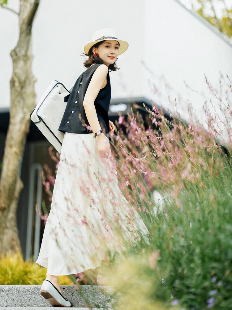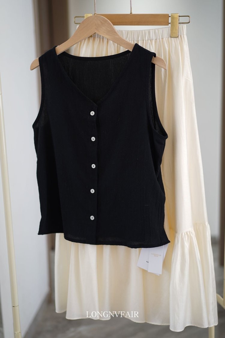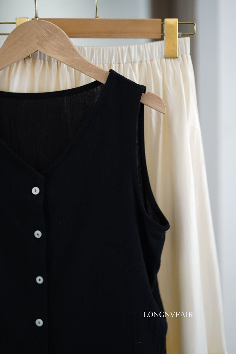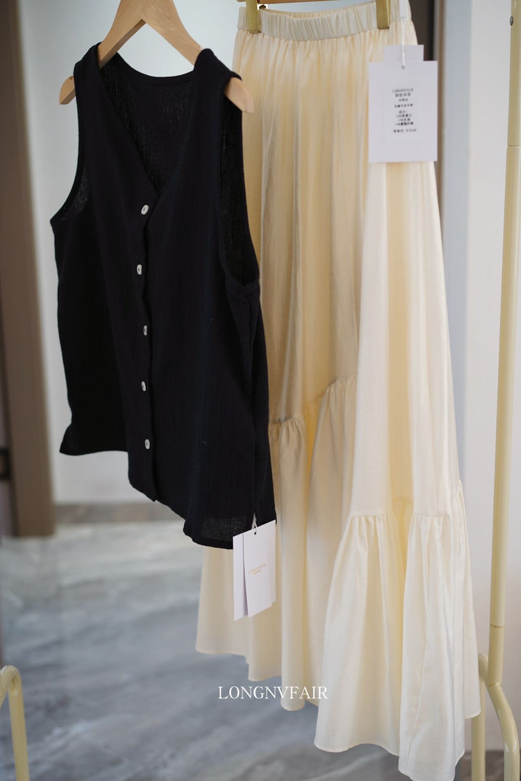 【LONGNVFAIR重磅天丝亚麻花瓣裙+马甲套装】棉麻天丝套装 黑色无袖上衣 减龄温柔风