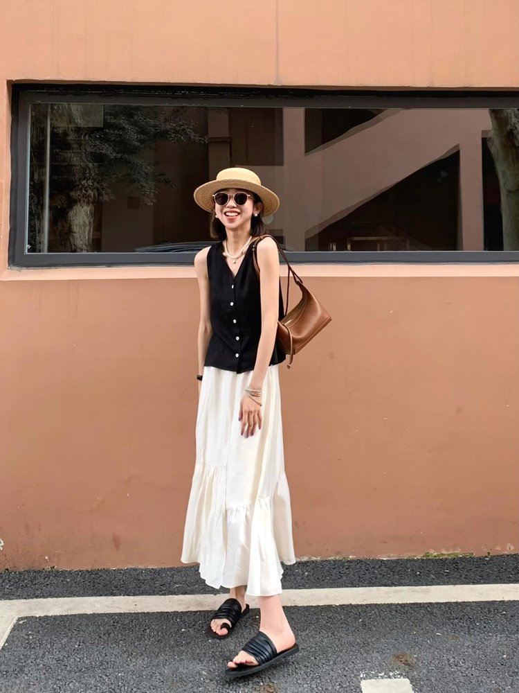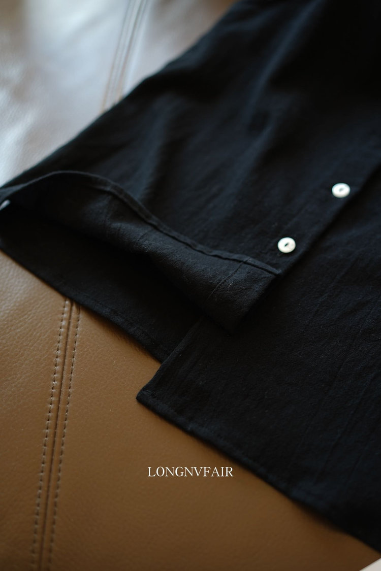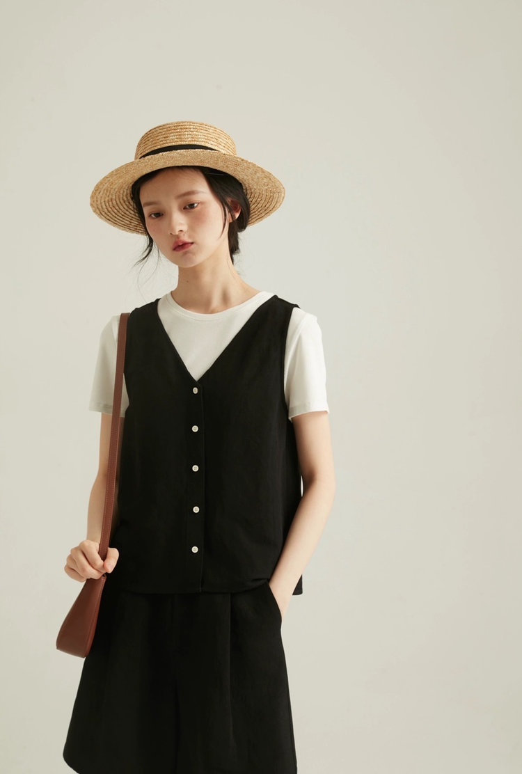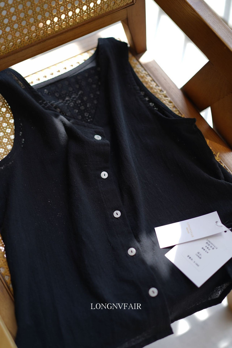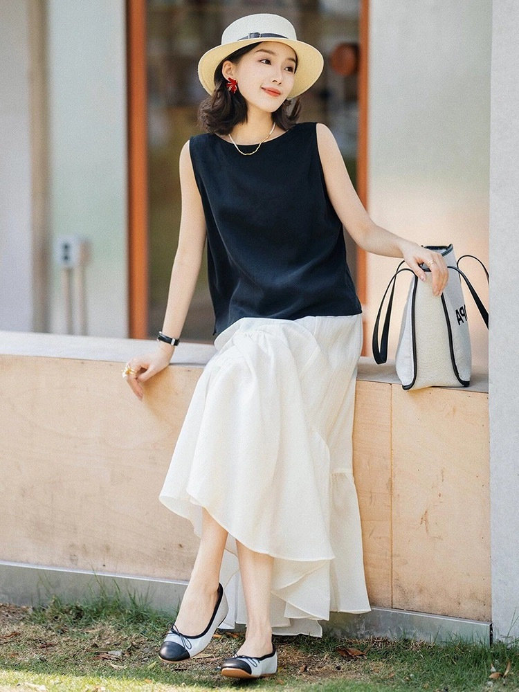 【LONGNVFAIR重磅天丝亚麻花瓣裙+马甲套装】棉麻天丝套装 黑色无袖上衣 减龄温柔风