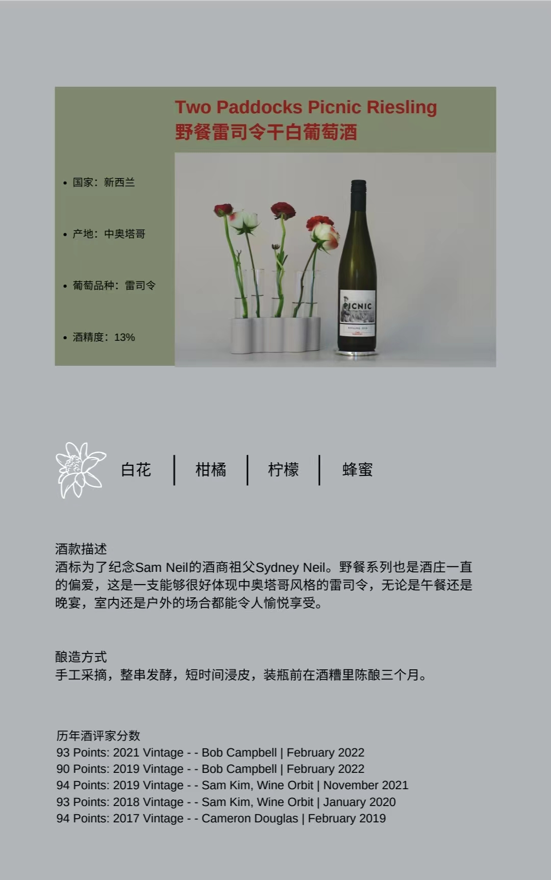 【买一送一】围场•野餐雷司令葡萄酒 TWO PADDOCKS PICNIC RIESLING