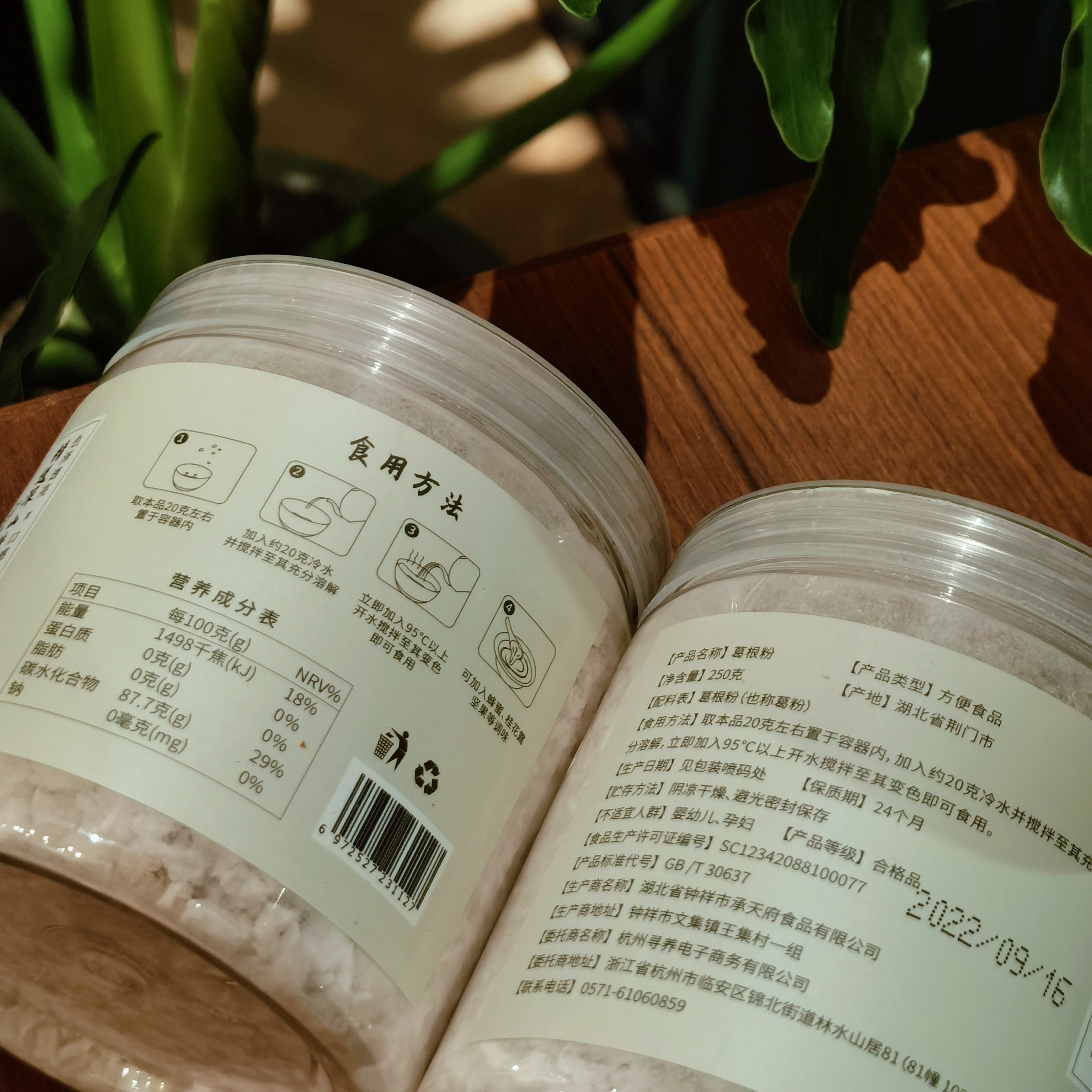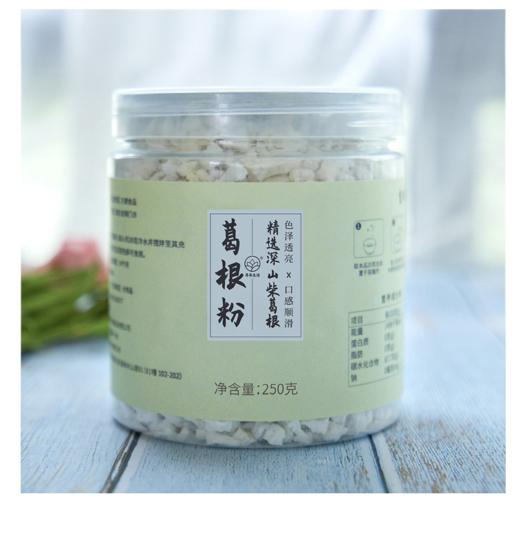 泡葛根粉跟泡藕粉是一样的,有技巧!用勺子舀3-5勺,先加一点点温水或冷水(10ml左右)把藕粉搅拌融合,以防结块,再用现烧开的开水边倒边搅拌,变成透明糊状就可以了。切记,千万不能用饮水机或者保温的水来冲,水温不够可是冲不开的,还有就是,一定要边加热水边搅拌,不然易结块!泡好后晶莹剔透,吃起来比藕粉多一丝“人参味”,可以自己加水果、加坚果、加桂花……看个人口味!寻养生活葛根粉一罐是250g,也能泡蛮多次,平时用来当早餐、下午茶或夜宵比其他速食会健康很多!