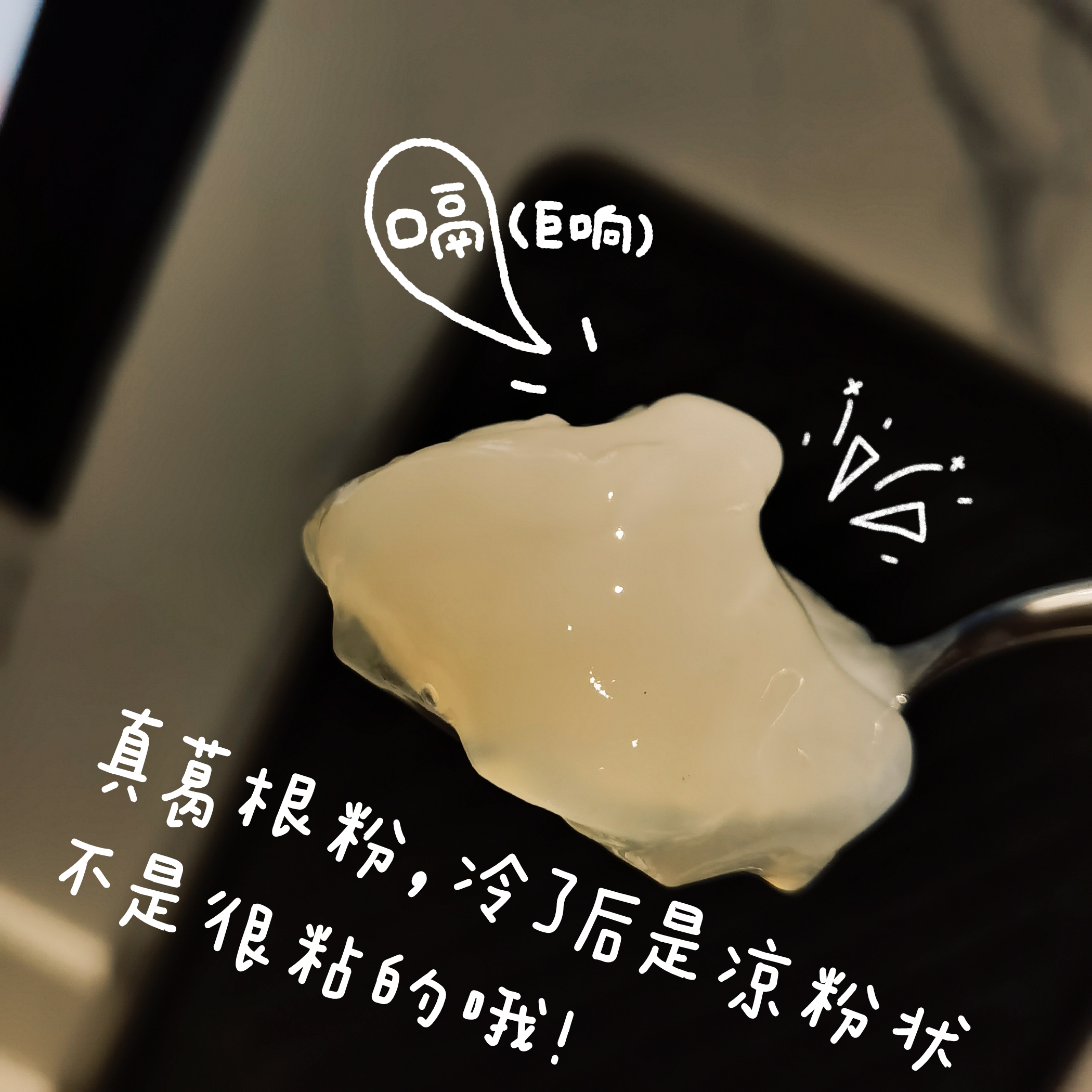 我知道市面上葛根粉也是很多,就算大家不选这款,在买的时候也要留个心,一般纯葛根粉泡出来的糊糊颜色是半透明的黄,放冷后是没有很粘的凉皮状,泛白、发黑的大多是人工葛粉,还有一些可能会用木薯粉充当,营养成分大打折扣哦!