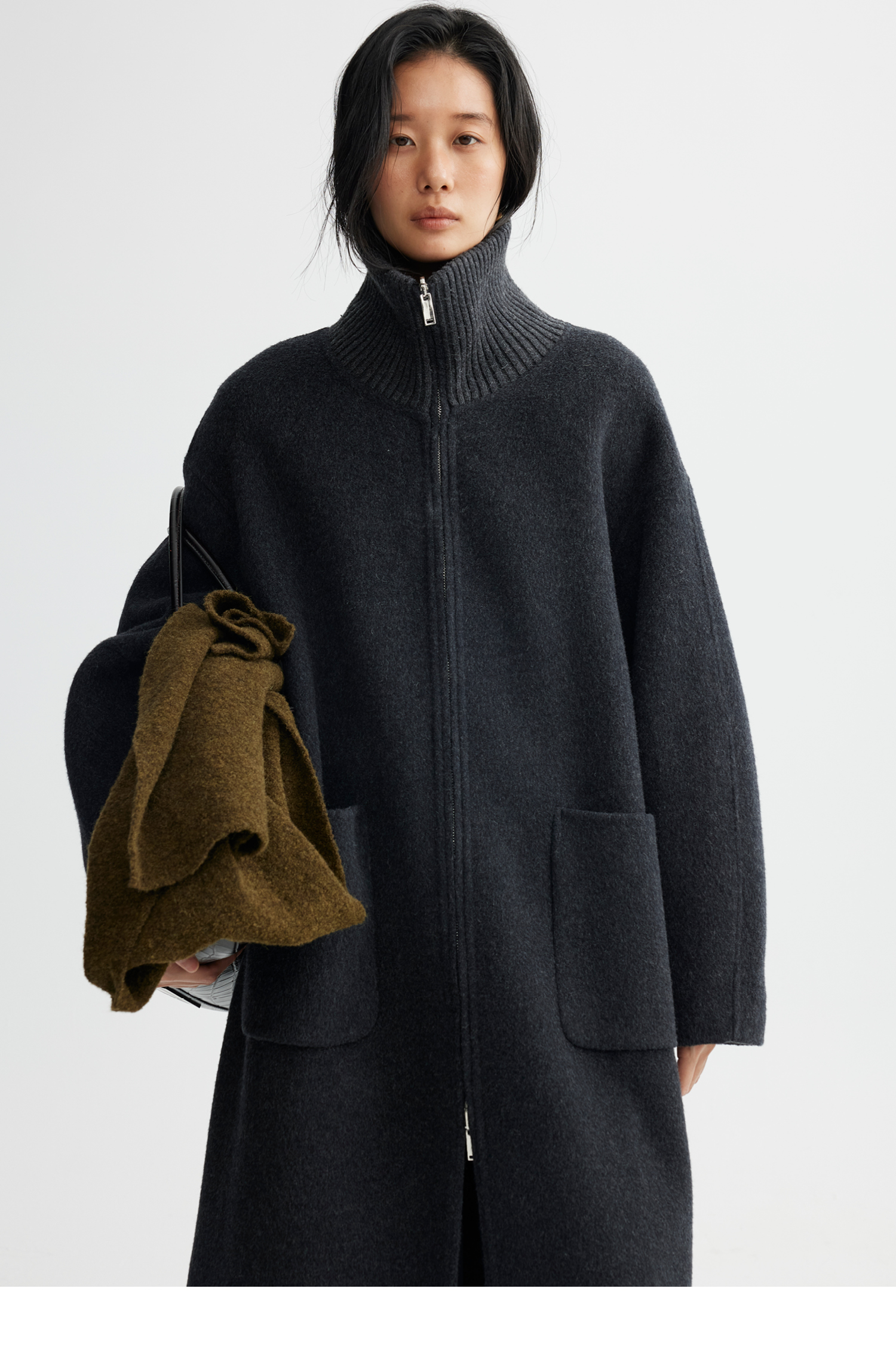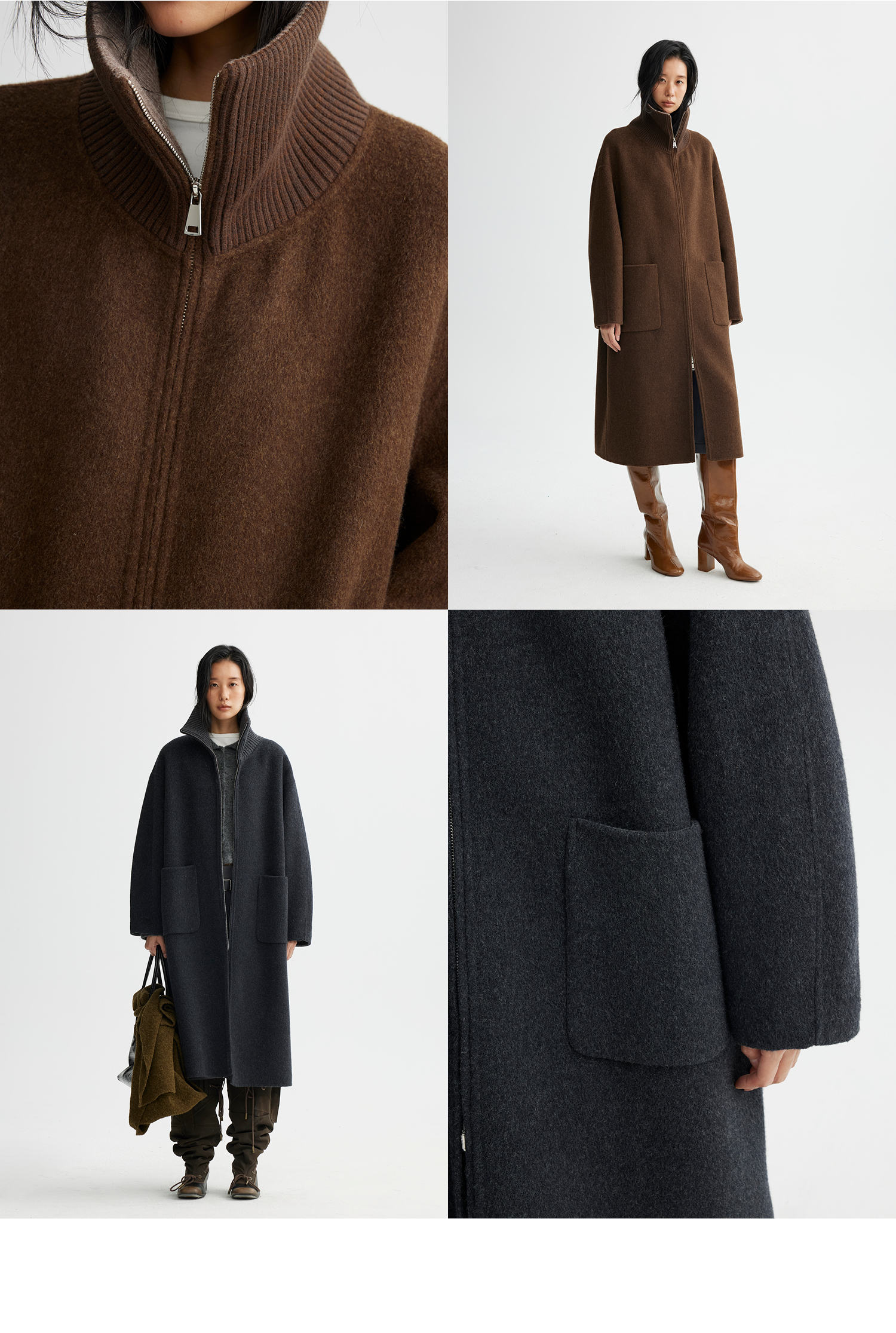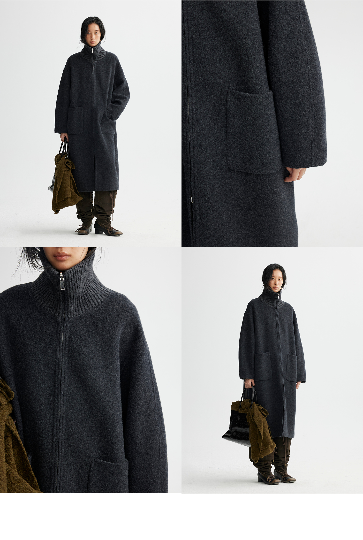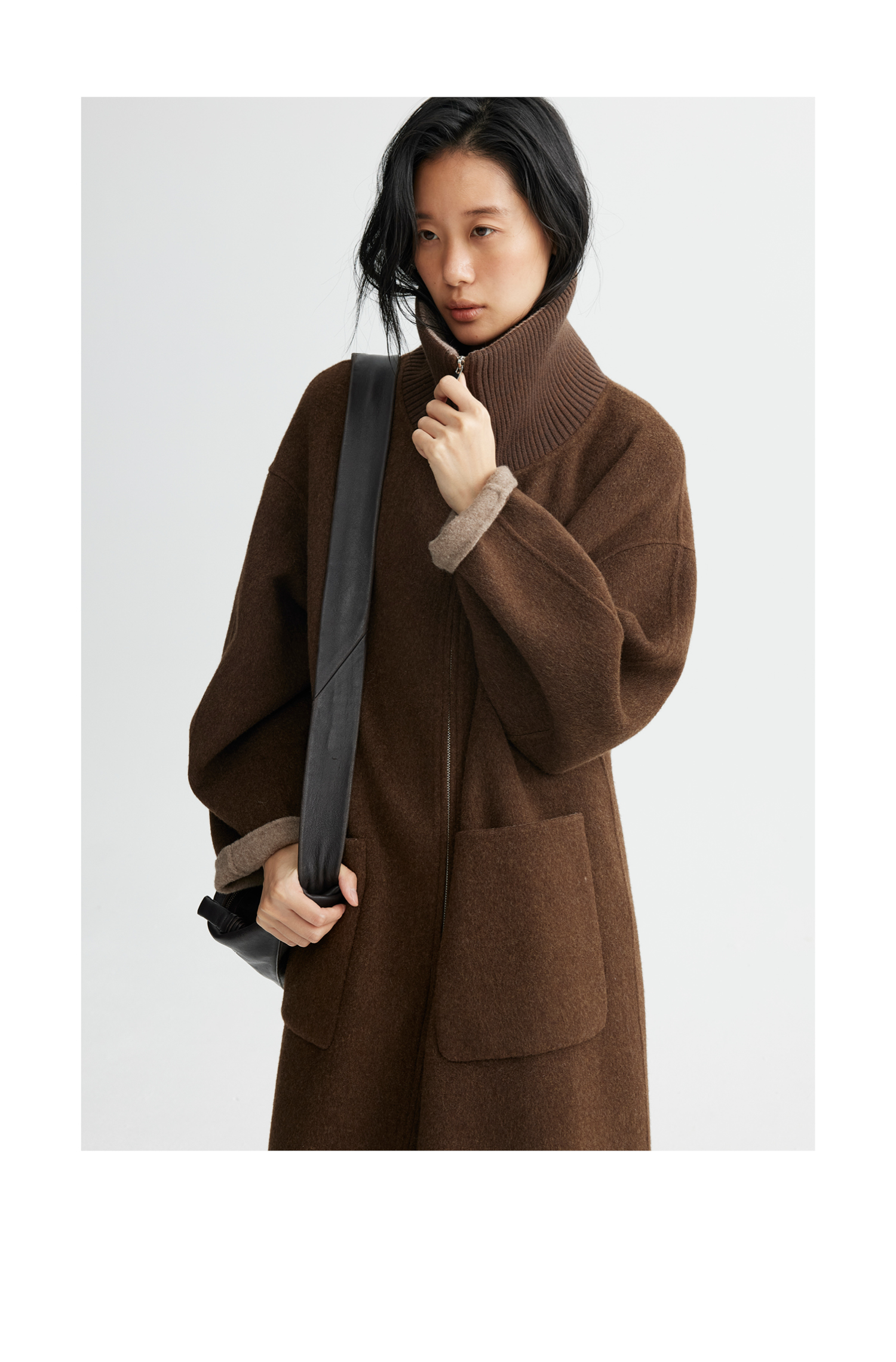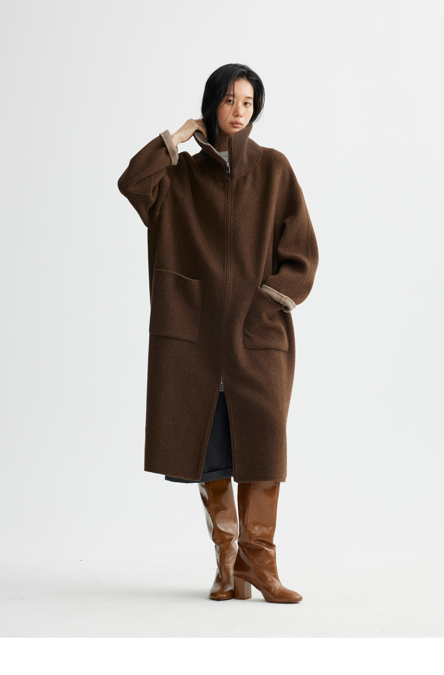 素舶 山羊绒桑蚕丝绵羊毛奢感针织立领拼接双色立绒双面呢大衣