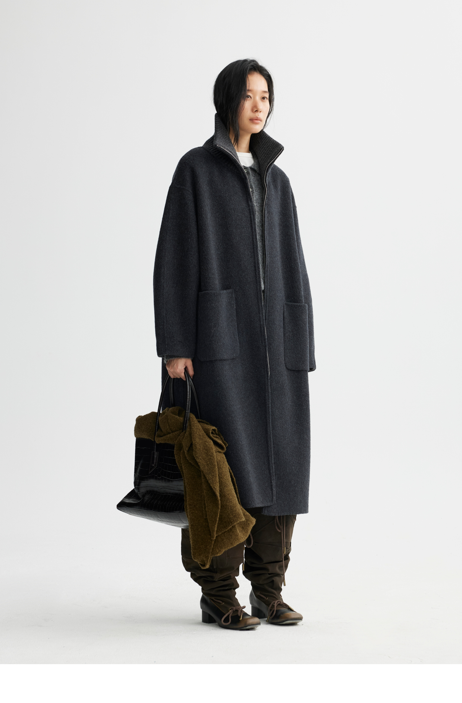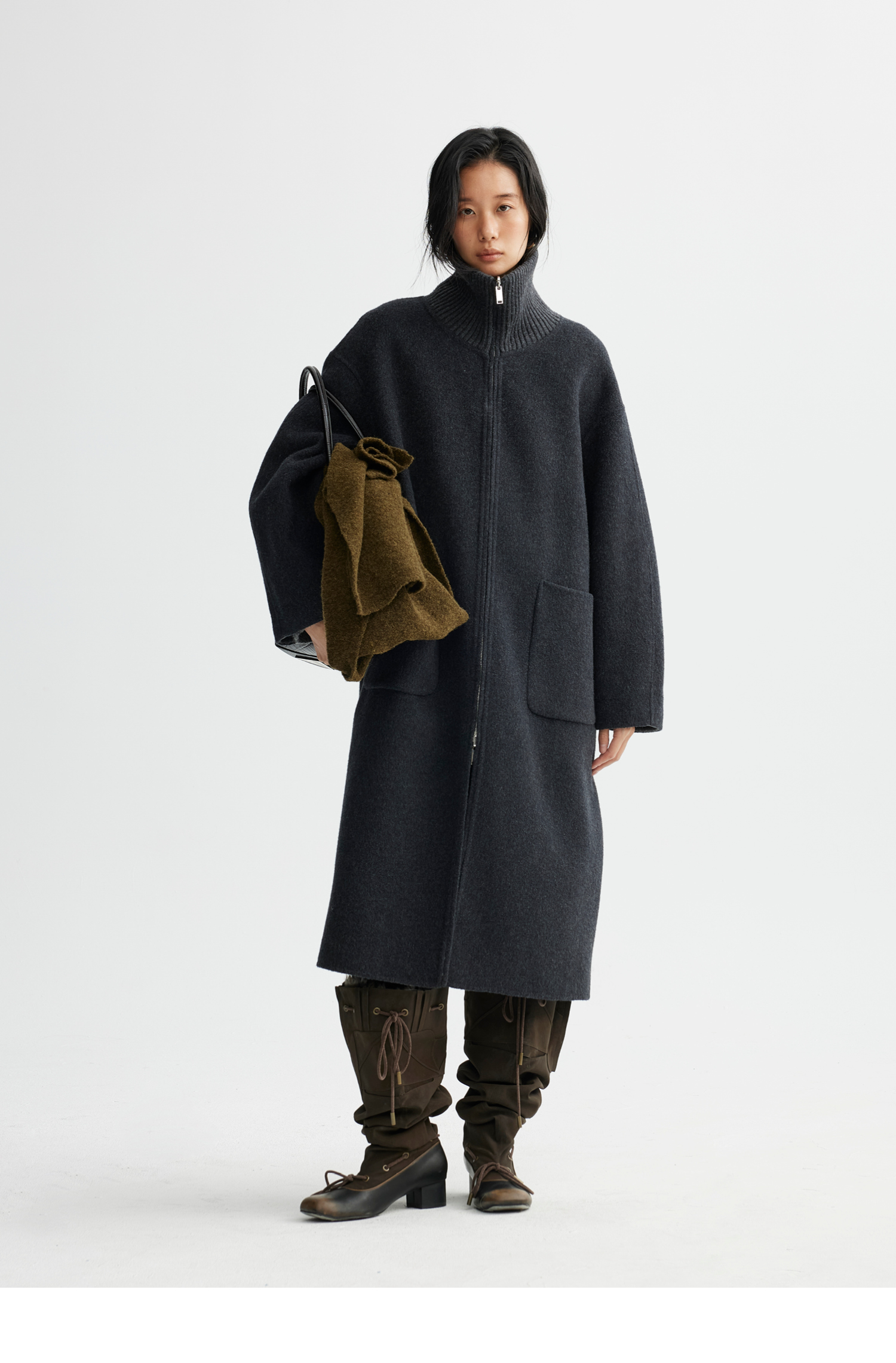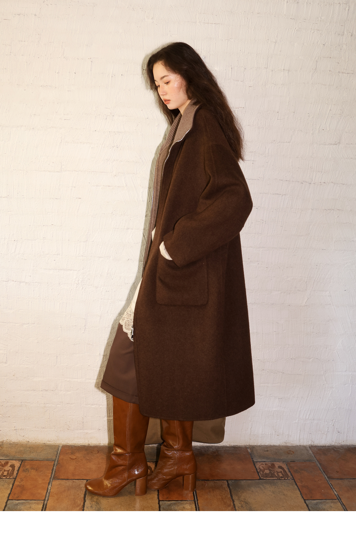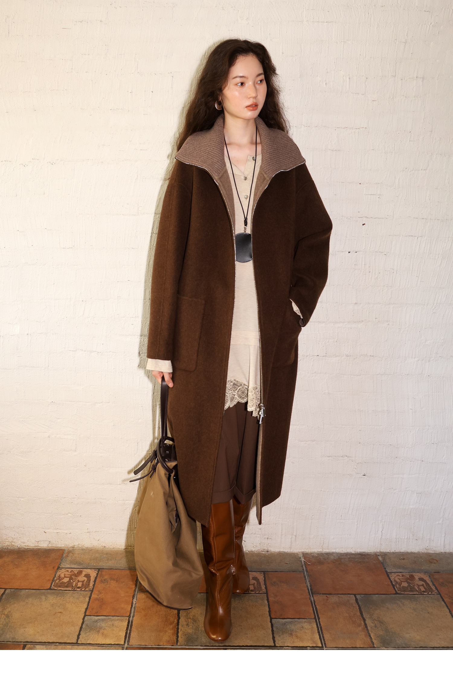 素舶 山羊绒桑蚕丝绵羊毛奢感针织立领拼接双色立绒双面呢大衣