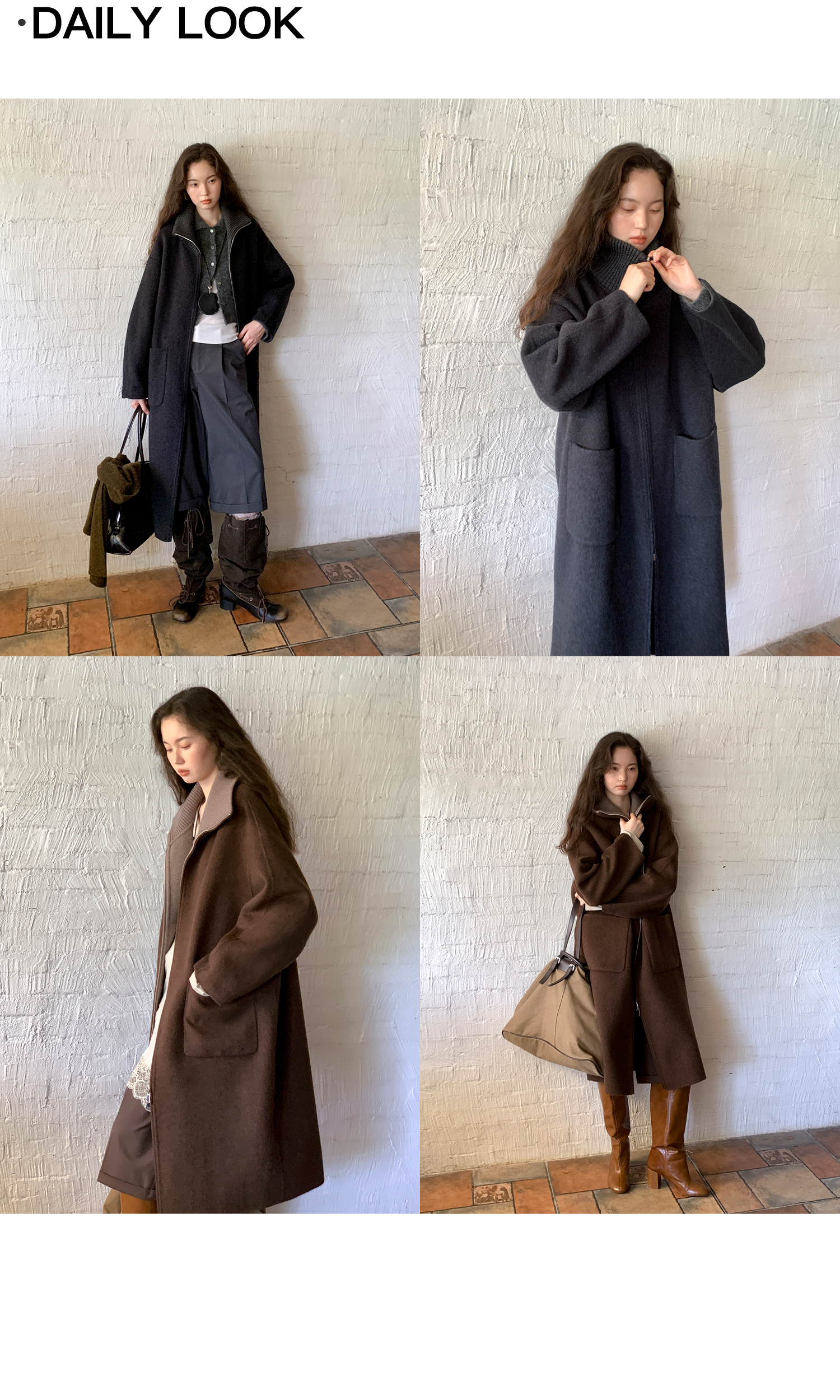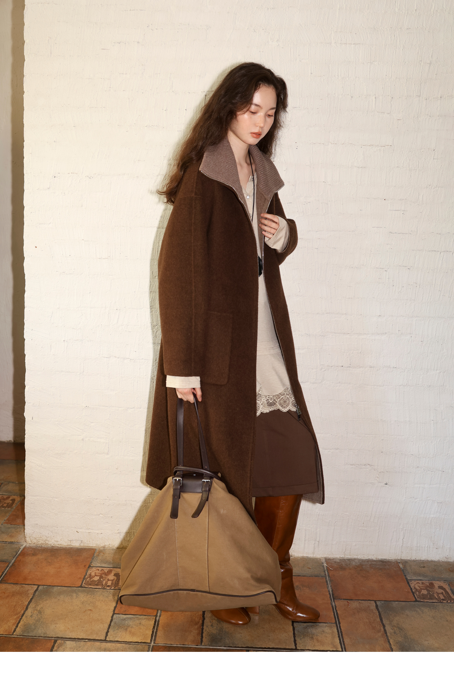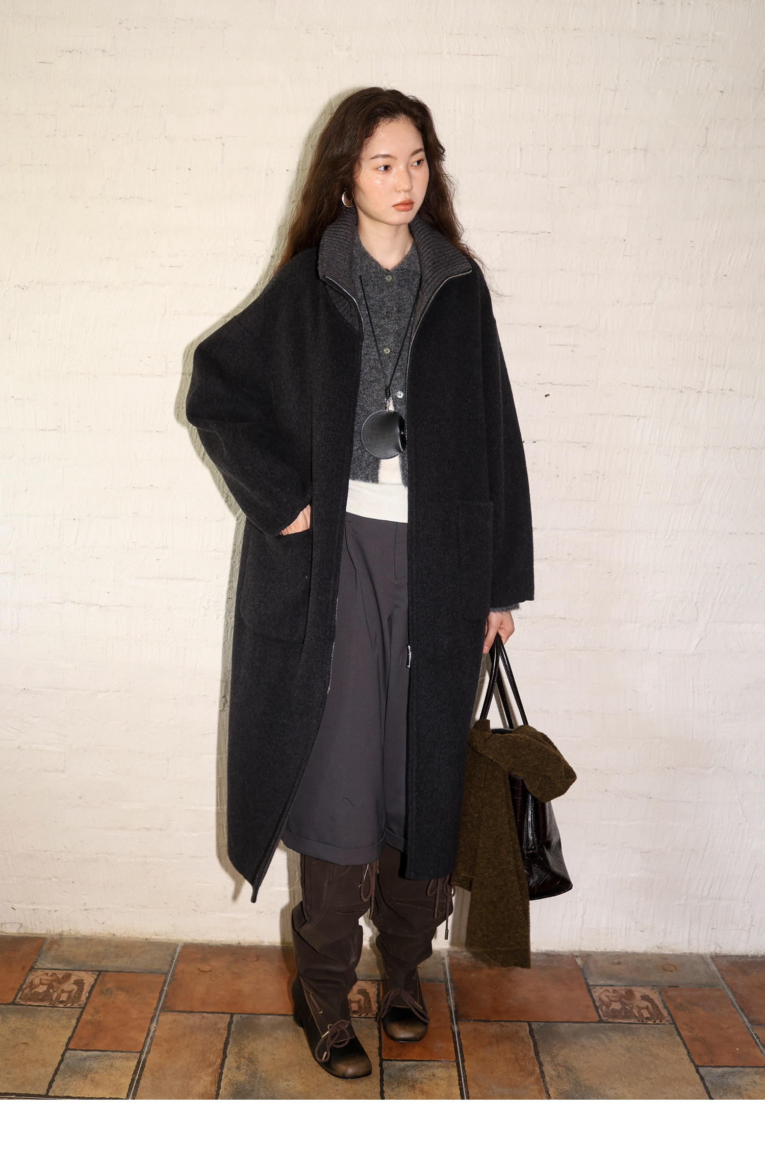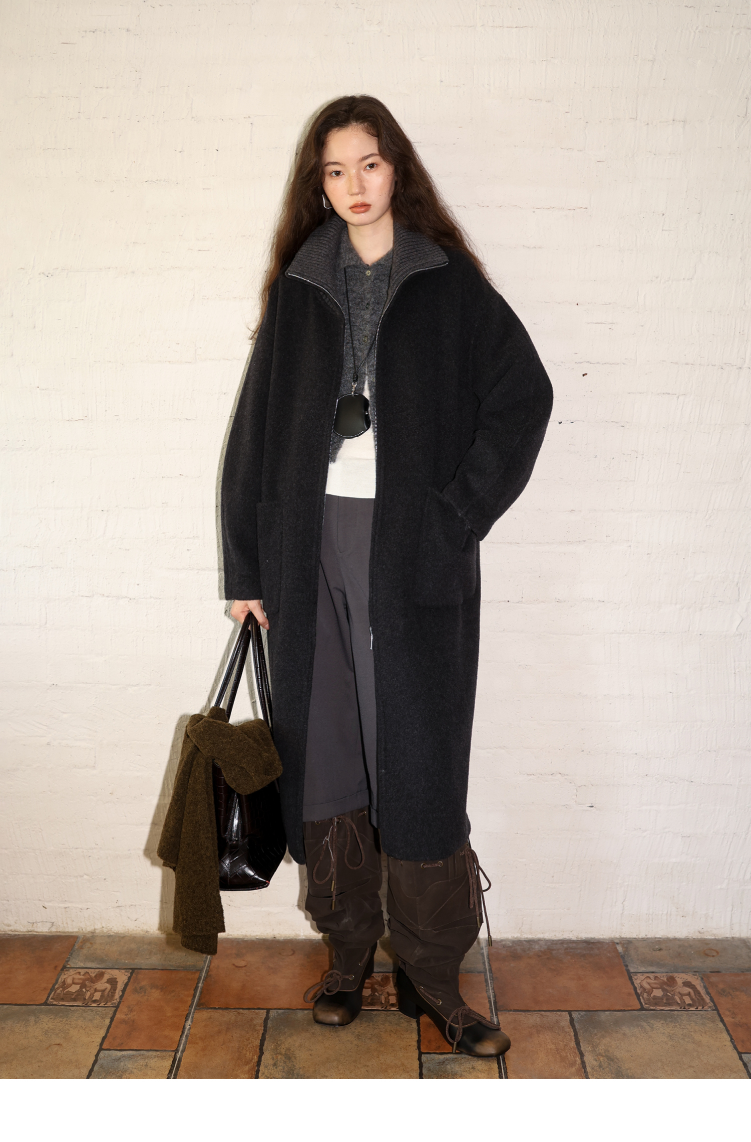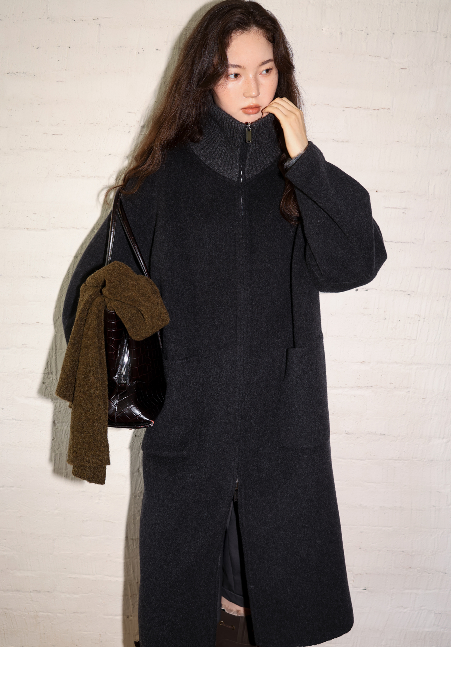 素舶 山羊绒桑蚕丝绵羊毛奢感针织立领拼接双色立绒双面呢大衣