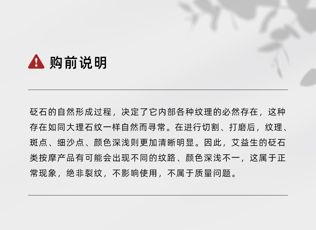 2. 砭石底座为天然石头,属易碎物品,因此在使用时应轻拿轻放,勿触碰坚硬物体。