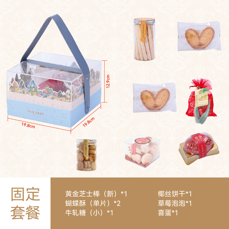 【配置】:森林派对(黄/蓝)配置:黄金芝士棒(新)*1、椰丝饼干*1、草莓泡泡*1、蝴蝶酥(单片)*2、牛轧糖(小)*1、喜蛋*1