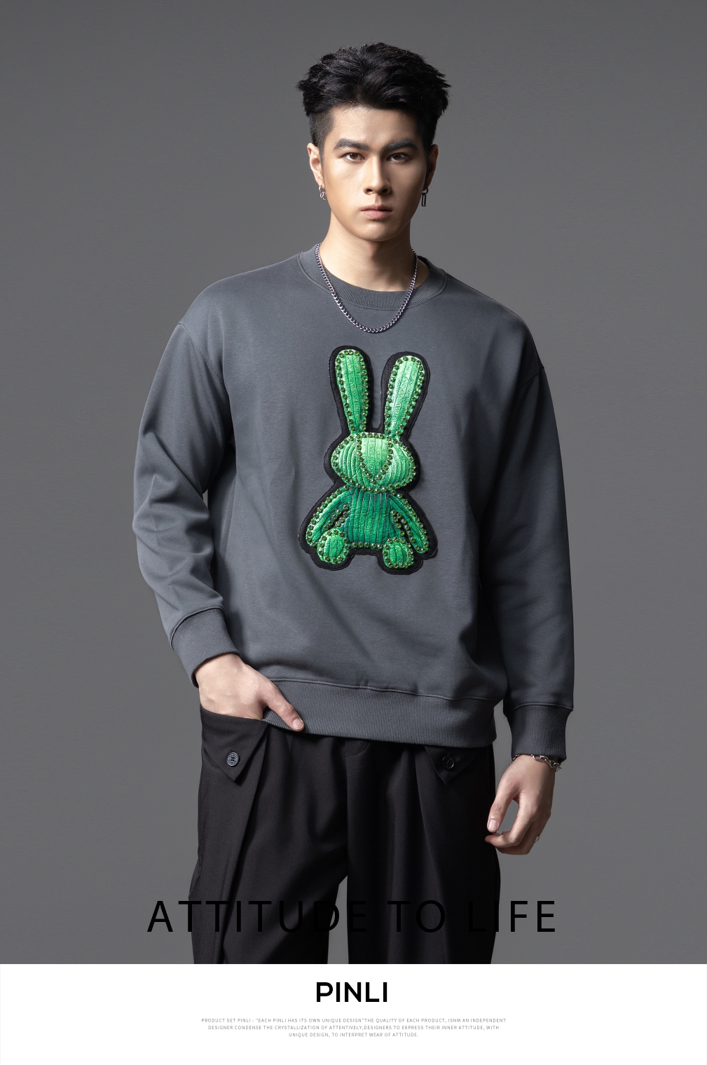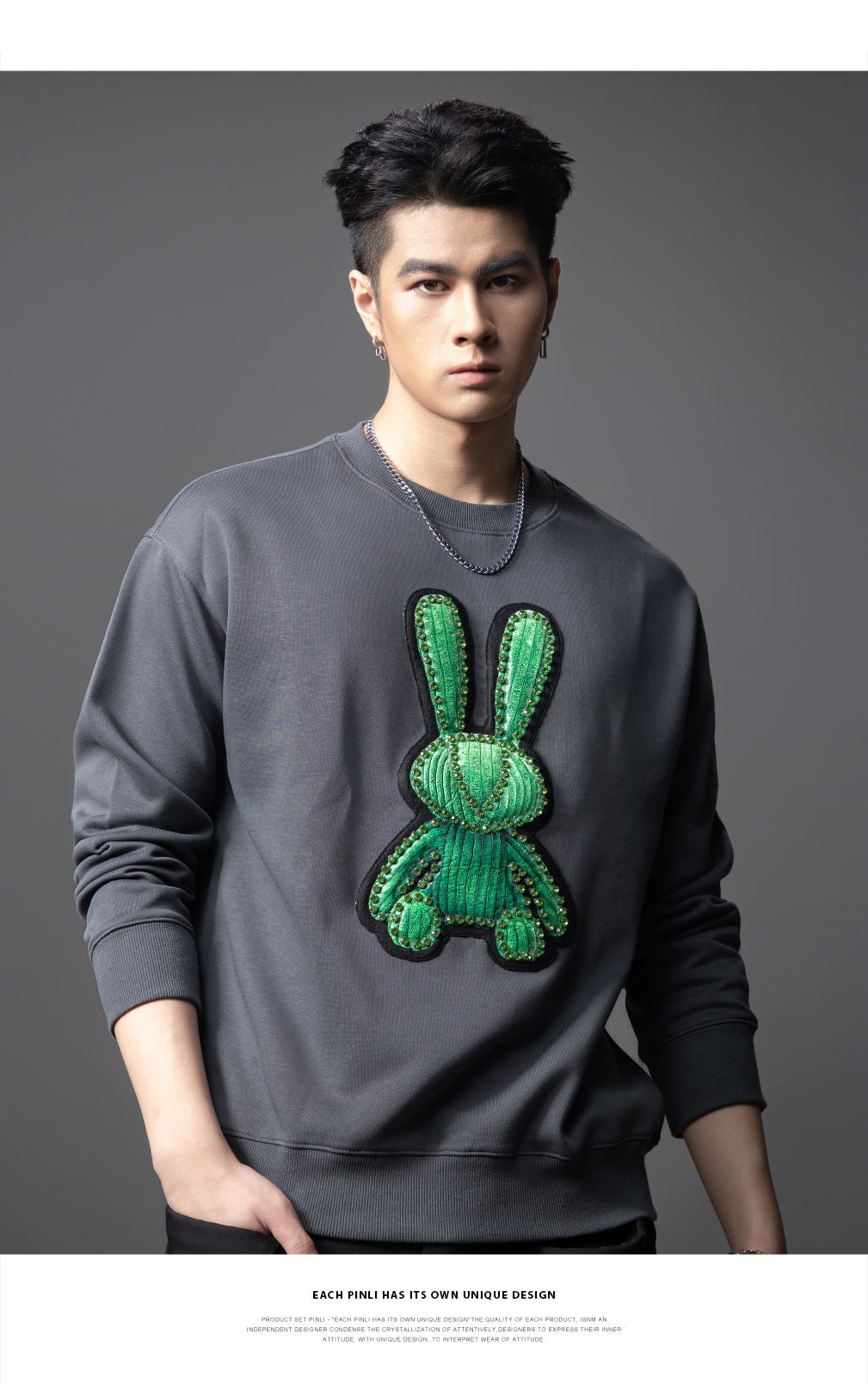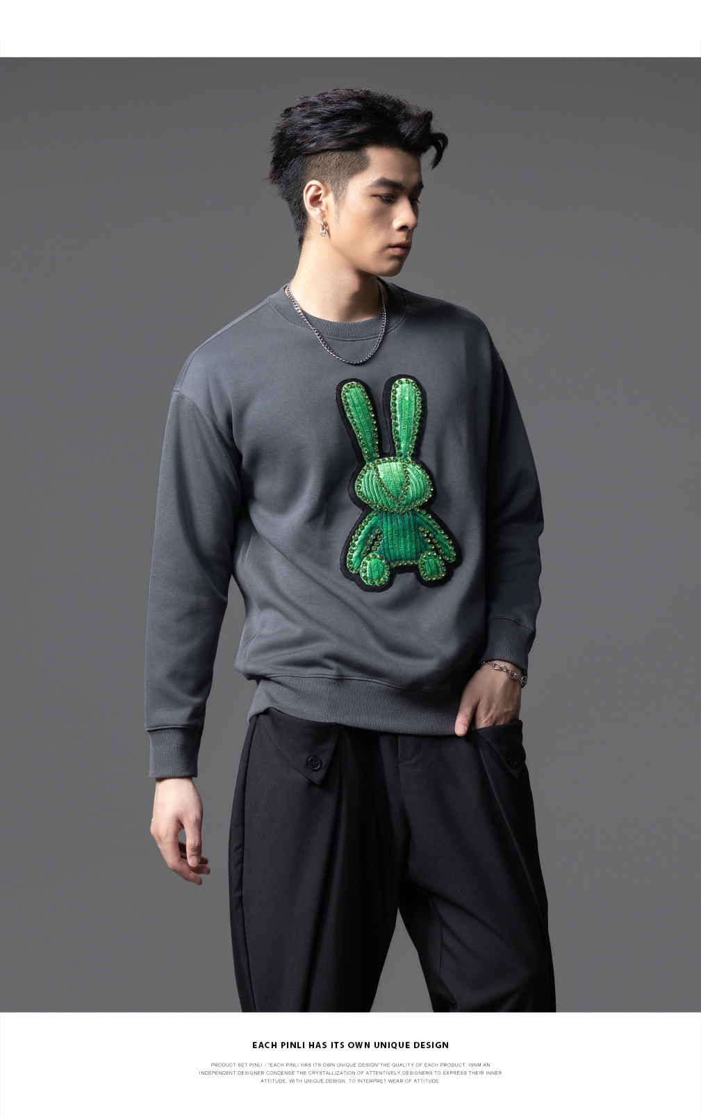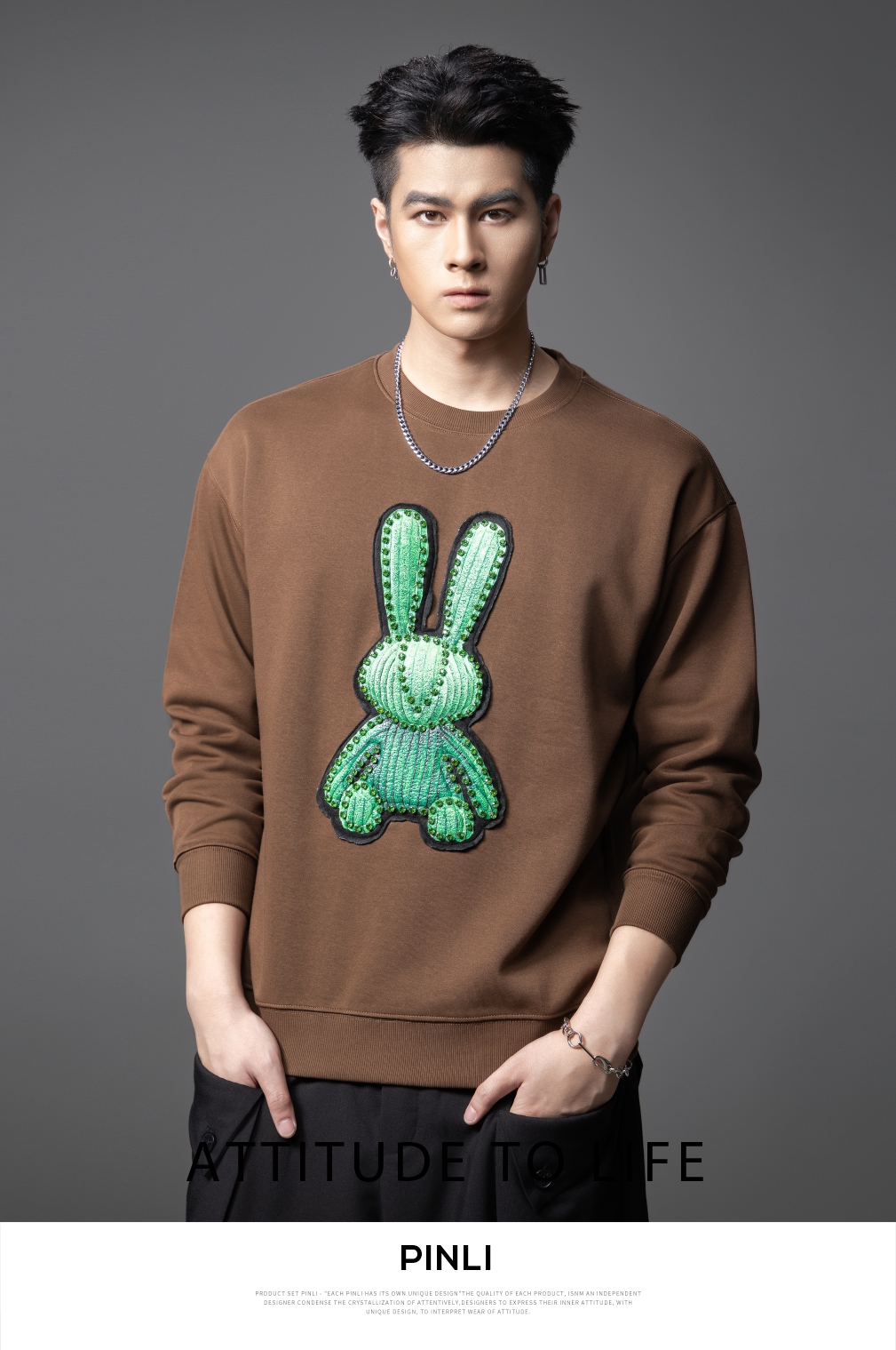 PINLI品立2025秋季新款发泡烫画男士卫衣手工钉钻珠套头潮牌上衣BG253109005