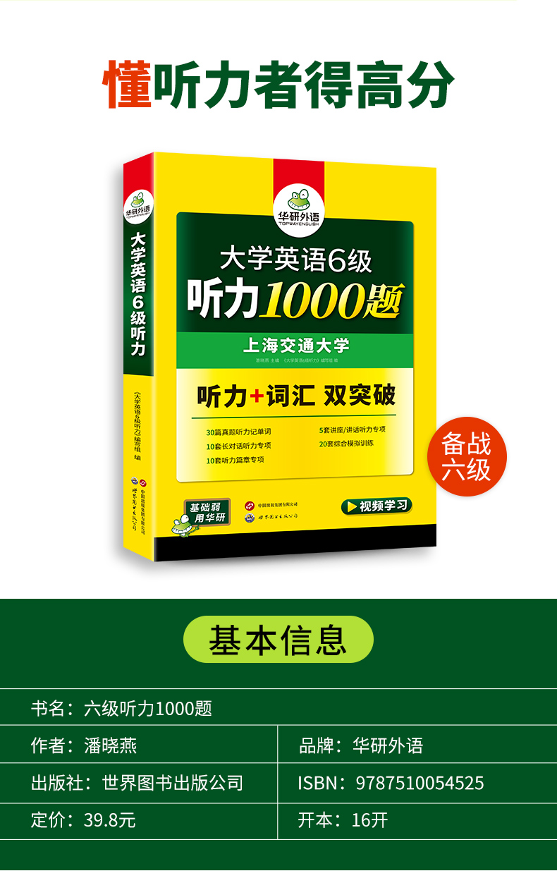 2.大开本大学英语六级听力训练书,方便书写及答题;