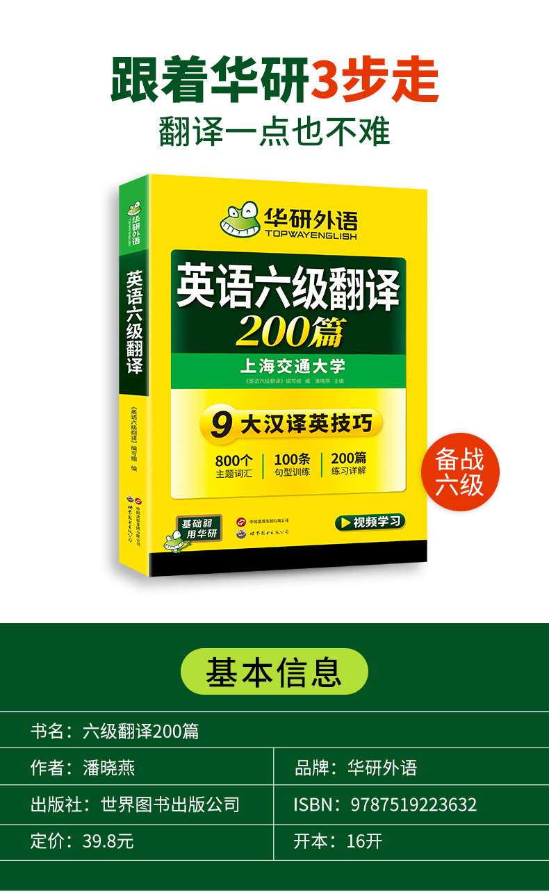 3.由易到难编排,包含单句翻译训练,词汇—句子—段落,三步突破汉译英新题型;
