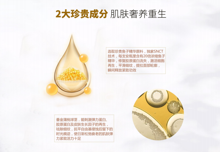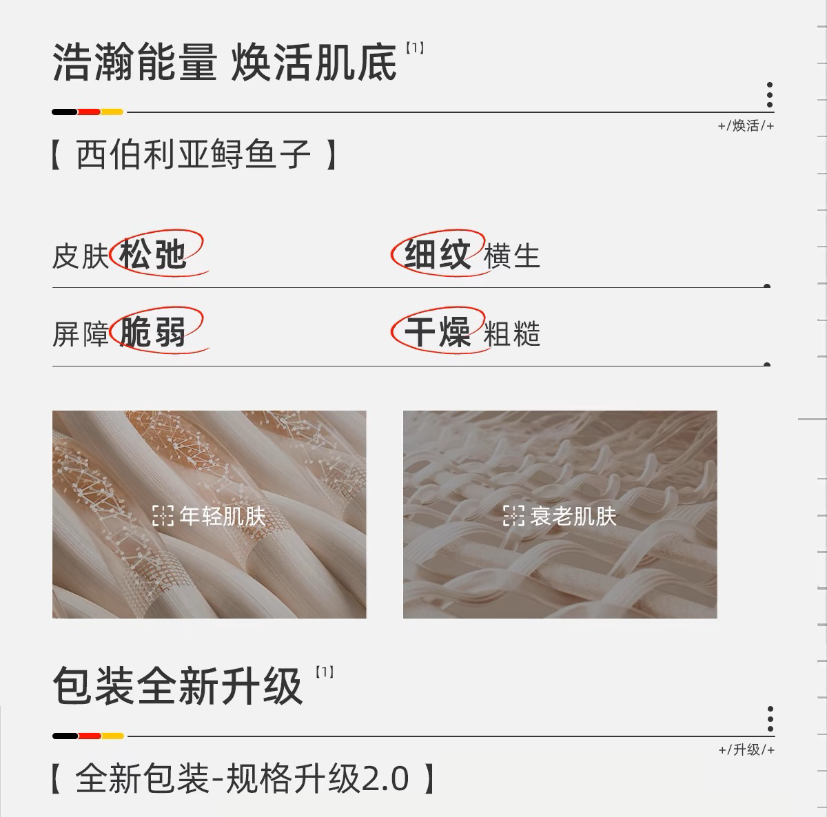 所以鱼子这类产品类似皮肤的十全大补,无论是促进胶原蛋白的合成,刺激细胞再生,修复受损,消除游离基它基本都可以做到。尤其是迈向衰老和早衰的憔悴肌肤,更是它最适合的人群。