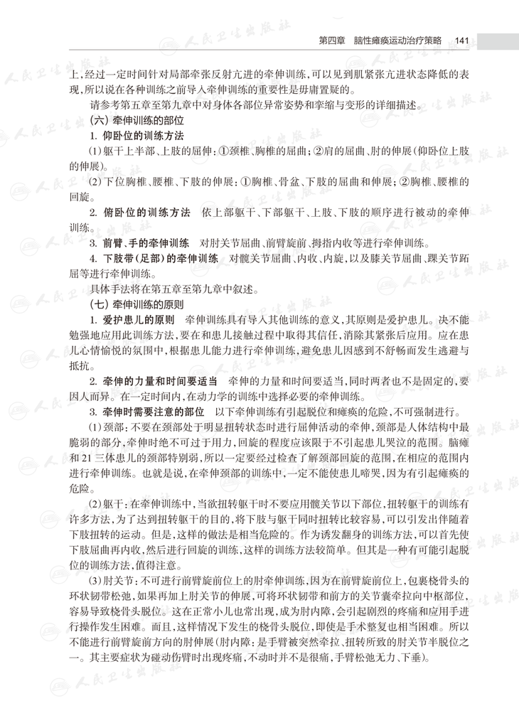 03.图文并茂、看图识病:注重小儿脑性瘫痪实际治疗技术和手法操作的详尽描述,从运动学与解剖学入手,深入了解机体各部分的正常运动、脑性瘫痪的运动障碍特征、导致异常运动和异常姿势的原因,以及如何对其进行康复治疗,并以实际操作的照片为依据,全书800余幅照片,文字配合紧密,读者能够较容易地掌握较为实用的康复训练方法。