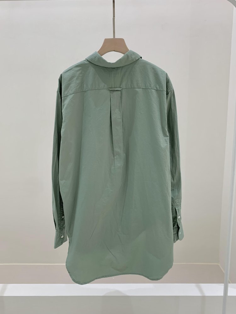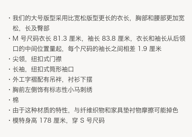 大号版型采用比宽松版型更长的衣长,胸部和腰部更加宽松,长及臀部,尖领,纽扣式门襟,长袖,纽扣式筒形袖口,外工字褶配有吊袢,衬衫下摆胸前左侧饰有标志性小马刺绣。