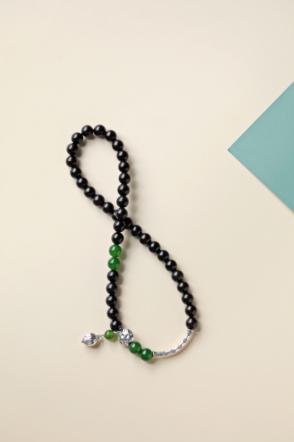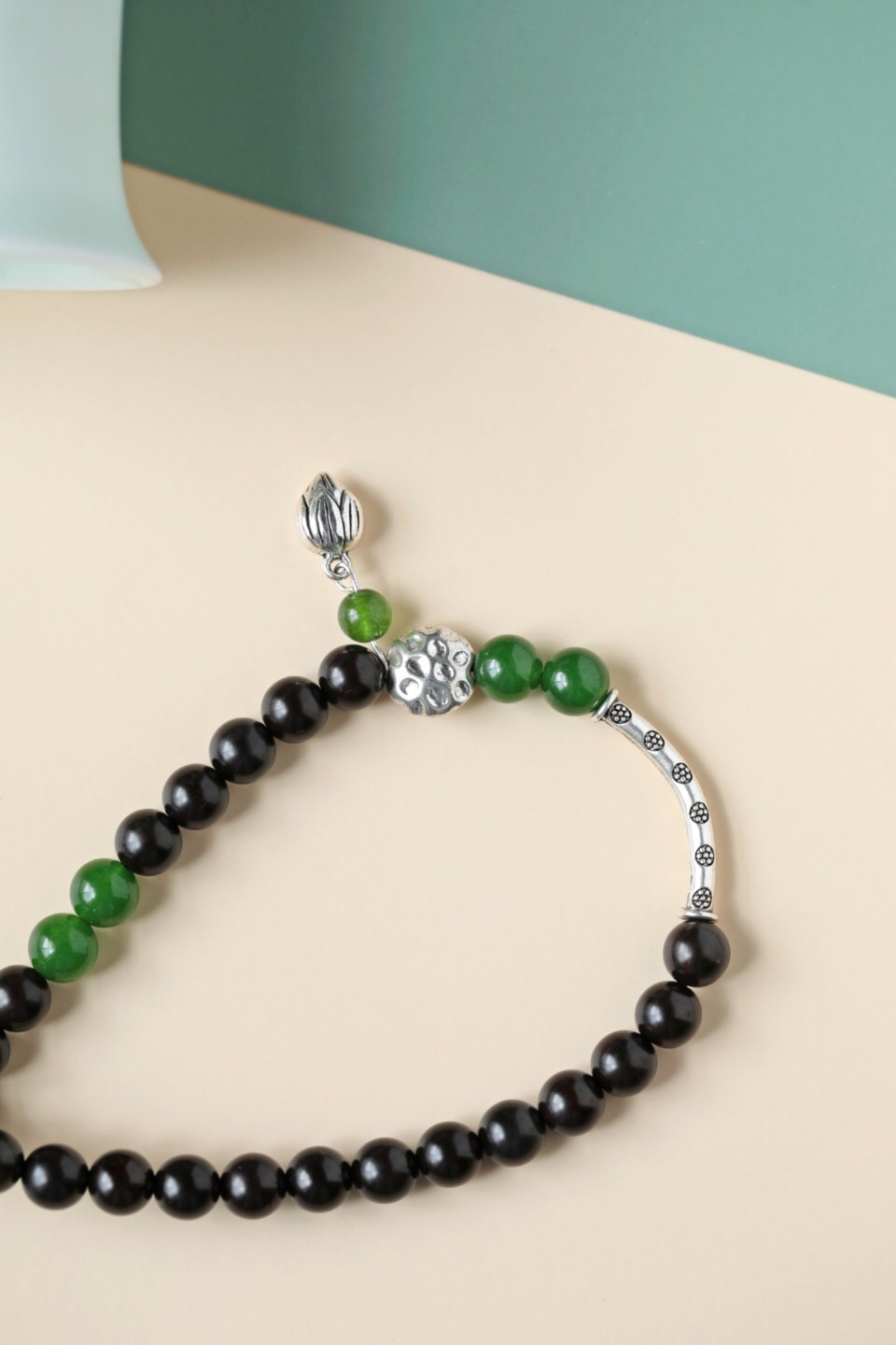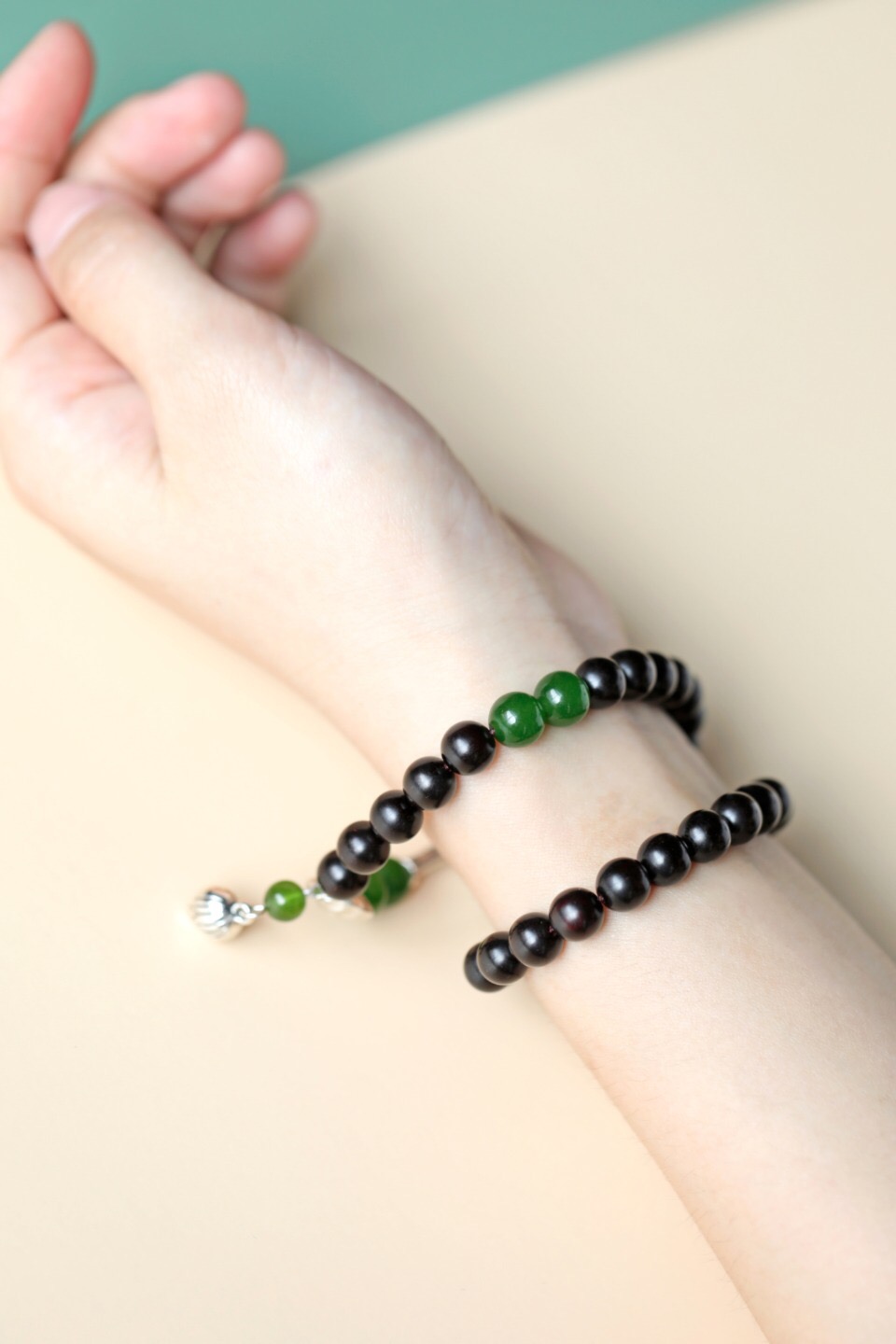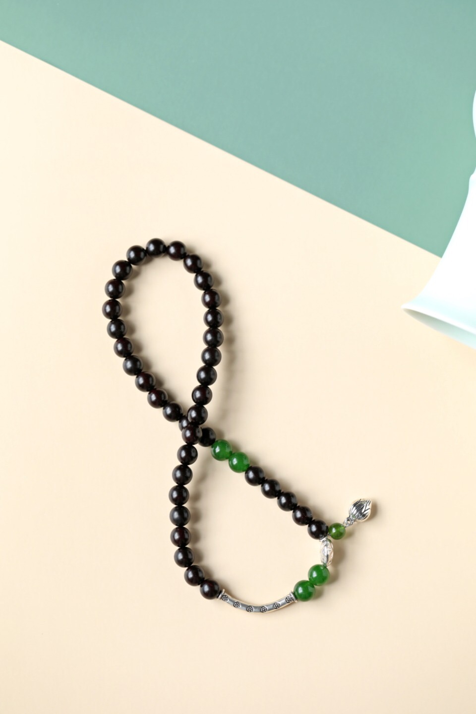 这一款手链小巧精致,简约大气,日常把玩佩戴,送爱人是非常好的。优质的紫檀料,料质细腻,颜色润,油性足,质地很好。搭配银饰珠子以及碧玉,显得更加清新和厚重。搭配过渡自然,颜值很高,显得很有尊贵之感,618送礼很不错!