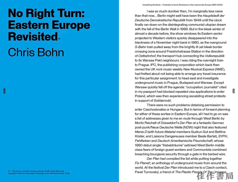 《发掘音乐:1950-2000年非民主欧洲声音抵抗脚注》是一个始于葡萄牙的国际项目的收官之作,该项目建立了一个实验性地下与抗议声音的在线档案馆。其范围既涵盖东欧的“现实社会主义”,也常涉被遗忘的西班牙、葡萄牙政权以及希腊军事独裁时期。本书呈现了这一光谱中的核心议题:与政权的关系、对突破的渴望、反叛社群的力量,以及解放后的幻灭。内容包括波兰与东德的爵士乐、南斯拉夫的概念后朋克、国营电子音乐工作室、“X光唱片”与“磁带地下出版品”、亚文化中的女性角色、罗马尼亚先锋艺术、伊比利亚朋克以及乌克兰地下音乐等。这是一场发现之旅,辅以大量可供深入探究的照片。