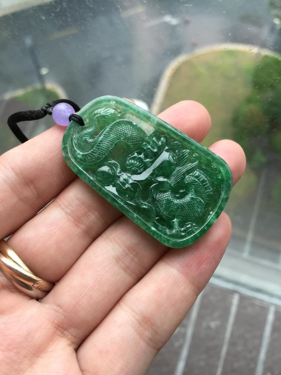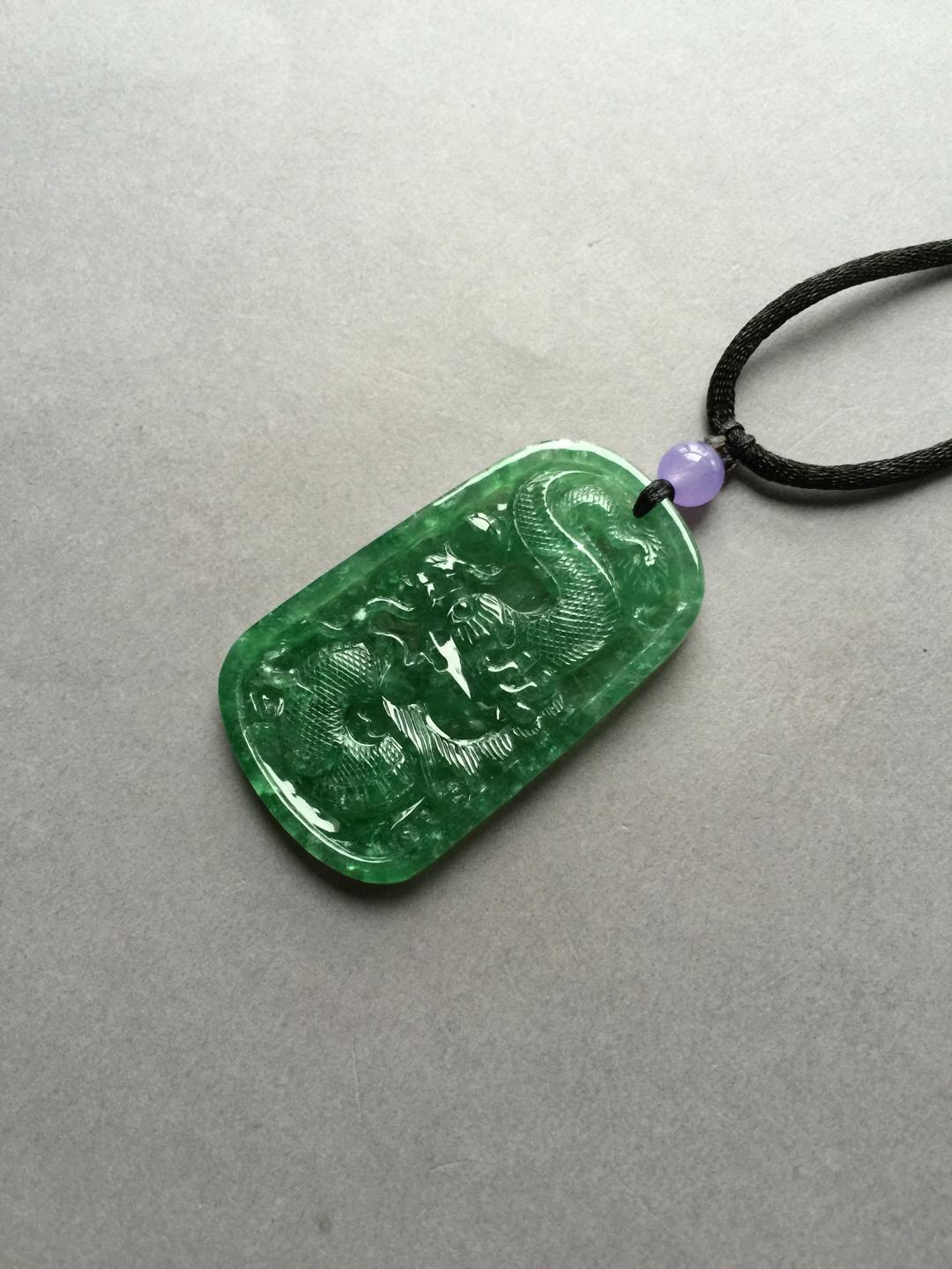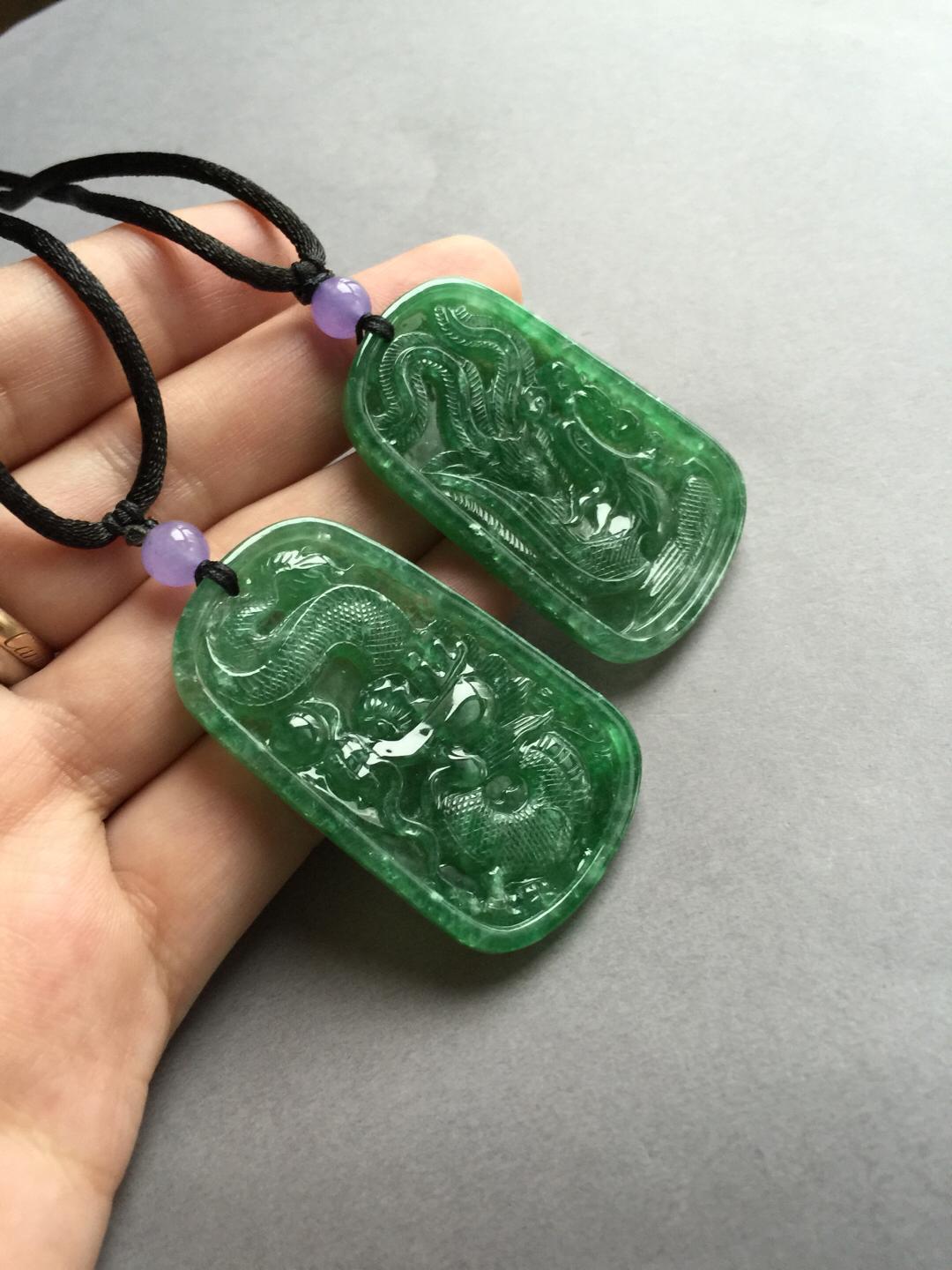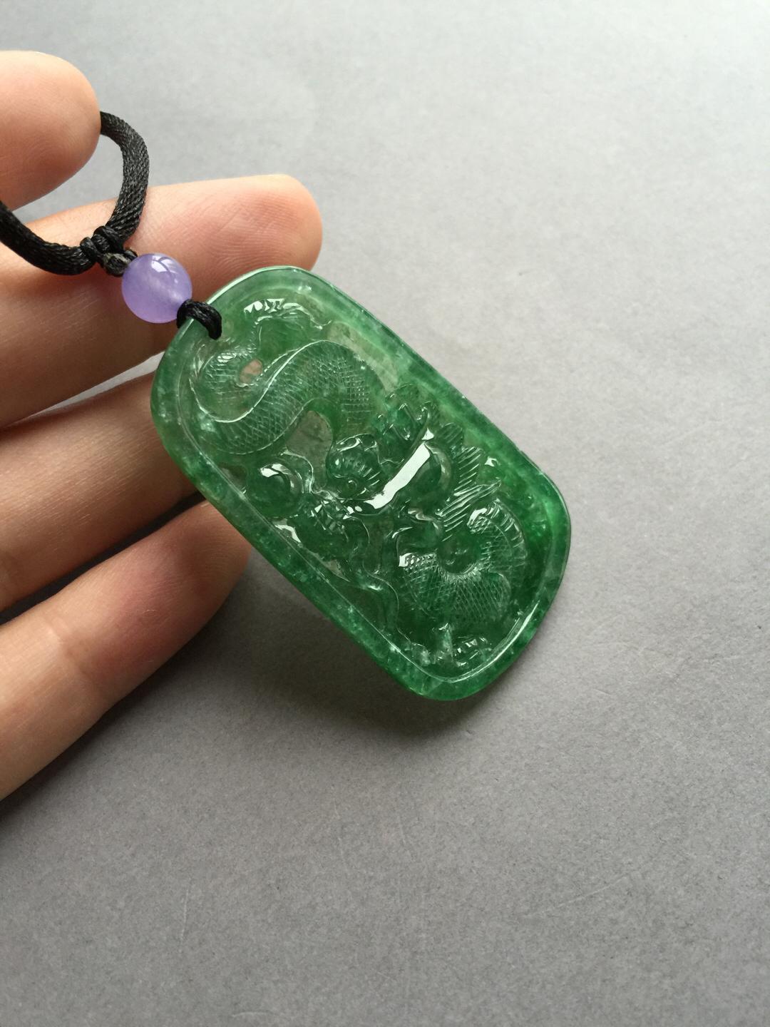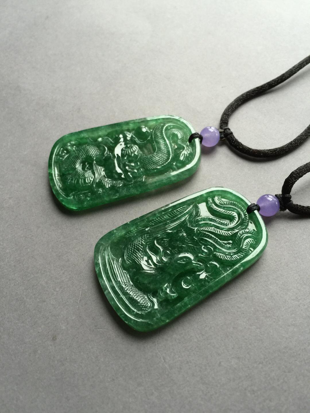 翡翠冰种满绿龙牌,47*29*4.2mm。尺寸大气,绿色艳丽,种水好,起荧光。手工雕刻精致无比,祥龙霸气,助推事业,飞黄腾达。种色俱佳的大件精品,十分难得。更难能可贵的是有一块同料凤牌与之交相辉映,龙凤呈祥,推荐双双收藏。