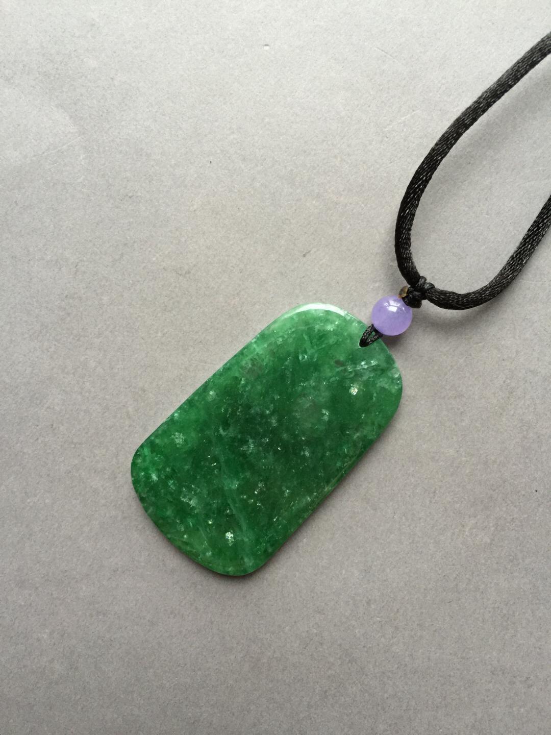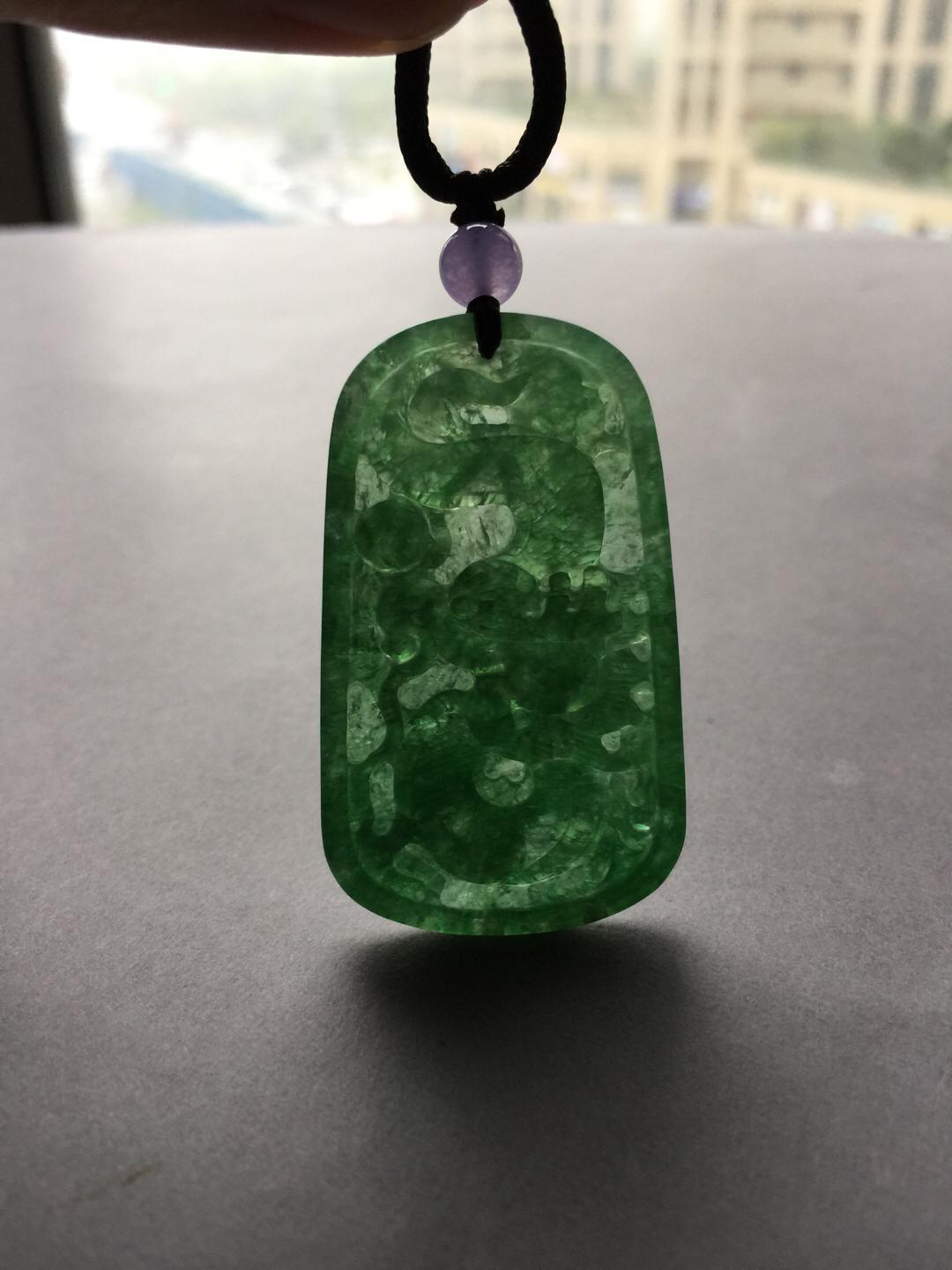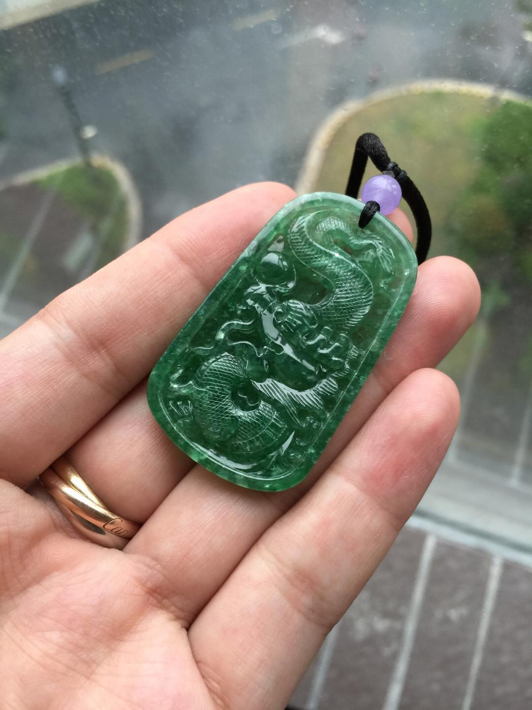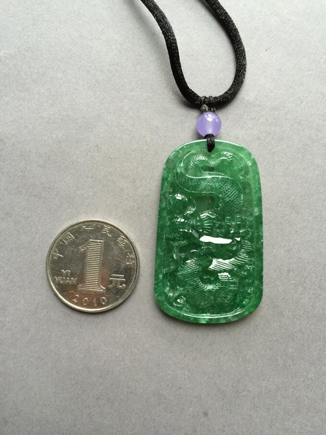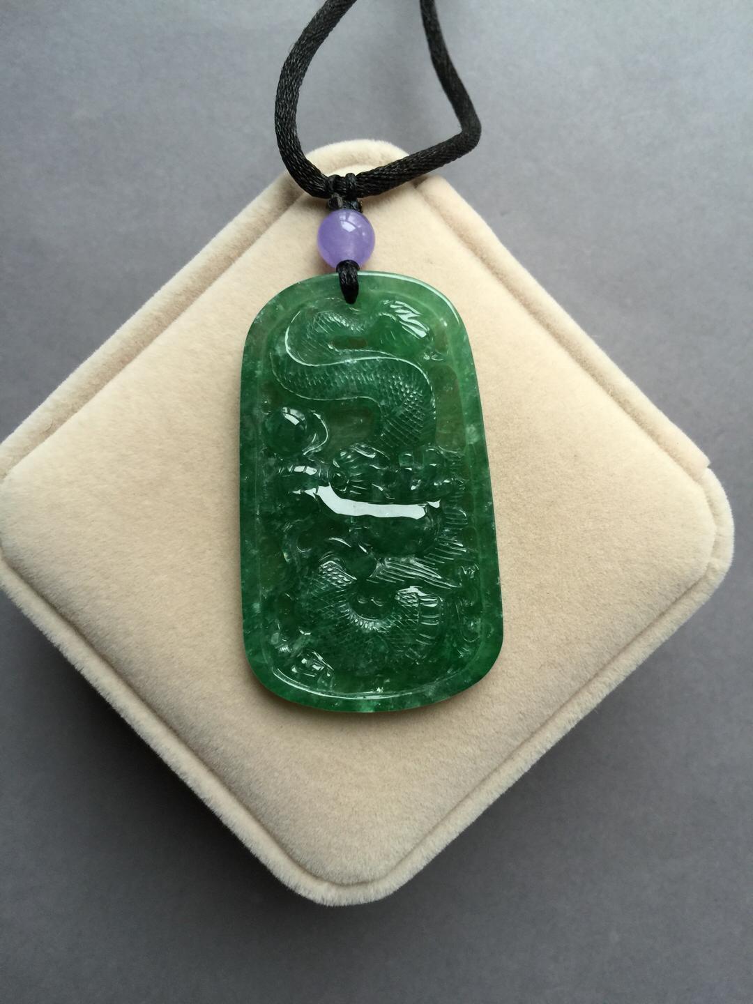 翡翠冰种满绿龙牌,47*29*4.2mm。尺寸大气,绿色艳丽,种水好,起荧光。手工雕刻精致无比,祥龙霸气,助推事业,飞黄腾达。种色俱佳的大件精品,十分难得。更难能可贵的是有一块同料凤牌与之交相辉映,龙凤呈祥,推荐双双收藏。