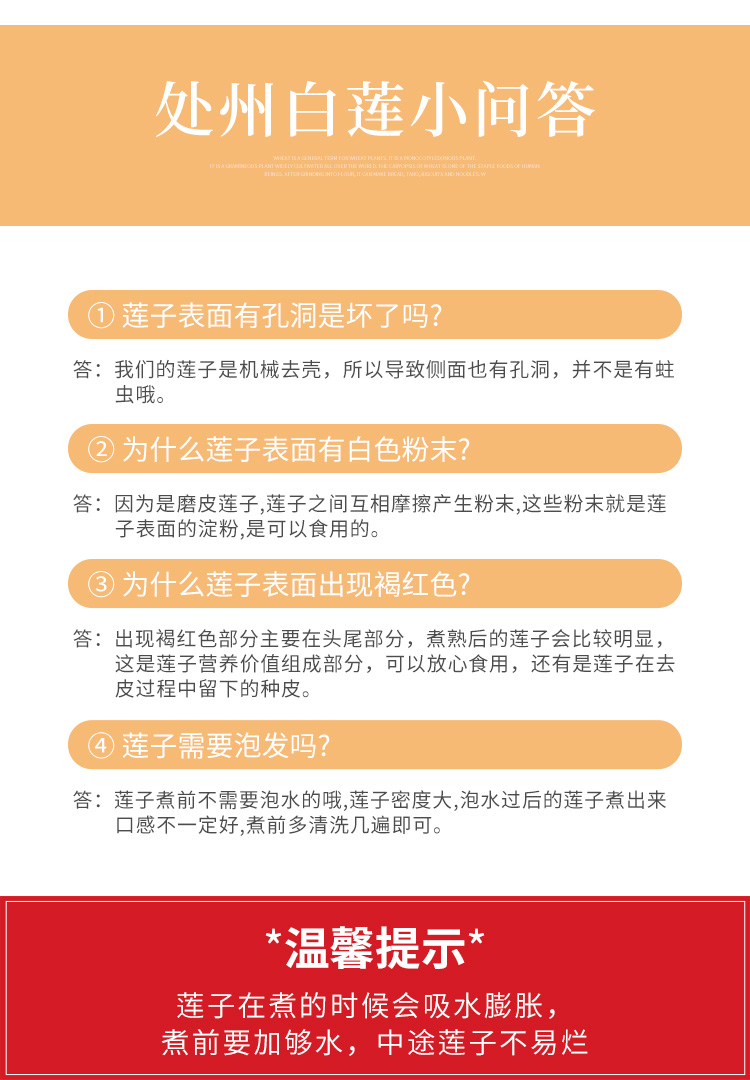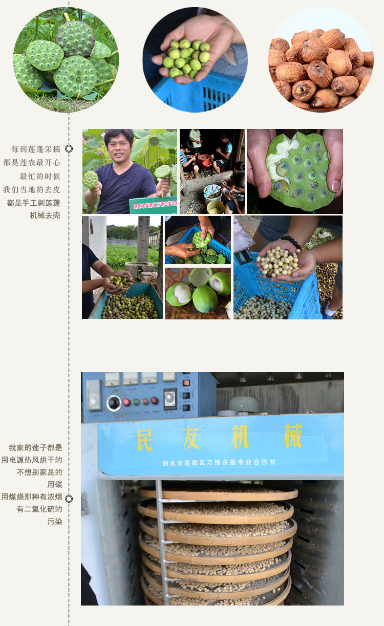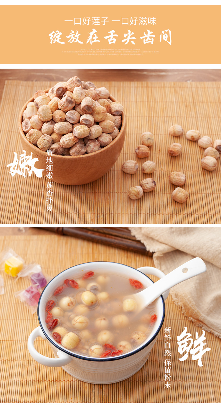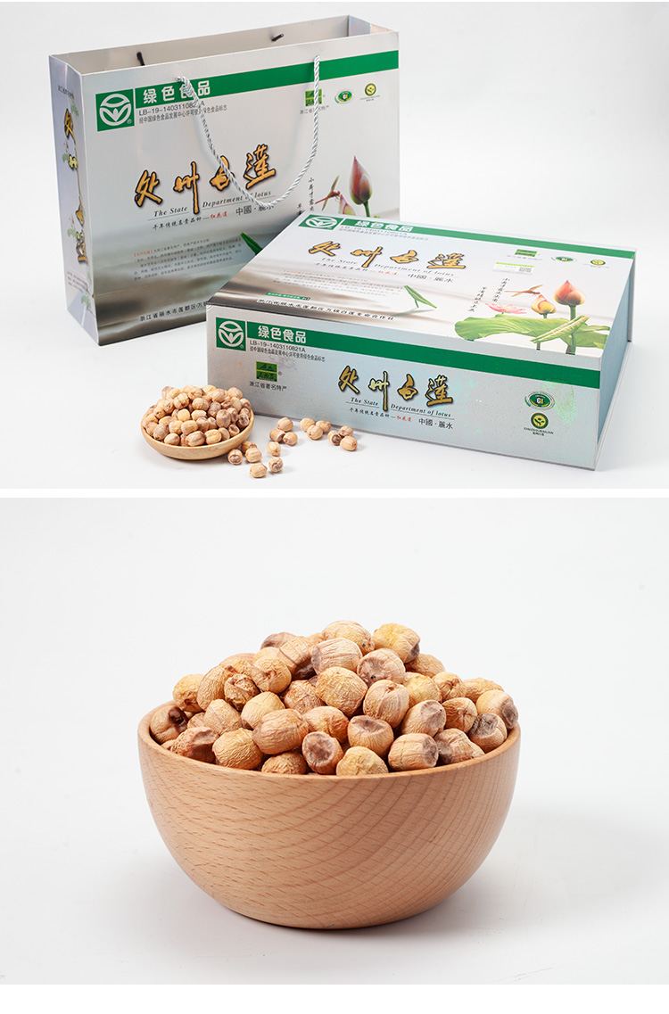 莲子是睡莲科水生草本植物的种子,是卫生部公布的“既是食品又是药品的物品”,民间大都用作高级滋补品。丽水古称处州,1400多年前即已盛产处州白莲,中心产区丽水市莲都区原富岭乡,土壤富含钾钠钙镁等阳离子,所产处州白莲具有“粒大而圆、色白、饱满、肉绵、味甘”五大特点,且处州白莲保留莲衣莲蕊,营养更全面丰富。