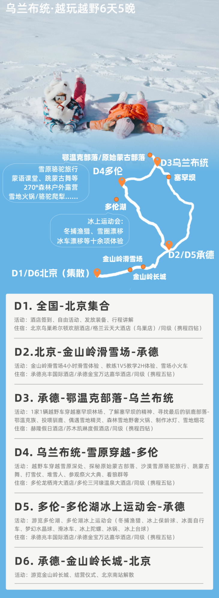 用餐:D2-D6早餐、D2晚餐、D3午餐-乌兰布统特色餐、D3晚餐-雪地火锅、D4午餐、D5午餐,D6结营午餐。