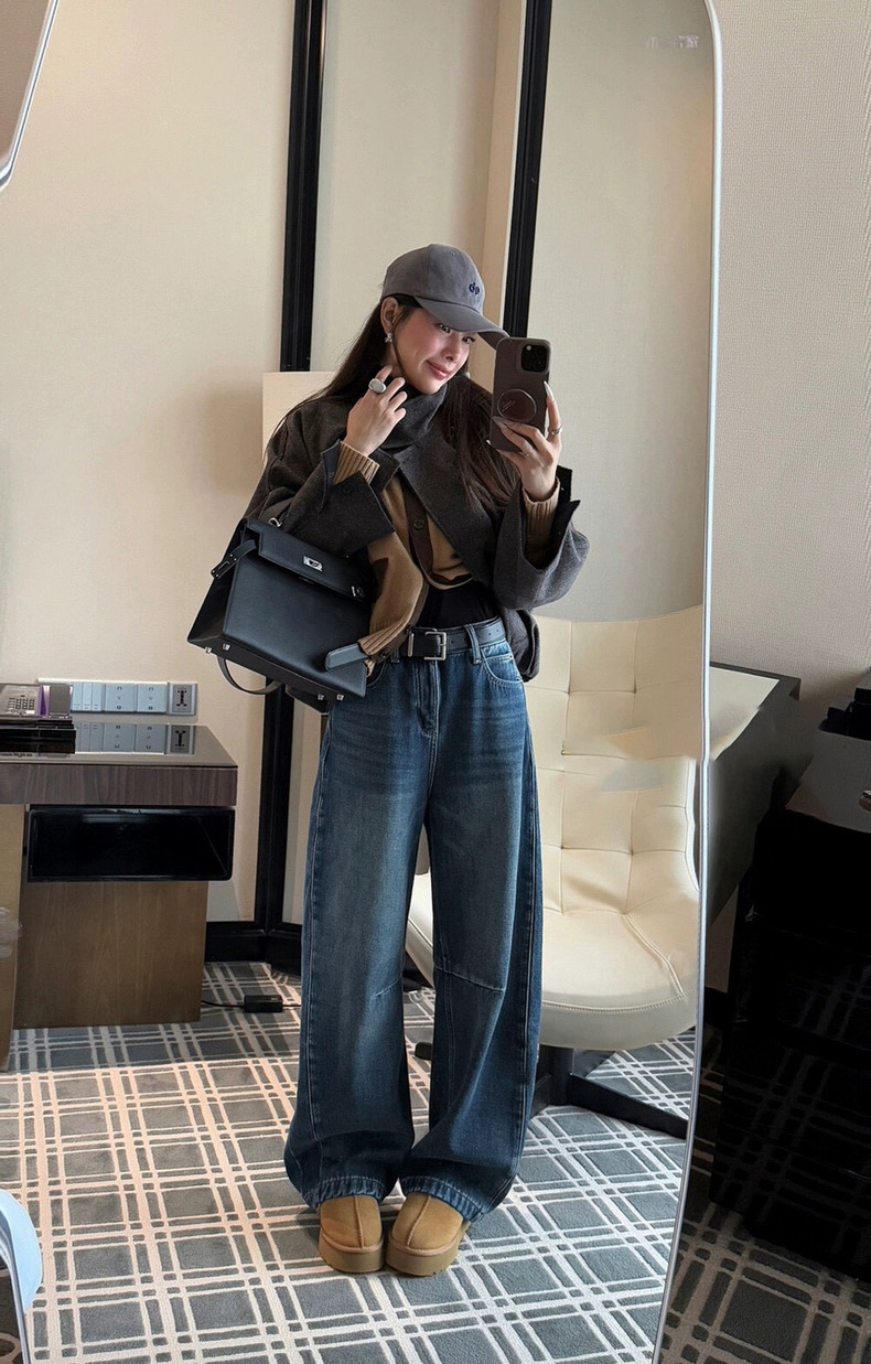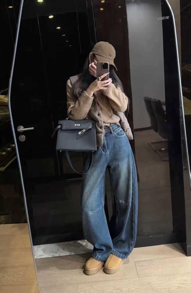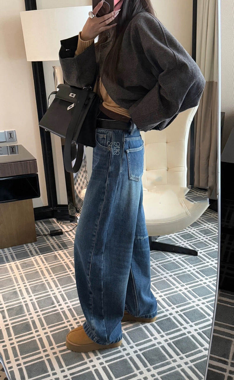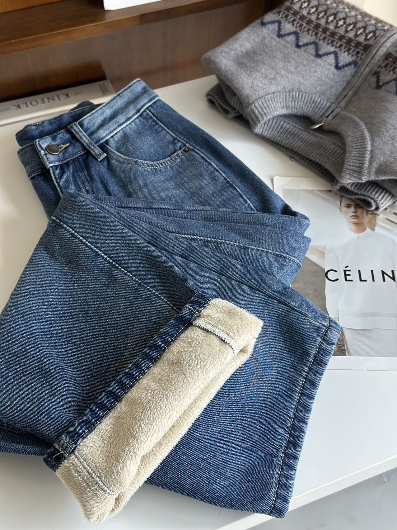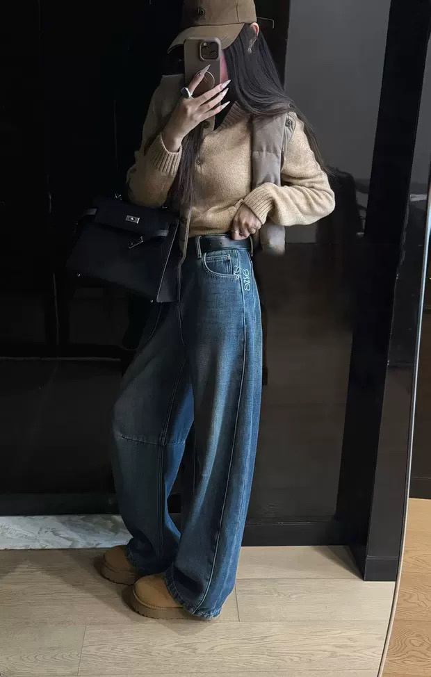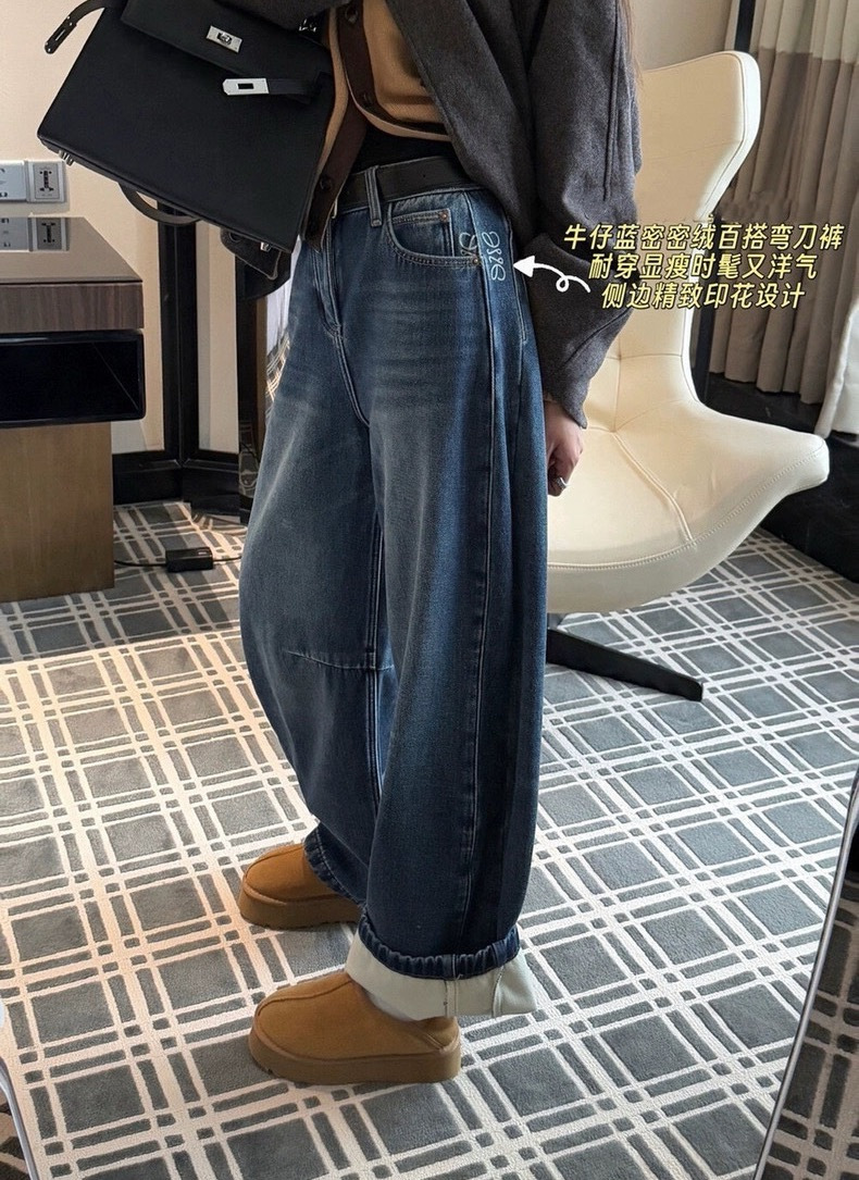 依旧保持着弯刀裤的利落线条,这也是它区别于普通加绒牛仔裤的关键。